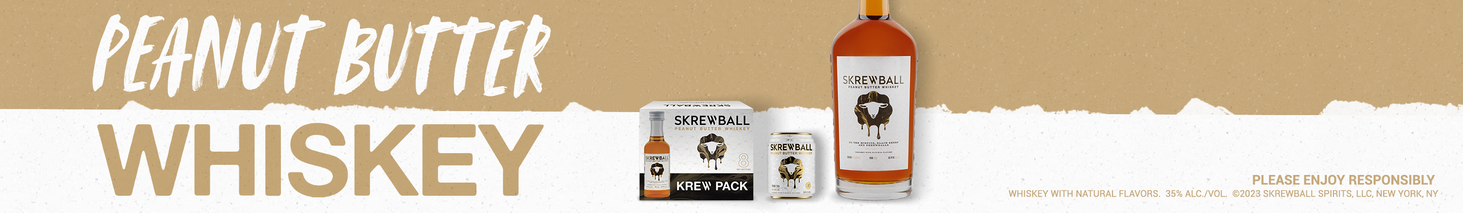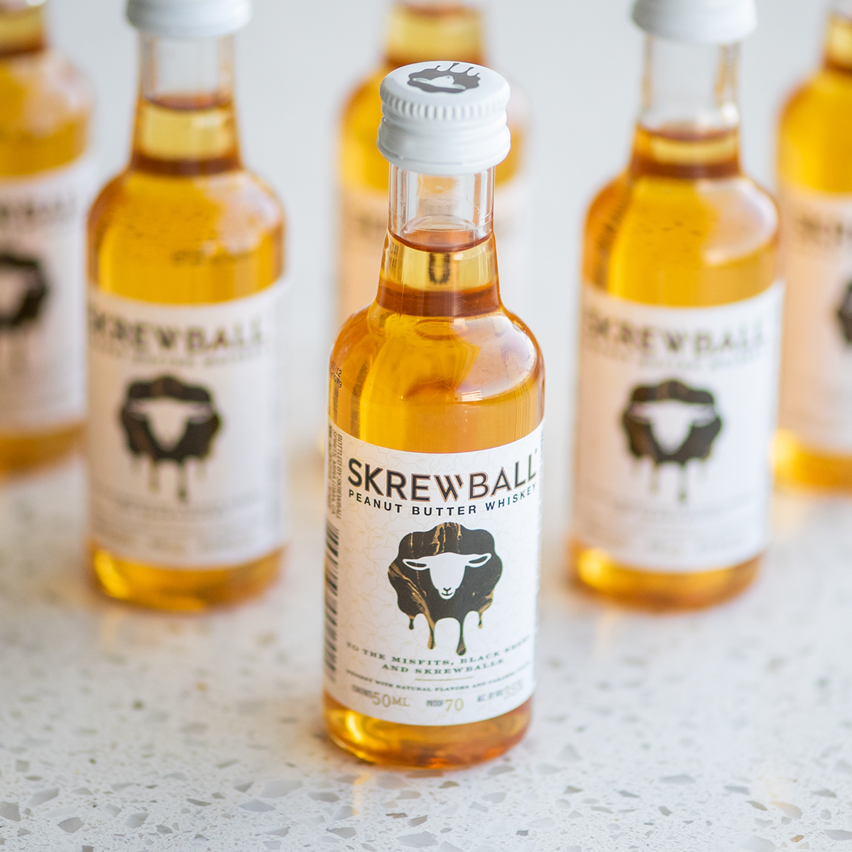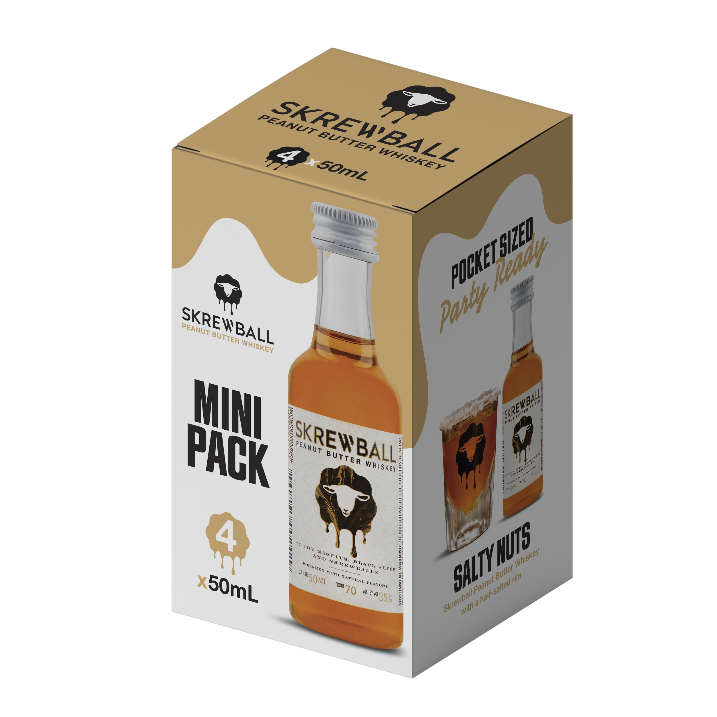Product Title - Full (Computed) Skrewball Peanut Butter Flavored Whiskey With Natural Flavors, 4 Pack, 50 ml Bottles, 70 Proof SKU Name SB PBW 120/50 30X4PK PT US Marketing Brand (Computed) Skrewball Sub-Brand SKREWBALL WHISKEY SKU 87500010 UPC 860265002429 GTIN 10080432002503 Package UPC 080432002506 Country Of Origin United States CATEGORY DOMESTIC WHISKEY Manufacturer Pernod Ricard Short Description Skrewball embodies the bold flavors of smooth whiskey and creamy peanut butter. It was a bold choice, but Skrewball’s mix of sweet & savory flavors is exactly what makes it uniquely appropriate for any occasion, and pleasantly satisfying for even the most skeptic of your krew. Long Description Skrewball Peanut Butter Whiskey embodies both smooth whiskey and creamy peanut butter flavors simultaneously. This flavored whiskey offers an original and unique flavor profile, a delicious and harmonious blend of sweet, salty, savory, and smooth that is unlike anything you've ever tasted before. Founded in 2018 in San Diego, CA, by husband-and-wife duo Steven and Brittany Yeng, Skrewball emerged when co-founder Steve, newly arrived from Cambodia, discovered the fascinating flavor of peanut butter, leading to the creation of a renowned peanut butter whiskey cocktail. He joined forces with his wife Brittany, a skilled chemist, to create the award-winning Skrewball recipe. Crafted with both bartenders and drinkers in mind, this peanut butter whiskey is a standalone spirit that tastes great on its own and plays well in alcoholic drinks and cocktails like a Peanut Butter Old Fashioned, Nutty Russian, or Skrewball Mudslide. Enjoy Responsibly. Feature Bullet 1 THE ORIGINAL: Peanut butter whiskey made with a quality-first approach; embodying both smooth whiskey and creamy peanut butter flavors Feature Bullet 2 INCLUDES: Four 50 mL bottle of Skrewball Peanut Butter Whiskey with Natural Flavors; 70 proof or 35% alcohol by volume; Enjoy responsibly Feature Bullet 3 Consumption Tip: Enjoy this liquor as a shot, neat, over ice, or in cocktails like a Peanut Butter Old Fashioned, Nutty Russian, or Skrewball Mudslide Feature Bullet 4 FLAVOR & NOTES: A unique and original flavor profile: a mix of sweet, salty, savory, and smooth that defies expectations of whiskeys Feature Bullet 5 CONTAINS PEANUTS: Whiskey with Natural Flavors Feature Bullet 6 AWARD-WINNING WHISKEY: Skrewball Peanut Butter Whiskey won double gold at the 2021 Sip Awards Feature Bullet 7 WE ARE THE SKREWBALLS: Skrewball is a perfect celebration of the unexpected, wild and wonderful in all of us Net Content (Computed) 50 ml Bottle Length 1.25 Bottle Width 1.25 Bottle Height 4 Bottles Per Case 120 Case Length 16.63 Case Width 13.88 Case Height 4.56 Case Weight 22 Proof 70