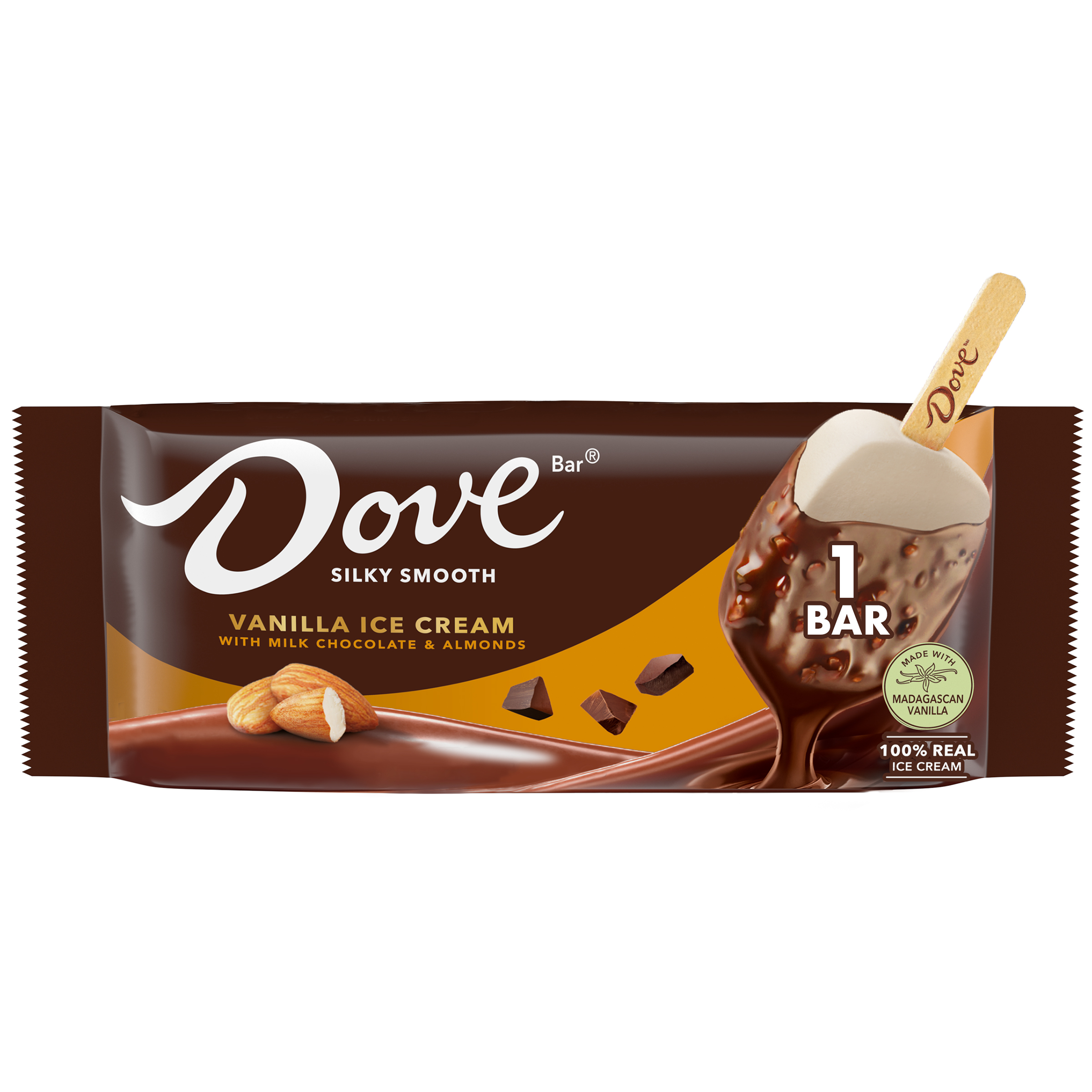 | Generic Bullet 1 | Contains one (1) DOVE Vanilla Ice Cream Bar with Milk Chocolate and Almonds Coating |