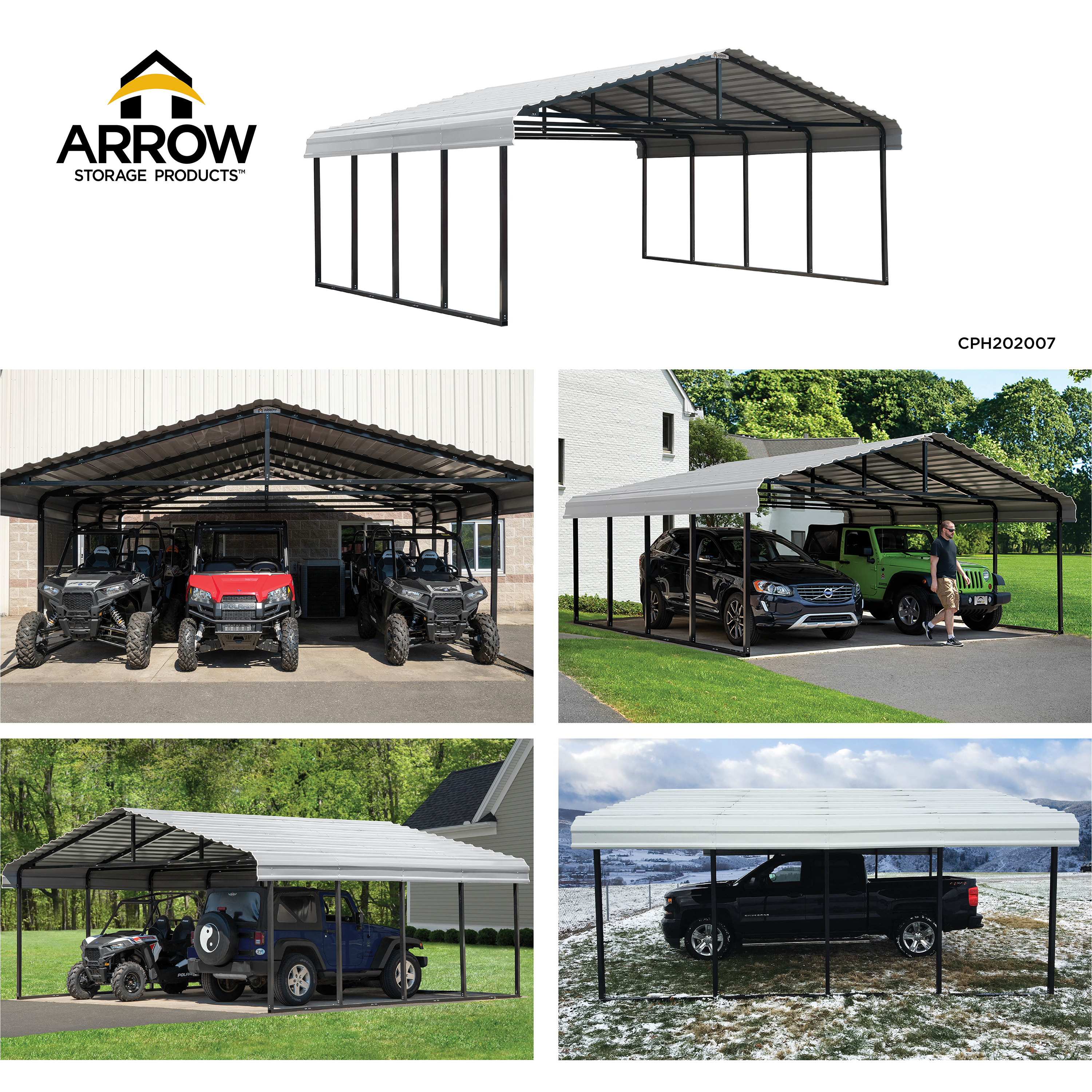 PART ID CPH202007 BRAND Arrow UPC 026862112231 GTIN 00026862112231 DISPLAY NAME - RETAIL Galvanized Steel Carport, 20X20X7 LONG DESCRIPTION Built strong, wind and snow rated, and backed by a 10-year limited warranty is the 20 x 20 ft. Eggshell Arrow Carport. This galvanized steel carport from Arrow Storage Products features a powder coated steel frame for corrosion and rust resistance. The tough made galvanized steel roof is made strong. Perfect for use as a carport, shelter, shade and storage for boats, vehicles, tractors and even as an outdoor picnic area. BULLET 1 Built strong with a 2x3 in. 15 gauge wall thickness. The Arrow Carport delivers wind and snow load strength and stability BULLET 2 An all-weather carport that will protect your vehicle or outdoor space all-year long: the Arrow Carport is built to take on even tough weather - winds up to 100 mph, and a snow load of 35 PSF BULLET 3 A heavy-duty, galvanized steel roof that's built to last - features a 29-gauge painted galvanized steel for corrosion resistance BULLET 4 Roof in an attractive eggshell finish, with a black powder coated steel frame BULLET 5 Perfect for car storage and shelter, truck shelter, vehicle shelter, boat shelter or as a multi-use shade and picnic area BULLET 6 ASSEMBLY MADE EASY FOR THE DIYer- The Arrow carport is designed for easy assembly and installation with slip-fit connections and self-taping screws for long lasting protection BULLET 7 Comes with a 10 year warranty BULLET 8 Disclaimer- Wind and snow loads given are for reference only and assume a standalone unit without enclosure kit, and a securely anchored frame according to local building codes and ordinances. These loads have been calculated useing combined snow and wind load provisions in accordance with ASCE 7-05. These calculations are based on an unoccupied structure. Local building code requirements vary by location; conformance to local codes is the responsibility of the purchaser BULLET 9 This Unit Contains 6 Packages - You will receive 4 Frame Cartons 2 Roof Panel Cartons CPAI-84 COMPLIANT (Y/N) No COUNTRY OF ORIGIN USA H.S. TARIFF # U.S. 7308.90.9590 NMFC # 38470 CALCULATED NMFC 38470 FREIGHT CLASS 65 DUTY % U.S. 0 NUMBER OF CUP HOLDERS 0 FOLDABLE (Y/N) No COLOR Eggshell COVER COLOR N/A DOOR COLOR N/A DOOR JAMB COLOR N/A FRAME COLOR Black GABLE COLOR N/A ROOF COLOR N/A ROOF TRIM COLOR N/A TRACK COLOR N/A WALL COLOR N/A FRAME MATERIAL Steel VALANCE HEIGHT (IN) 73.10 BUILDING SHAPE Peak SHAPE OF TUBE Rectangle NUMBER OF AWNINGS 0 ROOF PITCH - LOWER 0.00 ROOF PITCH - UPPER 3.00 FOUNDATION WIDTH (IN) 255.00 FOUNDATION LENGTH (IN) 230.00 DOOR TYPE N/A DOOR / ENTRANCE HEIGHT (IN) CENTER ZIPPER 118.00 DOOR / ENTRANCE WIDTH BOTTOM (IN) OUTSIDE ZIPPERS 243.00 DOOR / ENTRANCE HEIGHT (IN) OUTSIDE ZIPPERS 118.00 DOOR OPENING WIDTH TOP (IN) OUTSIDE ZIPPERS 237 GABLE HEIGHT (IN) 38.20 WALL HEIGHT (IN) 79.90 ASSEMBLED EXTERIOR DIMENSIONS DEPTH (IN) 217.10 ASSEMBLED EXTERIOR DIMENSIONS HEIGHT (IN) 118.10 ASSEMBLED EXTERIOR DIMENSIONS WIDTH (IN) 242.70 TOTAL STORAGE VOLUME (CU. FT.) 2969.15 TOTAL STORAGE AREA (SQ/FT) 365.90 WHAT'S IN THE BOX Roof Panels, Frame, Anchors, Hardware, Instructions STORAGE BAG INCLUDED (Y/N) No WATER-RESISTANT (Y/N) No WATERPROOF (Y/N) Yes ASSEMBLY REQUIRED (Y/N) Yes # OF PEOPLE FOR ASSEMBLY 2 ITEM NET WEIGHT - WITHOUT PACKAGING / ASSEMBLED (LBS.) 1066.00 NOMINAL ASSEMBLED HEIGHT FT. 7 NOMINAL ASSEMBLED LENGTH FT. 20 NOMINAL ASSEMBLED WIDTH FT. 20 NOMINAL CONC IMPERIAL 20 x 20 x 7 ft RIB TUBING DIAMETER EDGE TO EDGE (IN) 2.76 RELATED ACCESSORIES #1 ECL2009EGX1 RELATED ACCESSORIES #2 ECL2009EGX2 RELATED ACCESSORIES #3 10075 SHIP METHOD (PARCEL OR LTL) LTL HEIGHT AS SHIPPED (INCLUDING PALLET IF APPLICABLE)(IN) 36.03 LENGTH AS SHIPPED (INCLUDING PALLET IF APPLICABLE)(IN) 76.58 WIDTH AS SHIPPED (INCLUDING PALLET IF APPLICABLE)(IN) 30.25 WEIGHT AS SHIPPED (INCLUDING PALLET IF APPLICABLE)(LBS) 1159.91 CU FT AS SHIPPED (INCLUDING PALLET IF APPLICABLE)(IN) CALCULATED 48.3 ITEM GROSS WEIGHT (PACKAGING INCLUDED) (LBS.) 1116 # OF BOXES 6 CARTON 1 GROSS WEIGHT (LBS) 171.00 CARTON 1 HEIGHT (IN) 5.50 CARTON 1 LENGTH (IN) 76.58 CARTON 1 WIDTH (IN) 22.25 CARTON 2 GROSS WEIGHT (LBS) 159.00 CARTON 2 HEIGHT (IN) 5.12 CARTON 2 LENGTH (IN) 76.58 CARTON 2 WIDTH (IN) 22.25 CARTON 3 GROSS WEIGHT (LBS) 205.00 CARTON 3 HEIGHT (IN) 7.10 CARTON 3 LENGTH (IN) 76.58 CARTON 3 WIDTH (IN) 22.25 CARTON 4 GROSS WEIGHT (LBS) 229.00 CARTON 4 HEIGHT (IN) 7.10 CARTON 4 LENGTH (IN) 76.58 CARTON 4 WIDTH (IN) 22.25 CARTON 5 GROSS WEIGHT (LBS) 176.00 CARTON 5 HEIGHT (IN) 3.25 CARTON 5 LENGTH (IN) 70.75 CARTON 5 WIDTH (IN) 30.50 CARTON 6 GROSS WEIGHT (LBS) 176.00 CARTON 6 HEIGHT (IN) 3.25 CARTON 6 LENGTH (IN) 70.75 CARTON 6 WIDTH (IN) 30.50 NUMBER OF PALLETS 1 PALLET 1 HEIGHT (FLOOR TO TOP) FULL PALLET CONFIGURATION (IN) ( DS LTL ONLY OUT OF WHSE) 36.03 PALLET 1 LENGTH (LONGEST SIDE) FULL PALLET CONFIGURATION (IN) ( DS LTL ONLY OUT OF WHSE) 76.58 PALLET 1 TOTAL WEIGHT FULL PALLET CONFIGURATION (LBS) ( DS LTL ONLY OUT OF WHSE) 1159.91 PALLET 1 WIDTH (FRONT TO BACK) FULL PALLET CONFIGURATION (IN) ( DS LTL ONLY OUT OF WHSE) 30.25 QTY PER PALLET 1 # OF PIECES PER PALLET 1 UNITS PER 20' CONTAINER 7 UNITS PER 40' CONTAINER 15 UNITS PER 40' HCUBE CONTAINER 15 UNITS PER 48' TRAILER 22 TRAILER QTY 53' 22 LOADING TYPE (FLOOR, SLIP OR PALLET) PALLET