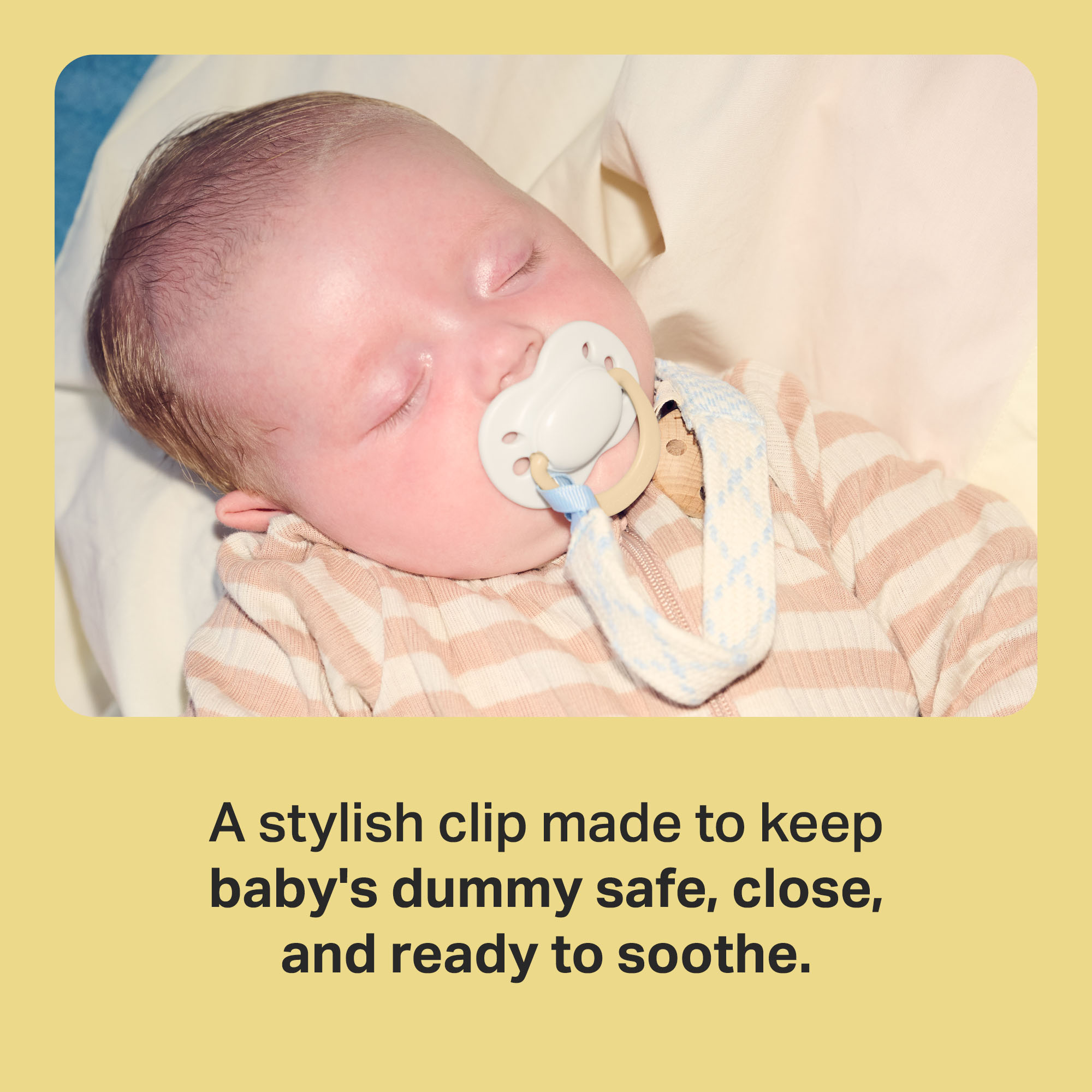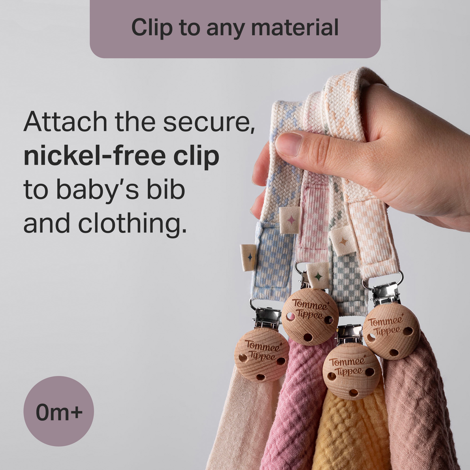 - Secure clip: The natural beech wood and nickel-free stainless steel clip simply attaches to baby's clothes or bib to keep their soother within reach