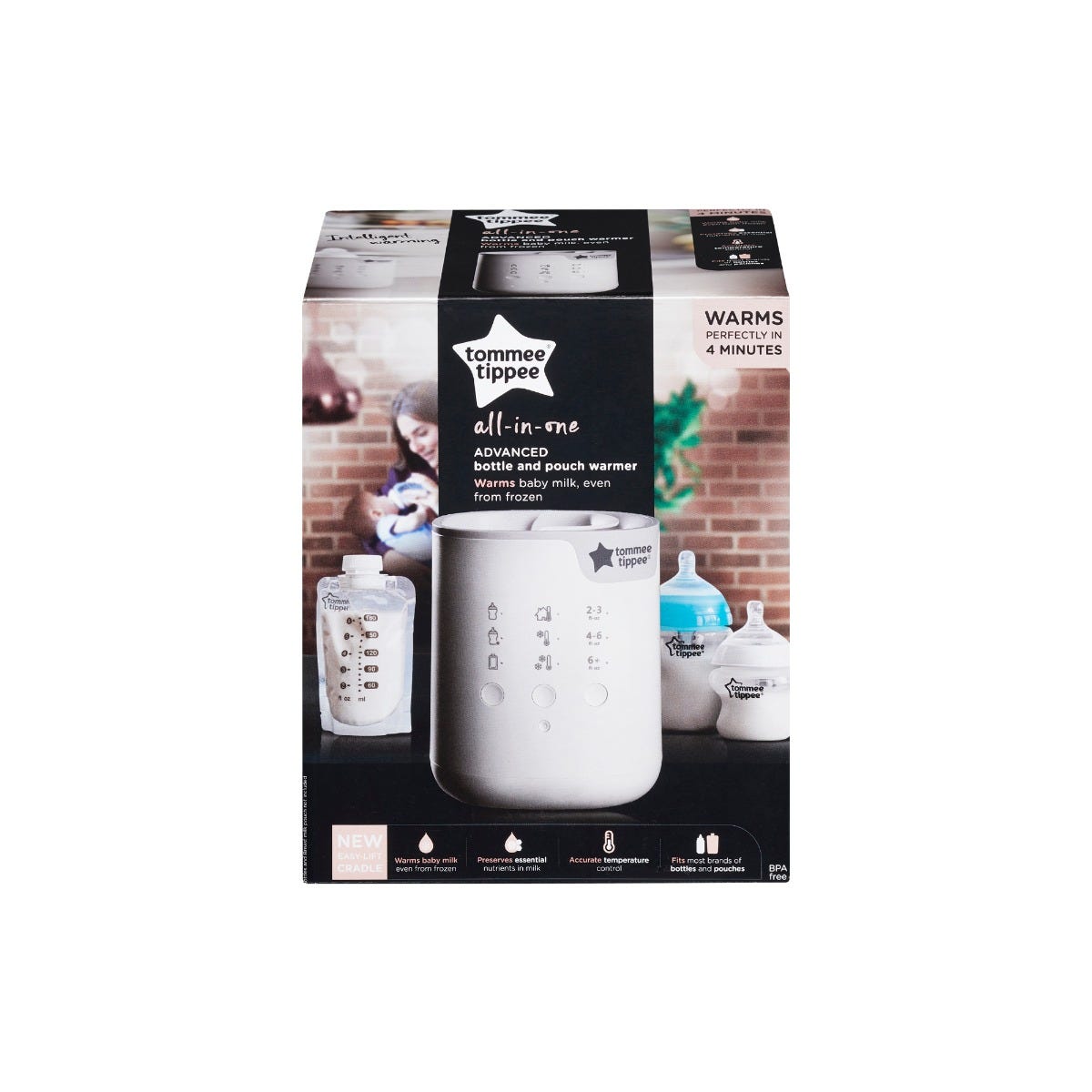 SKU 423224 Description TT POUCH & BOTTLE WARMER WHITE Colour White Need State Infant Feeding Other Category Electricals Sub-Category Electricals Product Range Warming Product Title Tommee Tippee All-in-One Advanced Electric Bottle and Food Pouch Warmer, Warms Baby Feeds to Body Temperature in Minutes, Automatic Timer, White Long Product Description It’s not surprising that babies prefer their feeds at body temperature because that’s what feels most natural to them. The Tommee Tippee All-in-One Advanced Electric Bottle and Food Pouch Warmer allows you to warm your baby’s feed to the perfect temperature in as little as 4 minutes*. Equipped with multiple settings, you can warm various feeds based on the type of container, starting temperature and volume, helping you Parent On. Compatible with a wide range of branded baby bottles, food jars and pouches, you can warm your baby’s feeds from birth and throughout their weaning journey. The Advanced All-in-One warmer even allows you to warm baby milk and food from frozen – just be sure to select the correct settings. Based on your selection, the warmer will automatically work out the optimum warming time. Gradual, gentle warming helps to preserve the goodness and vital nutrients in your baby’s feed and gets it to a comfortable body temperature that feels natural to baby. It also helps to prevent hot spots that could burn your baby’s mouth. Once the warm is complete, remove the bottle or food jar by lifting the cradle and avoid touching the water inside. *Warming times depend upon capacity and starting temperature of feed. Warming time of 4 minutes is based on heating a 150ml serving of milk from ambient room temperature (20°C). Box Contains 1x All in One Bottle and Pouch Warmer Key Features Warms feeds fast: Warms baby milk and food jars or pouches in as little as 4 minutes using steam*. Option to heat from room temperature, cold or frozen by selecting the correct setting Automatic timer: Automatically works out optimum warming time based on the settings you choose and has an auto shut-off setting for added safety Gentle warming: Gradual, gentle warming helps to preserve the goodness and vital nutrients in your baby’s feed and gets it to a comfortable body temperature that feels natural to baby Convenient: The Advanced All-in-One warmer is spacious enough to fits most brands of bottles and food jars, yet still compact enough to sit neatly on your kitchen counter Takes the chill off: Warms breast milk, formula and baby food to body temperature without overheating, so your baby has a comfortable and natural feeding experience Key Features Split - Warms feeds fast: Warms baby milk and food jars or pouches in as little as 4 minutes using steam*. Option to heat from room temperature, cold or frozen by selecting the correct setting
