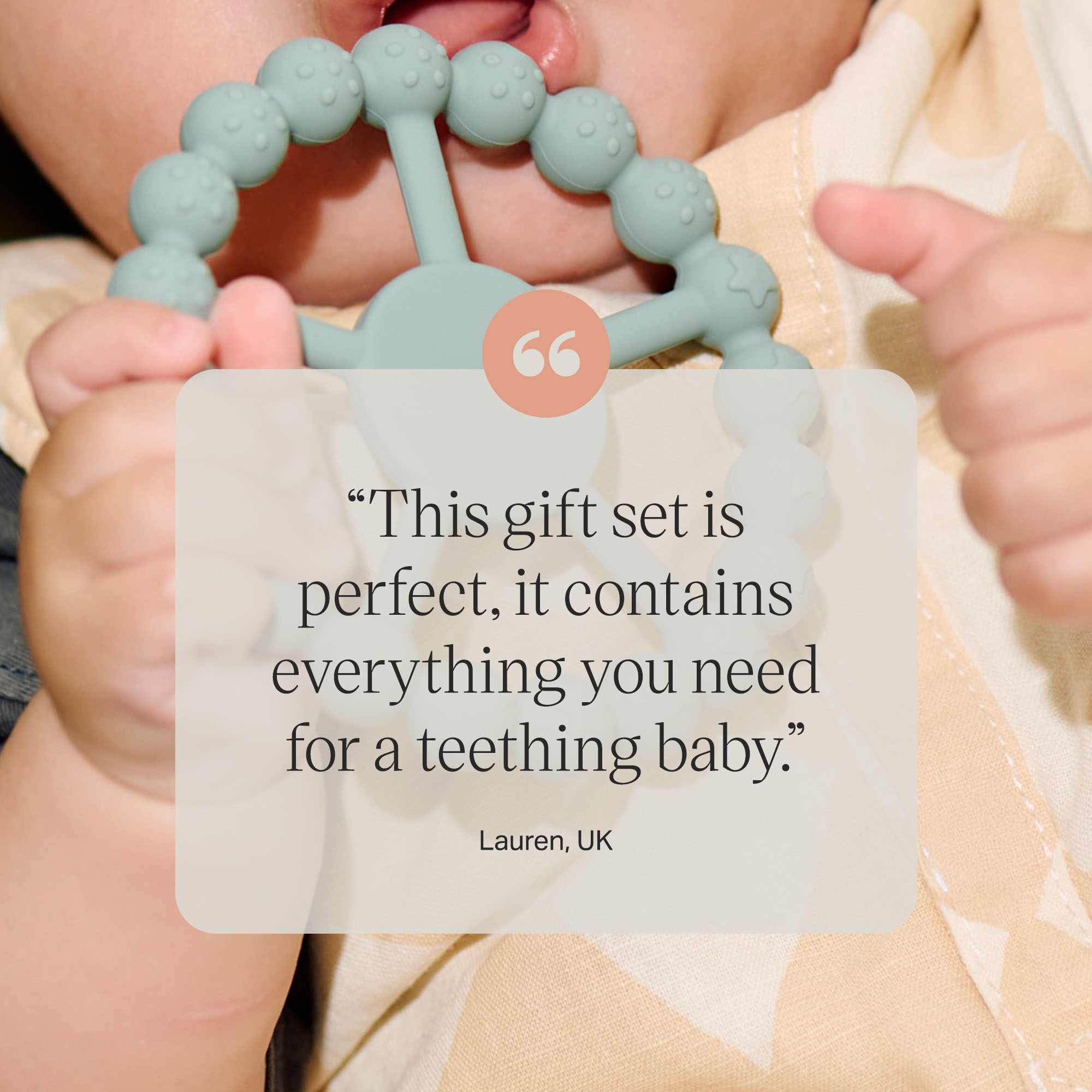 - Round silicone teething ring: Specially designed teether to gently massage sore gums and teeth, with a varied texture to help stimulate baby's sensory development from 3 months