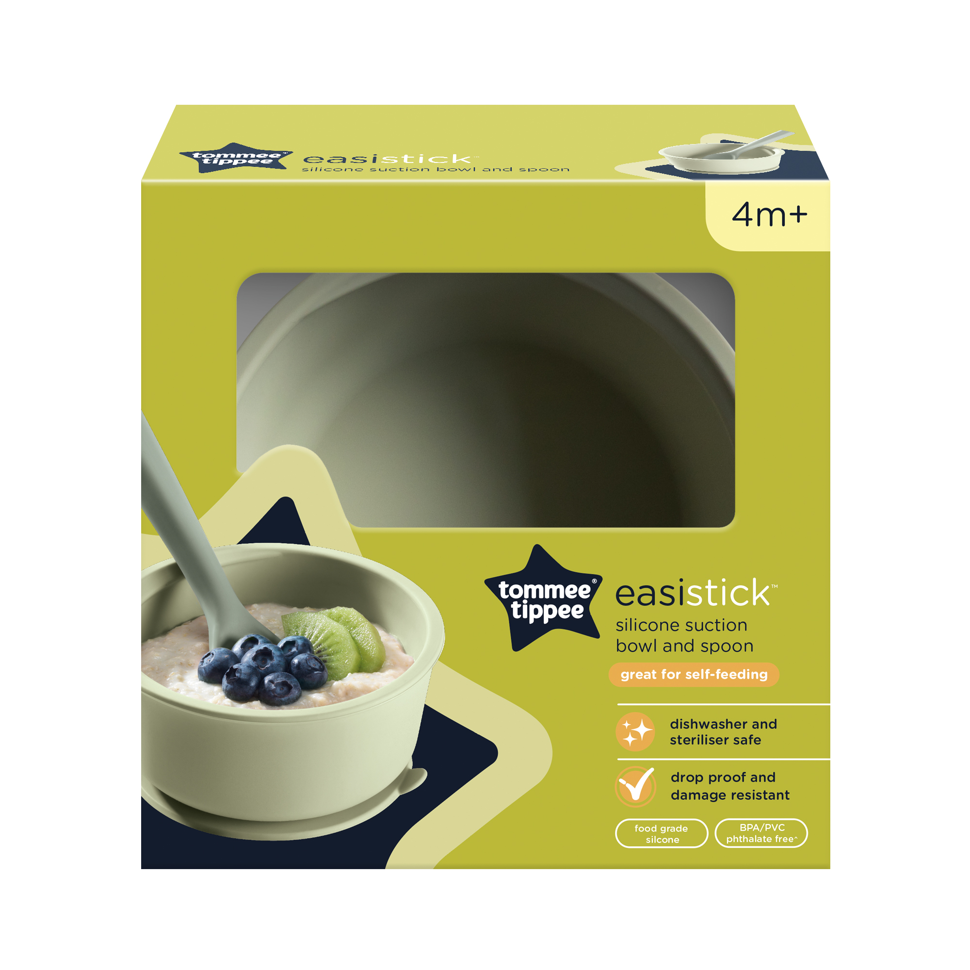 SKU 447885 Description TT SILICONE BOWL AND SPOON GREEN Colour Green Need State Toddler Feeding Category Toddler Feeding Sub-Category Mealtime Product Range Tableware Product Title Tommee Tippee Easistick Silicone Bowl and Spoon, 4m+, Suction Base for Weaning, Food-grade Silicone, Dishwasher and Steriliser Safe, Green Product Title (80 character limit) Tommee Tippee Easistick Silicone Suction Bowl and Spoon, 4m+, Dishwasher Safe DTC Short Product Description A stylish 2-piece silicone feeding set for babies. With a silicone suction bowl and a soft matching baby weaning spoon that's gentle on teething gums. Designed to stops tips and spills, to make weaning simpler. Long Product Description A stylish 2-piece silicone feeding set for babies. With a silicone suction bowl and a soft matching baby weaning spoon that's gentle on teething gums. Designed to stops tips and spills, to make weaning simpler. • Baby bowl sticks to most smooth surfaces, so they get more food on the soft weaning spoon (and less on the floor) • 100% food-grade silicone that’s heat resistant and easy to clean • Suitable for weaning babies aged 4m+ • BPA, BPS, PVC, Phthalate and Nitrosamine free • Dishwasher, microwave and steriliser safe Key Features 2-piece silicone feeding set: A matching silicone baby bowl and a soft baby weaning spoon that's comfortable to hold and gentle on teething gums Suction base bowl: Sticks to most smooth, flat surfaces to keep the bowl stable and stop tips and spills 100% food-grade silicone: That’s heat resistant, easy to clean, drop-proof and damage resistant Ready to wean: Suitable for weaning babies aged 4 months and up Easy to clean: Dishwasher, microwave and steriliser safe to make tidying up simpler Key Features Split - 2-piece silicone feeding set: A matching silicone baby bowl and a soft baby weaning spoon that's comfortable to hold and gentle on teething gums