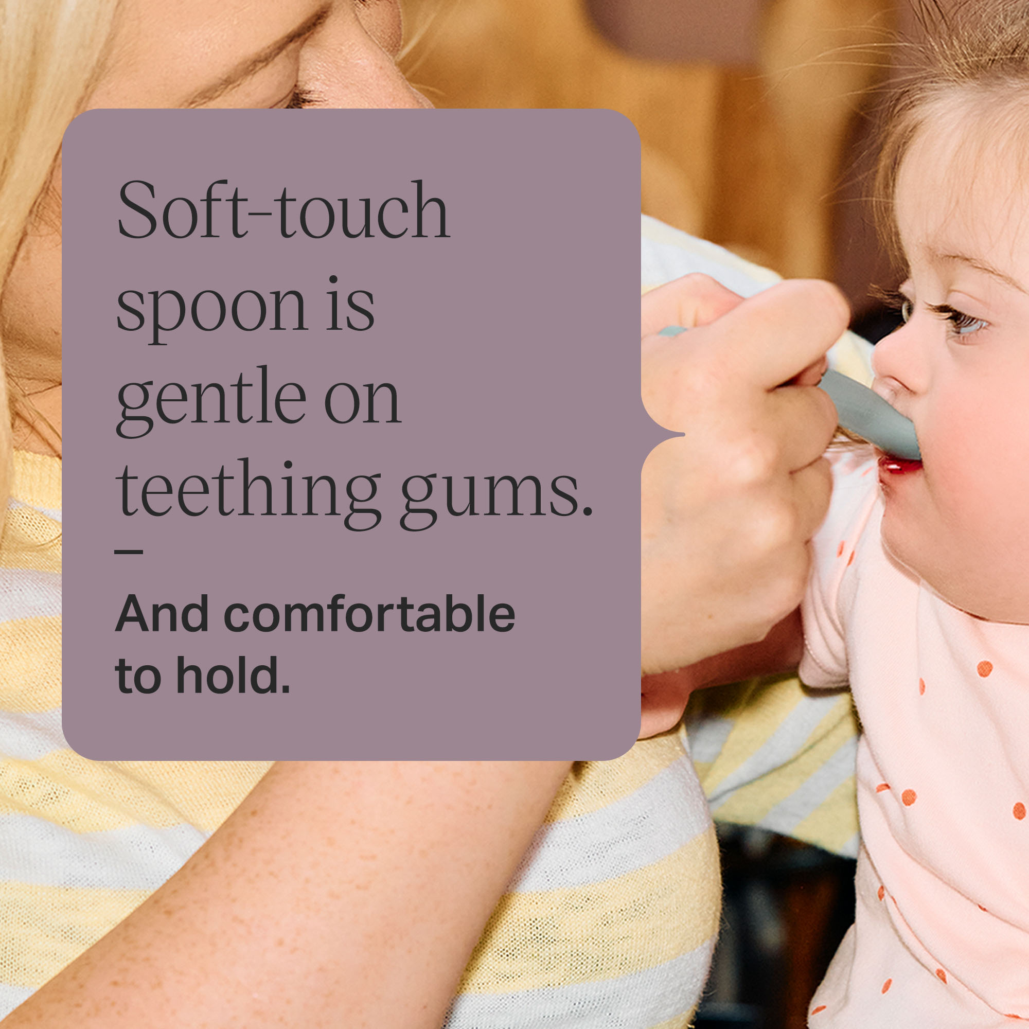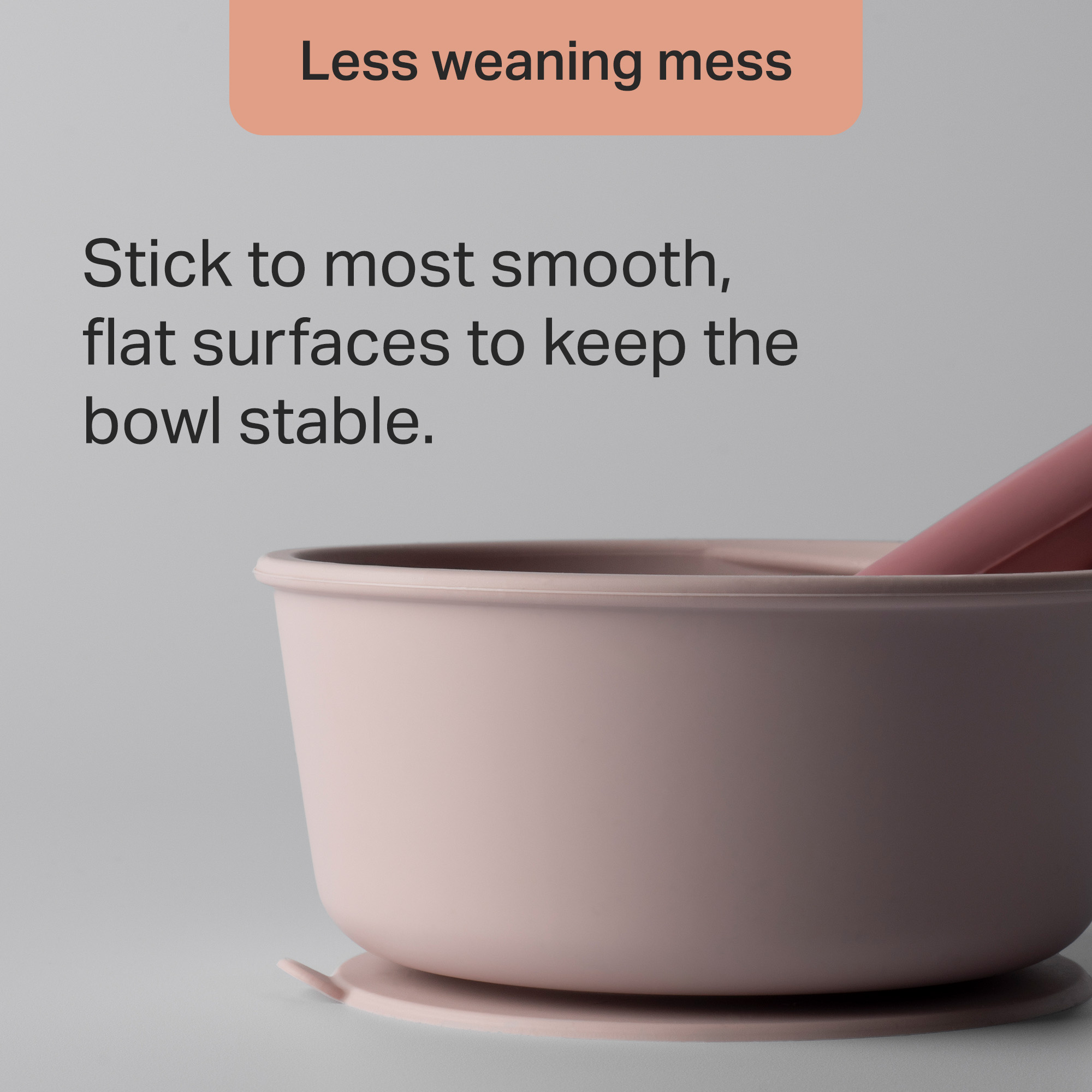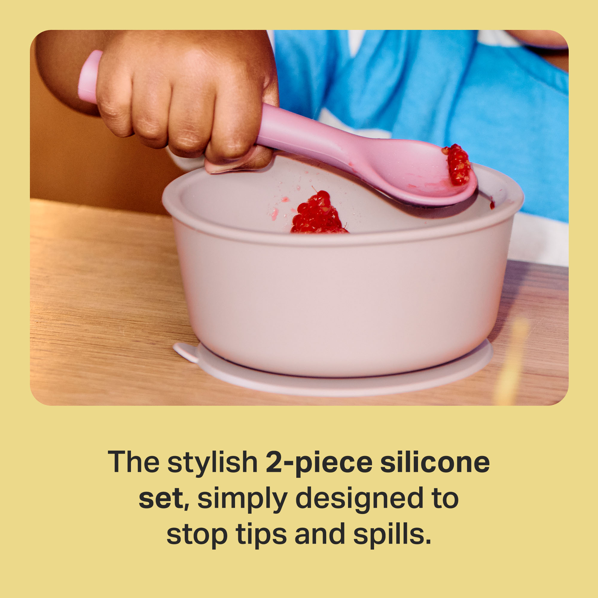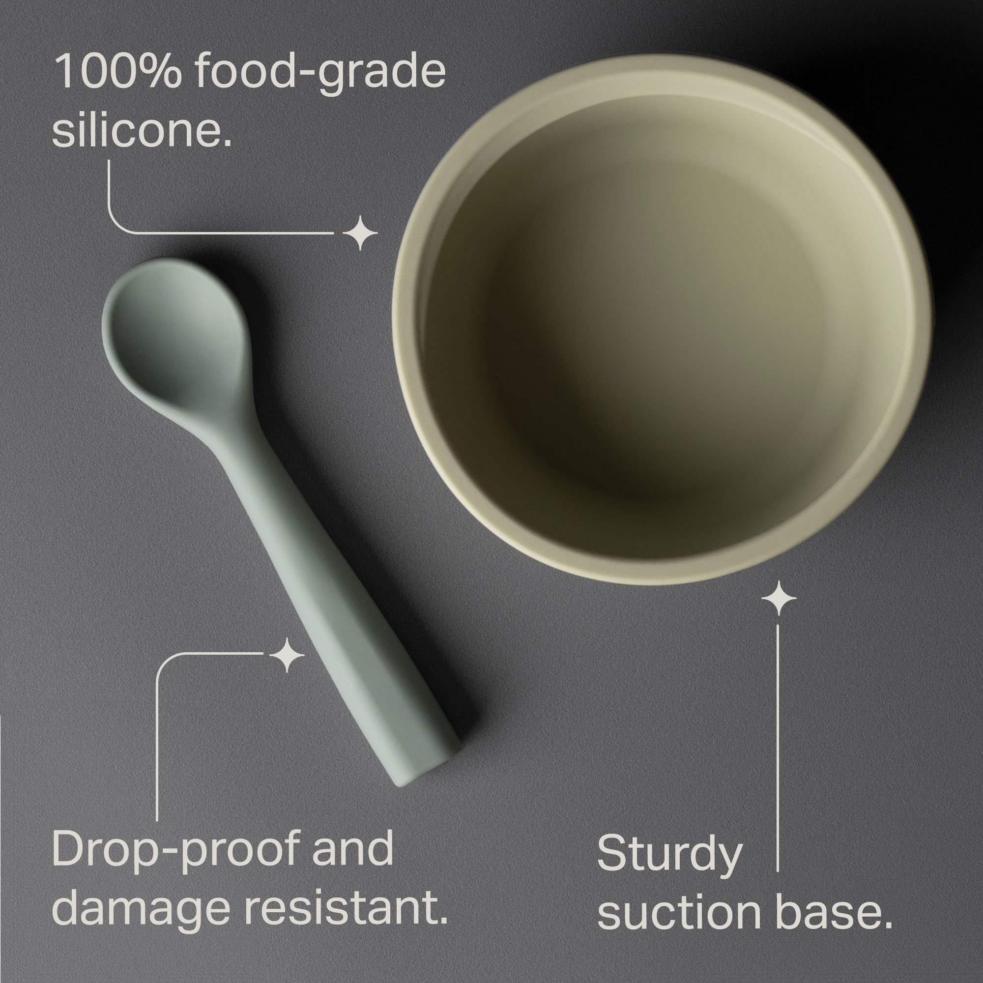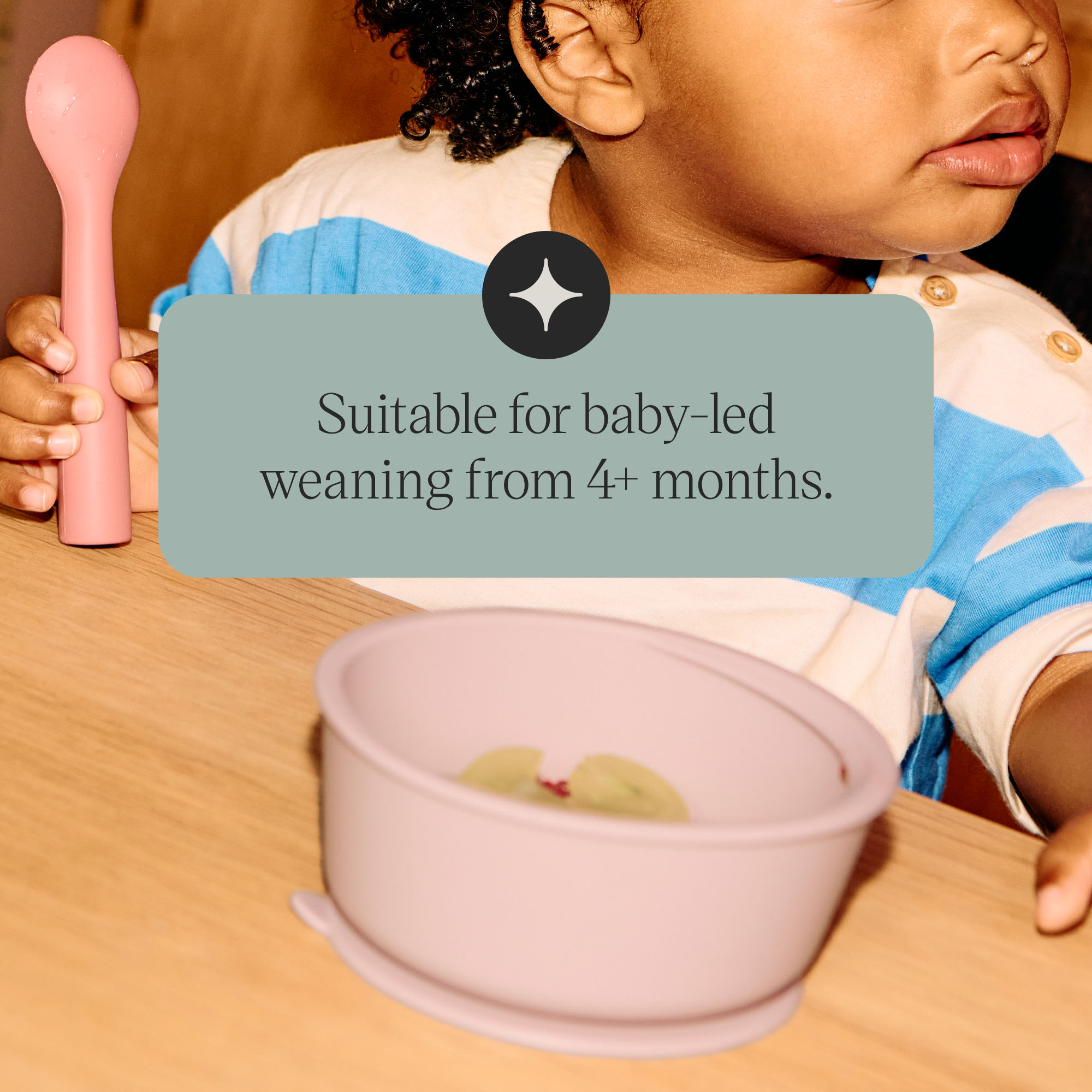 - 2-piece silicone feeding set: A matching silicone baby bowl and a soft baby weaning spoon that's comfortable to hold and gentle on teething gums