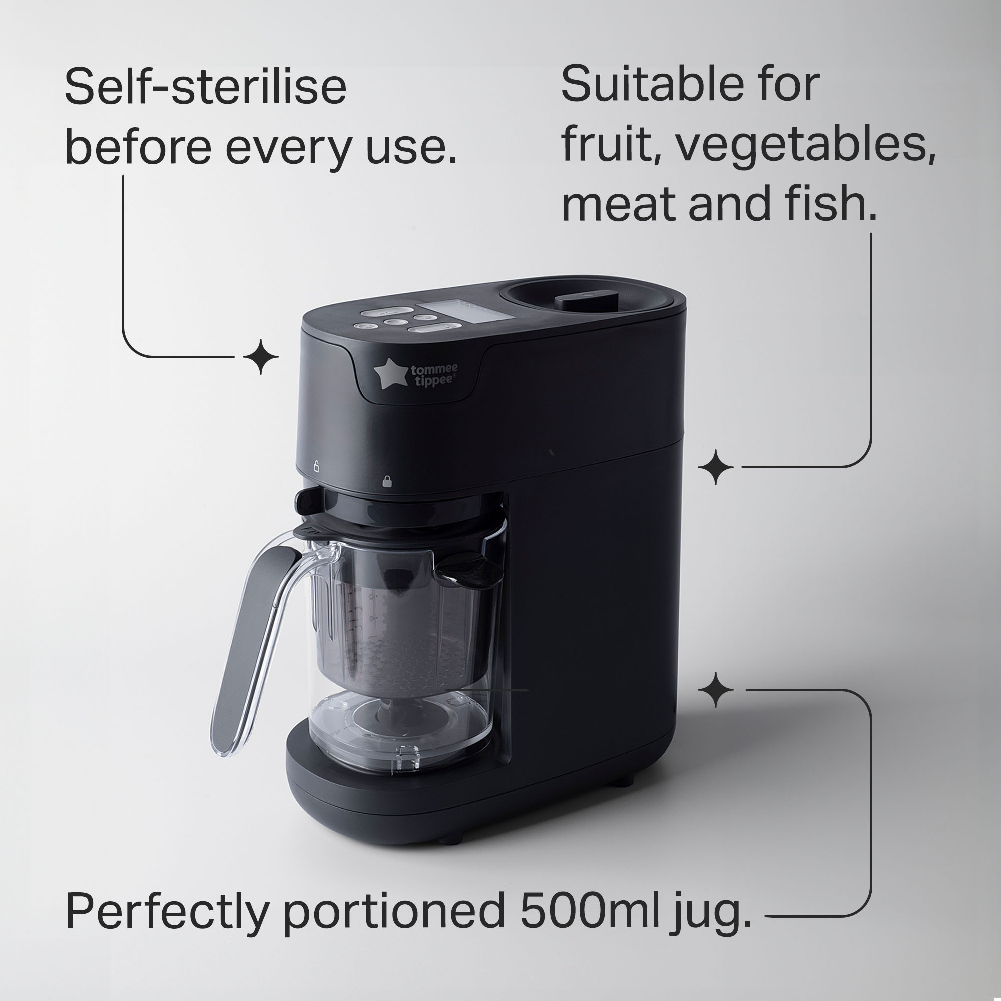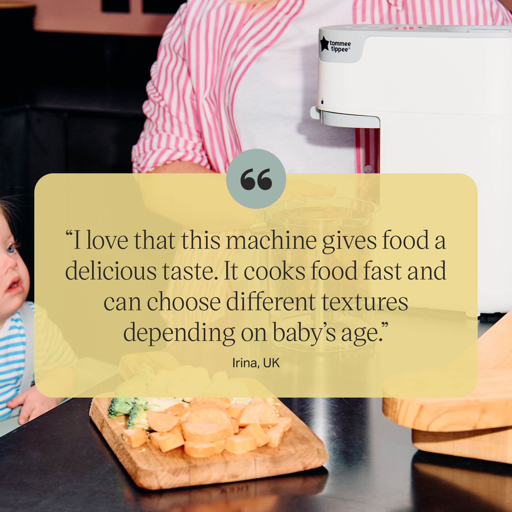 SKU 491656 Description TT STEAMER BABY FOOD MAKER WHITE Colour White Need State Toddler Feeding Category Toddler Feeding Sub-Category Mealtime Product Range Food Prep Product Title Tommee Tippee Quick Cook 6-in-1, 500ml Capacity, White, Baby Food Maker with Steam, Blend, Chop, Reheat, Defrost and Sterilising Functions for Baby Weaning Product Title (80 character limit) Tommee Tippee 500ml Quick-Cook 6-in-1 Baby Food Maker: Steam, Chop Blend, & More DTC Short Product Description A baby food processor that makes fresh weaning meals at the touch of a button. QuickCook steams, blends, chops, defrosts, reheats and sterilises, so you can batch cook tasty meals, and wean your baby, your way. Long Product Description A baby food processor that makes fresh weaning meals at the touch of a button. QuickCook steams, blends, chops, defrosts, reheats and sterilises, so you can batch cook tasty meals, and wean your baby, your way. • This baby food maker preserves the nutrients and flavour of fruit, vegetables, meat and fish • Makes different textures, from smooth purées to chunky tastes with a little more bite • 500ml jug to prepare portions of homemade baby food, fast • This baby food steamer and blender includes 4 storage pots and a baby weaning spoon • The jug, lid and basket are dishwasher safe and easy to clean Key Features Healthy, nutritious, perfectly-portioned meals for weaning babies: This baby food steamer and blender preserves the nutrients and flavour of fruit, vegetables, meat and fish From their first tastes to meals with a little more bite: This baby puree maker prepares different textures, from smooth purées to chunky tastes 500ml capacity: The large blending jug means you can prepare portions of homemade baby food, fast Weaning essentials: As well as a blender for baby food, you also get 4 x 60ml weaning pots to store baby food, and a soft-tipped baby weaning spoon Easy to clean: The jug, lid and basket are dishwasher safe, and the unit self-sterilises before every use for extra peace of mind Key Features Split - Healthy, nutritious, perfectly-portioned meals for weaning babies: This baby food steamer and blender preserves the nutrients and flavour of fruit, vegetables, meat and fish