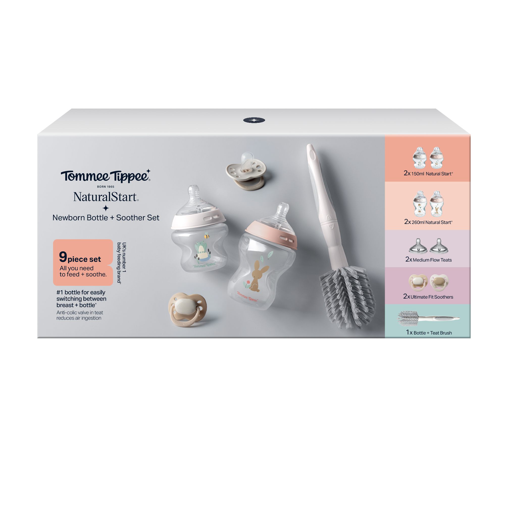 Contents: 2 x 150ml Natural Start Bottles, 2 x 260ml Natural Start Bottles, 2x Medium Flow Teats, 2x Ultimate fit Soothers, 1x Bottle & Teat Brush