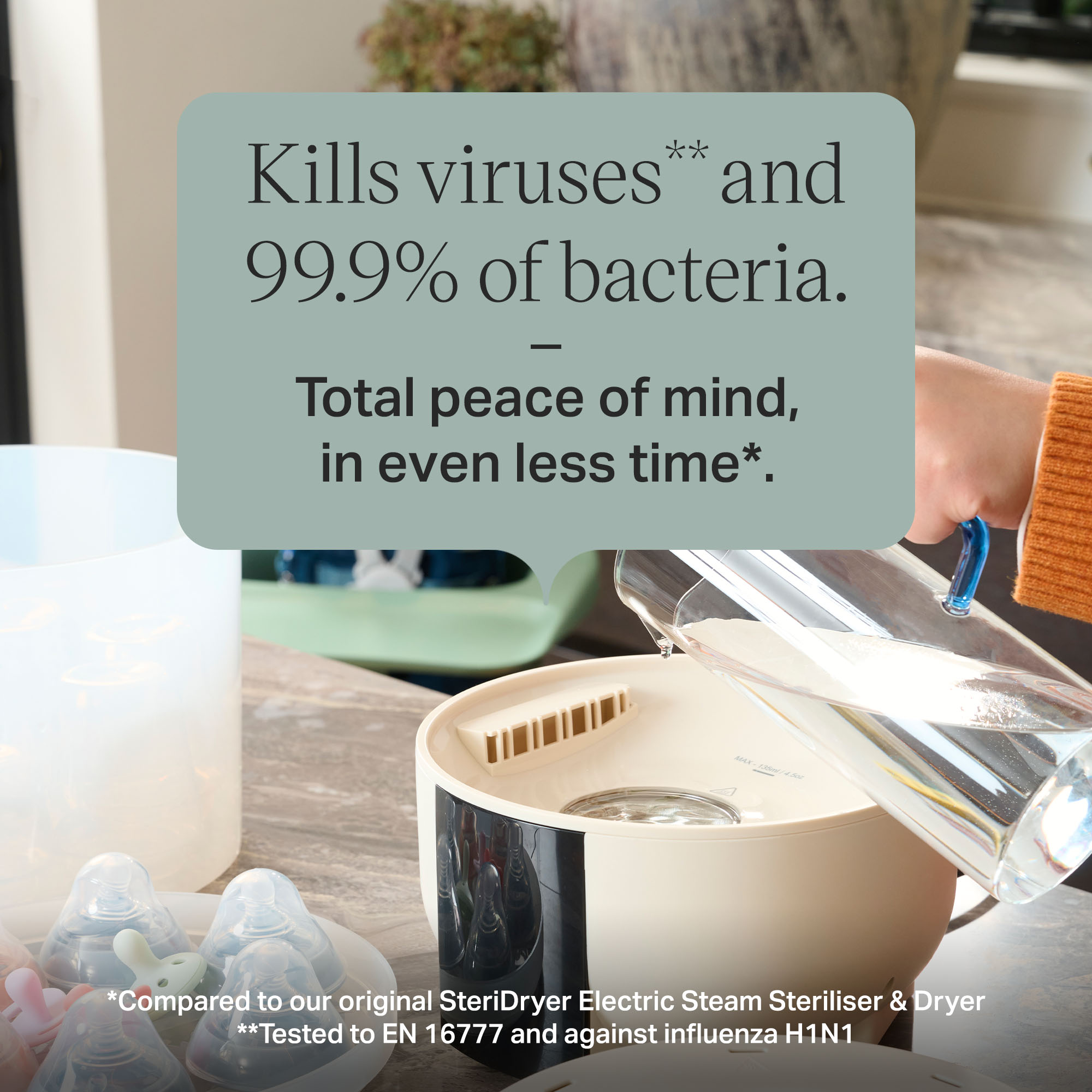 | Feature Bullet 2 | Fast drying: A full cycle sterilises and dries 6 bottles in just 26 minutes† |
