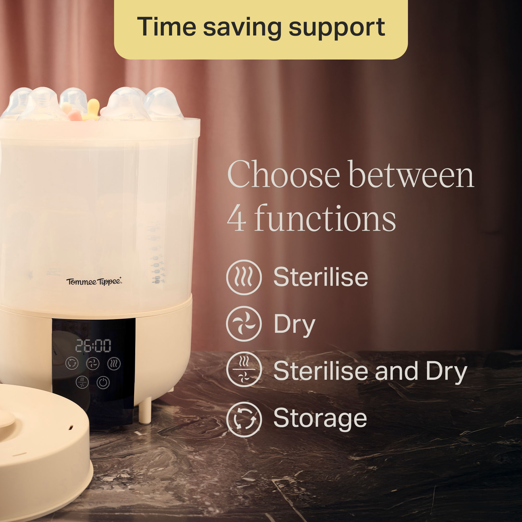 - Fast drying: A full cycle sterilises and dries 6 bottles in just 26 minutes†