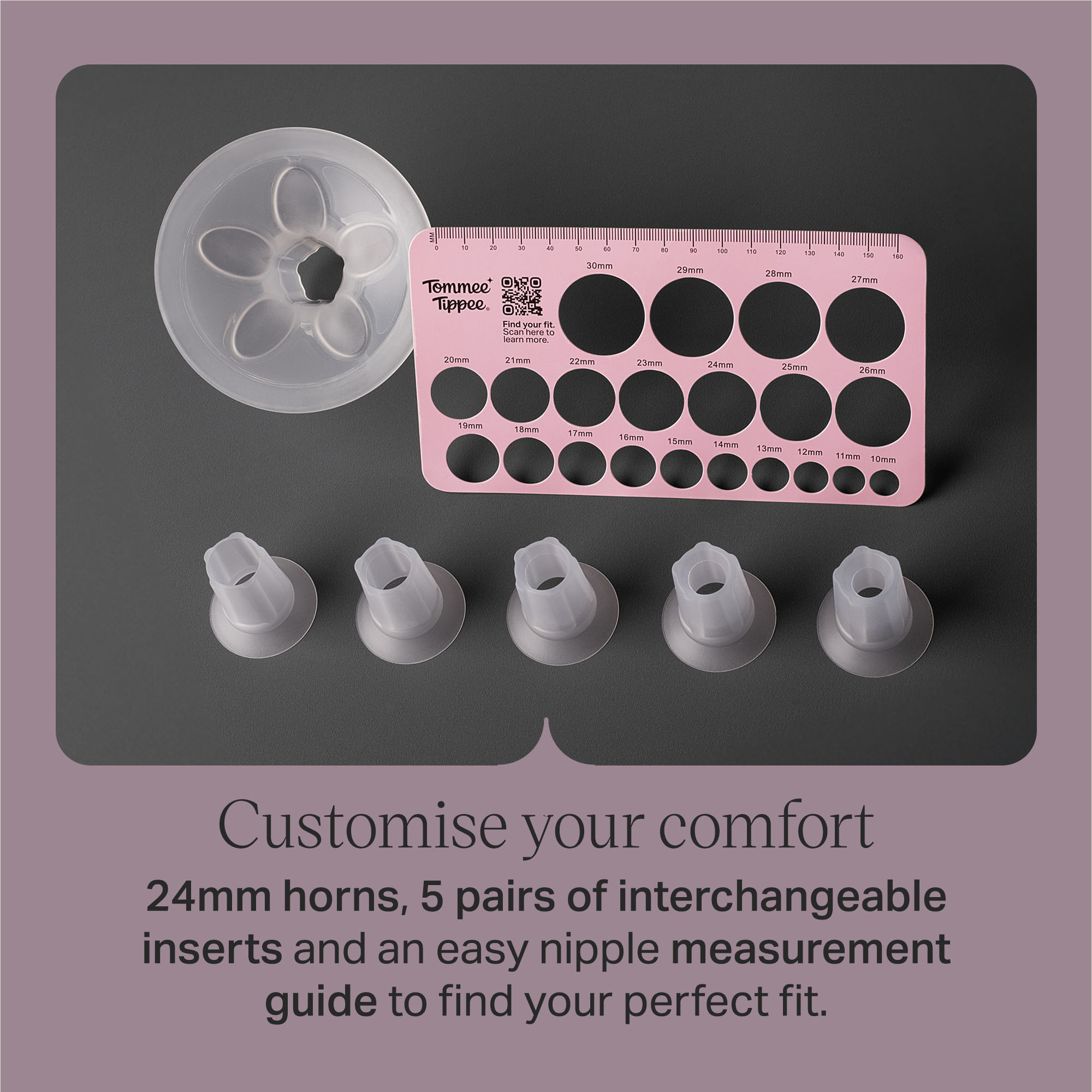 - Customised Comfort and Fit: Find your perfect fit with 5 flange insert sizes (13mm, 15mm, 17mm, 19mm, 21mm), 24mm flanges, and a nipple measurement guide