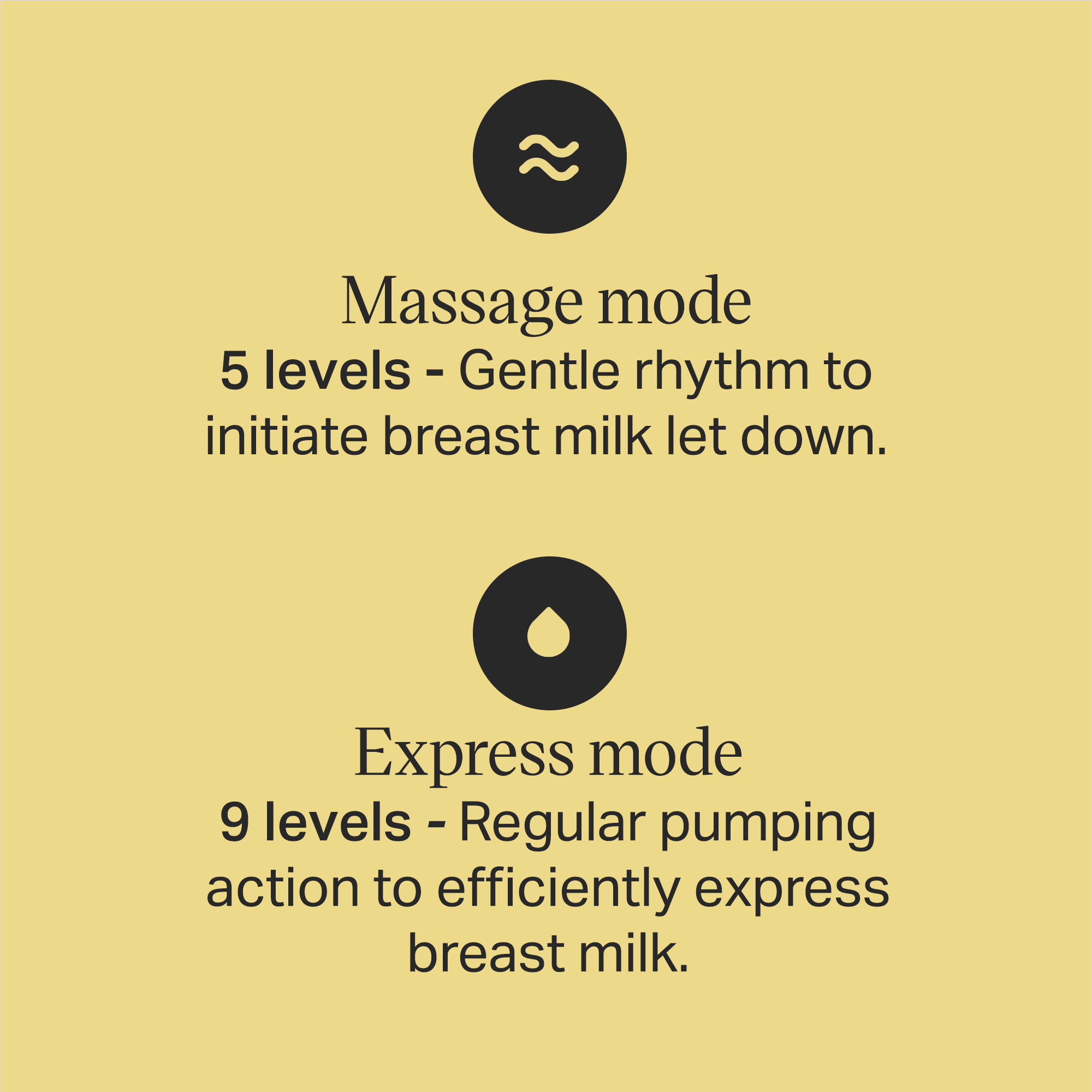 | Feature Bullet 4 | Hospital-Grade Performance, Personalised Control: Choose between 2 modes (massage with 5 levels and express with 9 levels) to mimic your baby’s natural rhythm. Adjust suction strength and speed for the most comfortable, efficient milk expression every time |