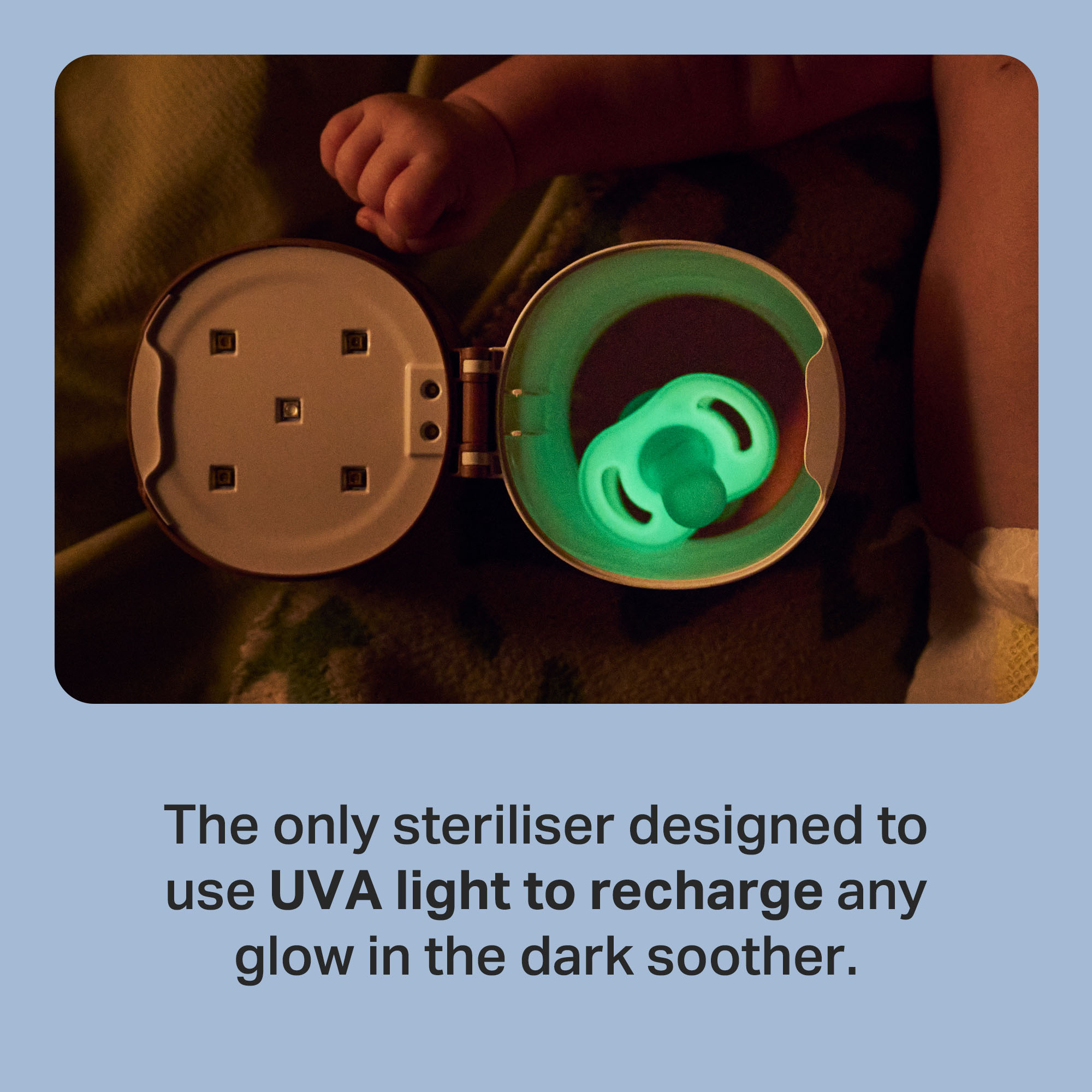 • The only steriliser designed to use UVA light to recharge any glow in the dark soother
