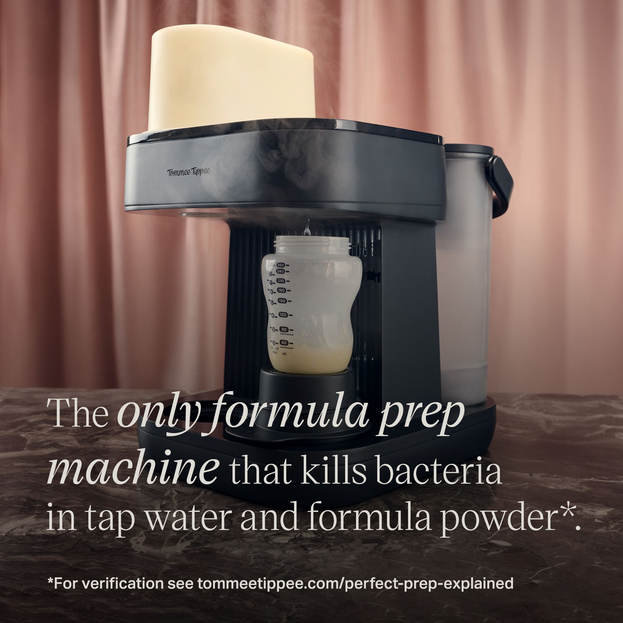 | DTC Short Product Description | Perfect Prep® Pro is up to 10x faster than a kettle*, and up to 10x more accurate than hand scooping*. It dispenses formula powder, a patented hot shot, and filtered water to make a perfect bottle temperature feed, fast. The most accurate way to measure, dispense and make a formula feed*, it's scientifically proven to make a fresh feed as safely as the NHS method, with no scooping, counting or boiling. The next-generation of baby bottle preparation, perfected. |