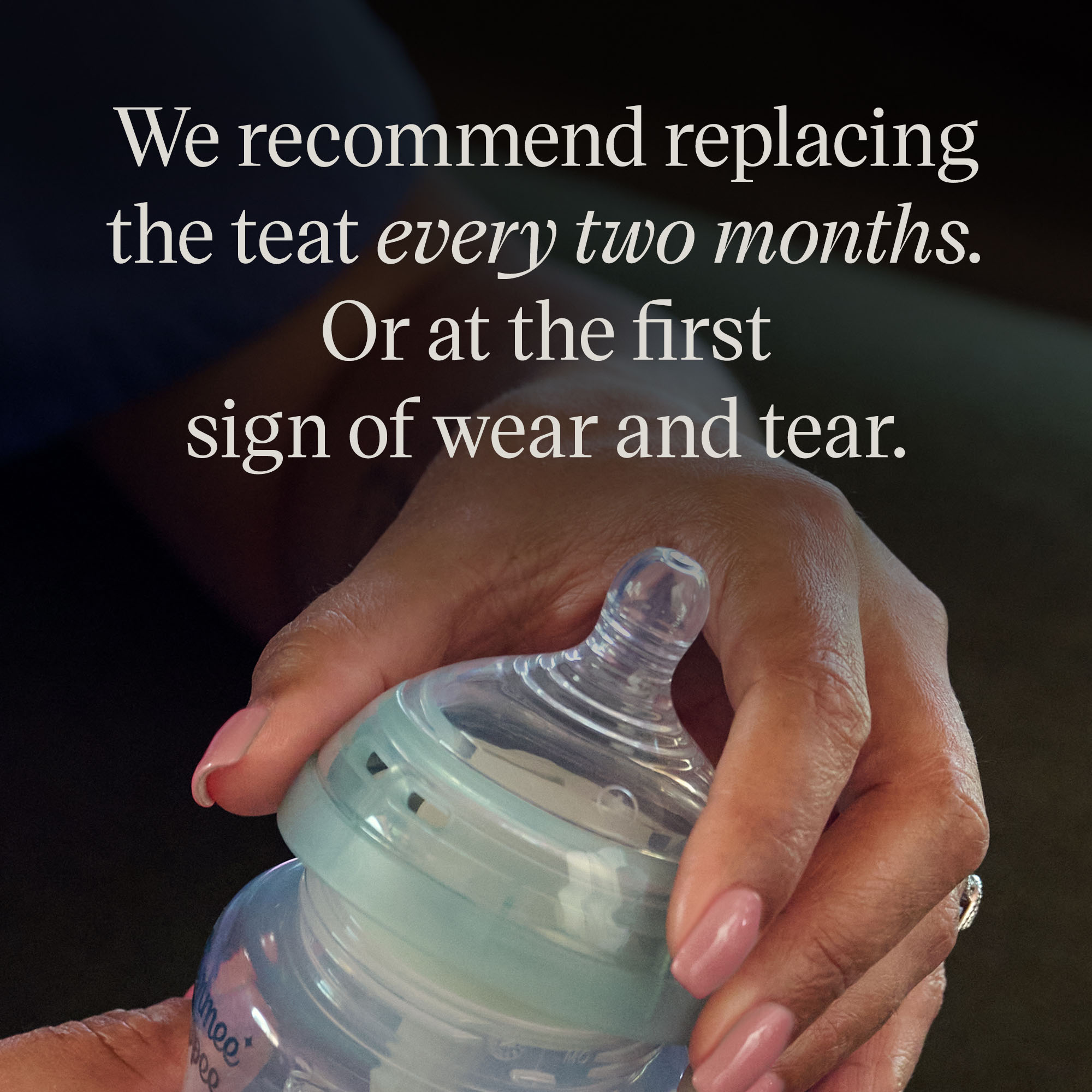 We recommend replacing the teats on your baby’s bottles every 2 months or at the first sign of any damage or weakness.