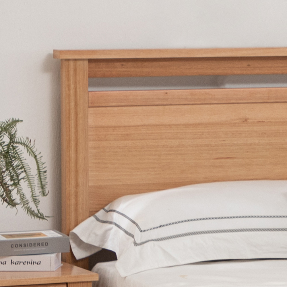 Crafted from Messmate timber veneer the classic minimal silhouette of this bed would feel perfectly at home within a modern space while the sturdy frame ensures you’ll have a foundation for a good night’s sleep for many years to come. You can also pair this bed with the matching bedroom furniture to create a calming and cohesive sleeping environment.