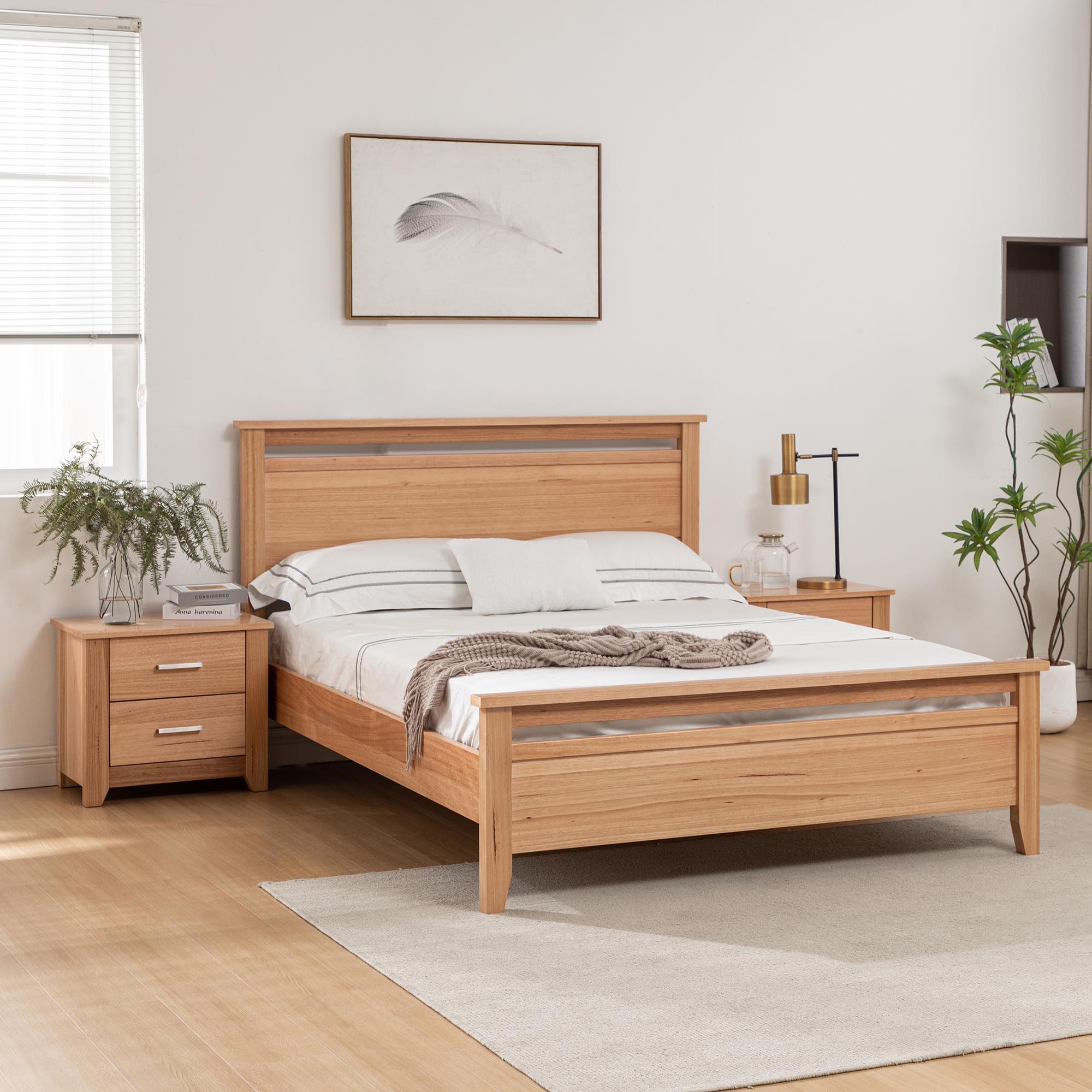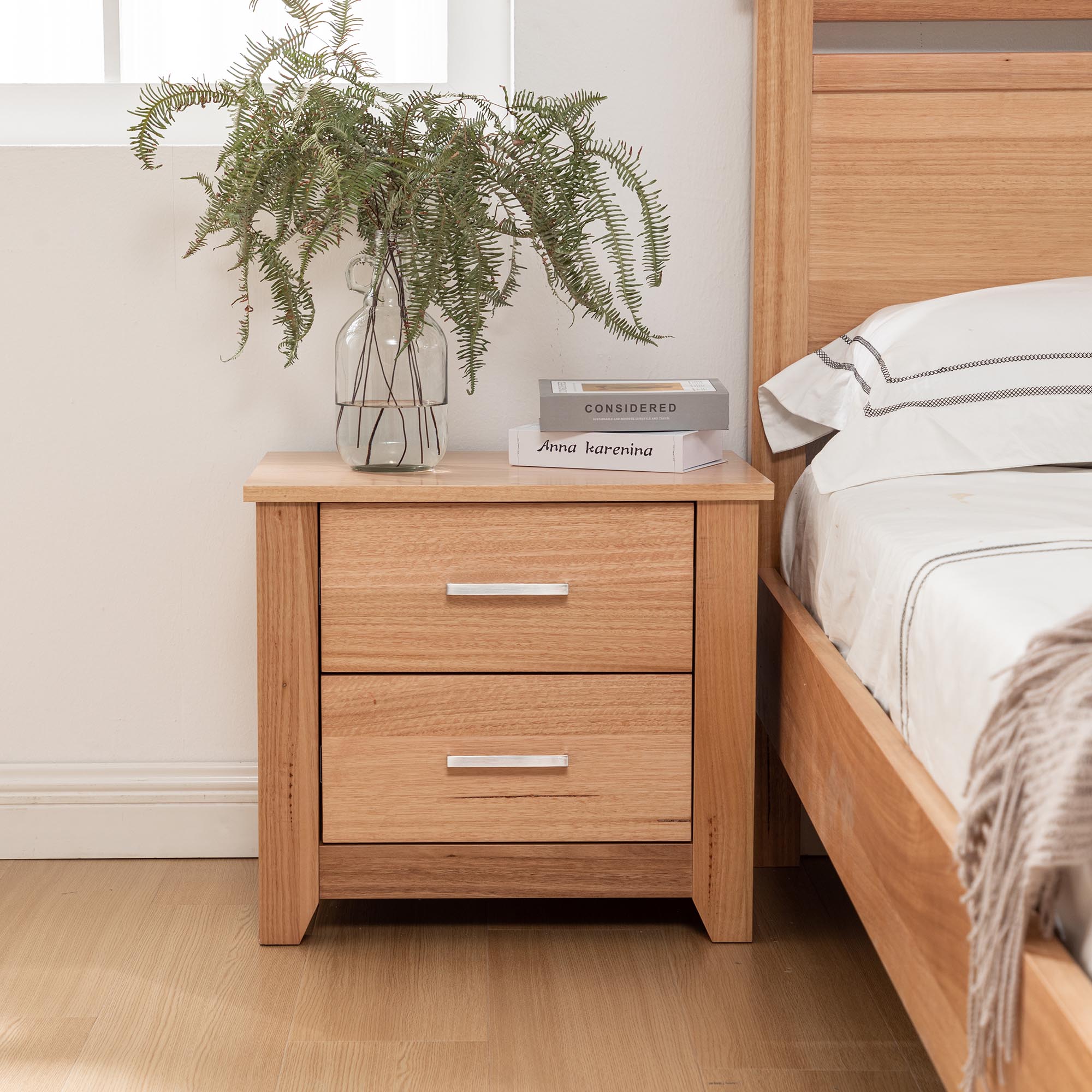 The PORTLAND BEDSIDE TABLE is a bedroom essential. Crafted from Messmate timber veneer the minimal silhouette of the design works seamlessly with both traditional and modern spaces.