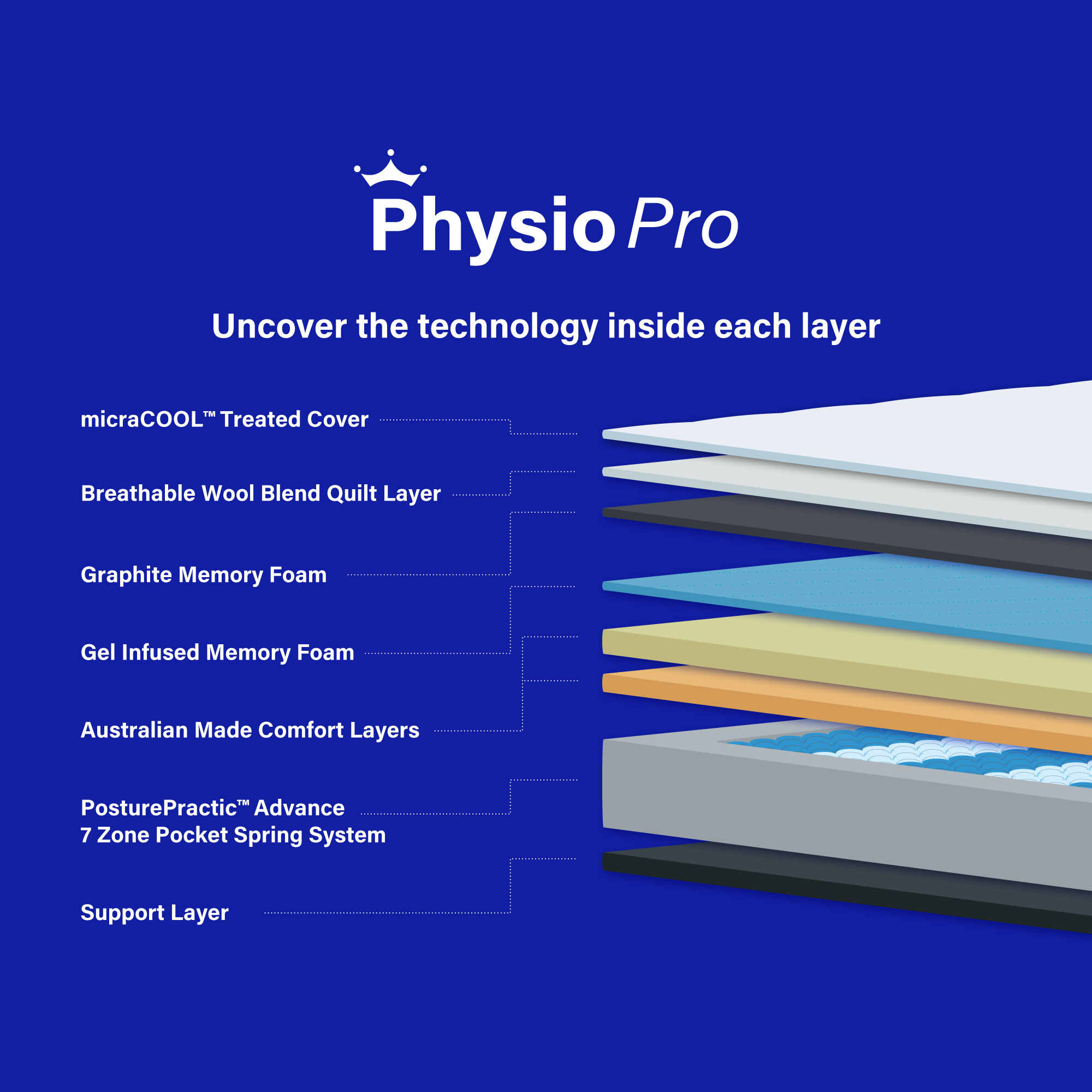 The quilt layer incorporates a wool-blend fabric offering superior breathability and insulation. Combining Graphite Memory Foam and Gel-Infused Memory Foam this mattress provides gentle cushioning for the shoulders while maintaining firm support for the hips and lower back encouraging healthier spinal alignment and restorative sleep.Available in three comfort levels: Firm Medium and Plush the Physio Pro Range is proudly endorsed by the Australian Physiotherapy Association (APA). Products carrying the APA-endorsed logo assure consumers that they have been rigorously tested and evaluated for quality and support.Choosing the right mattress is a big decision and one you should feel completely confident about. That’s why Crown Posture Bedding offers the Good Night Sleep Promise on the Physio Mattress range to make sure you truly love where you sleep. Click here to learn more about the Good Night Sleep Promise.