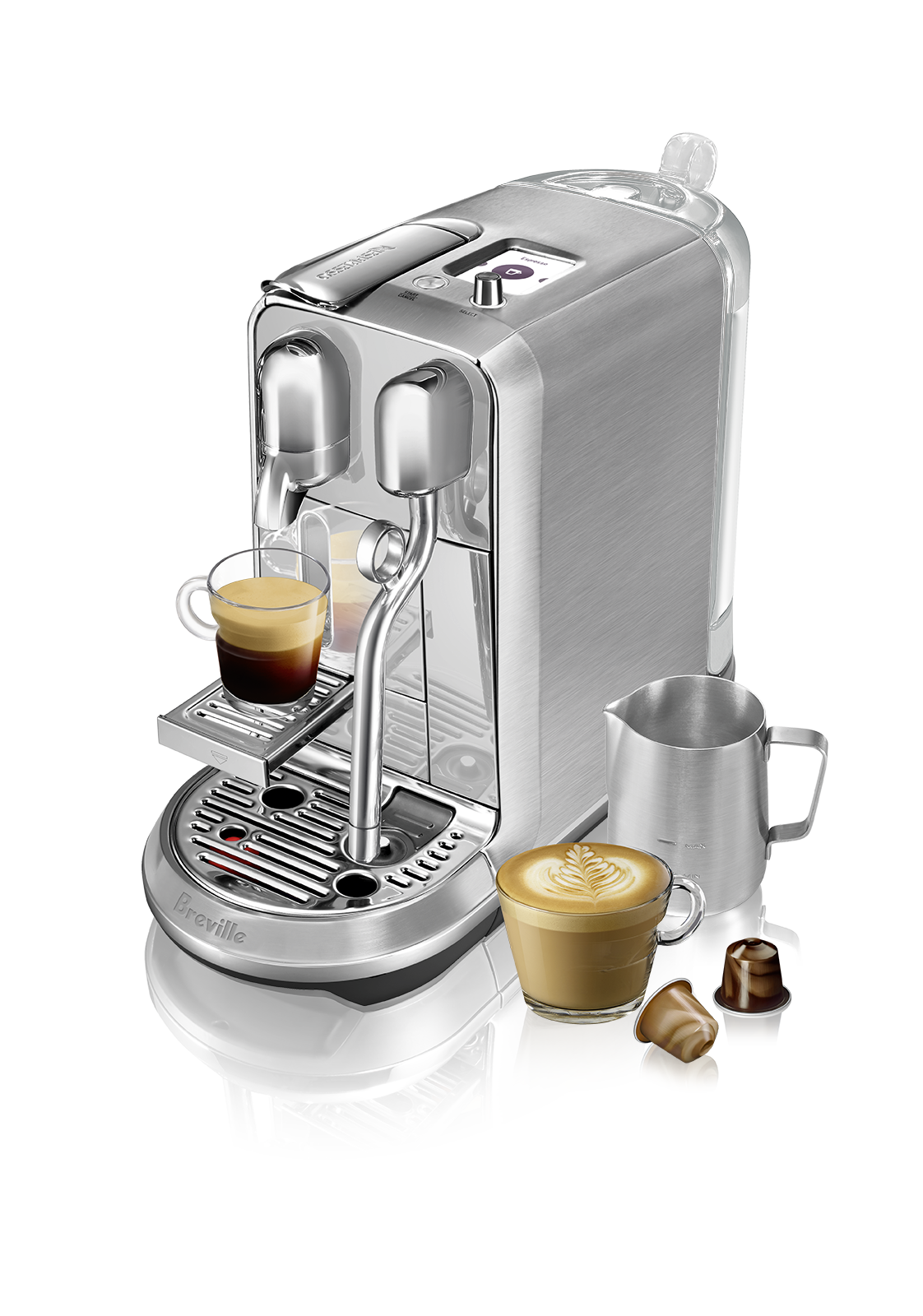 Nespresso Creatista Plus enables you to easily create authentic top-qualityLatte Art coffees at home, thanks to Nespresso convenience and coffeeexpertise combined with an automatic steam pipe. Its display guides youfor the preparation and maintenance.It features a high-end and robust design with refined brushed stainlesssteel and includes a Barista style milk jug. Each machine includes acomplimentary welcome set with a range of Nespresso capsules withunique aromatic profiles