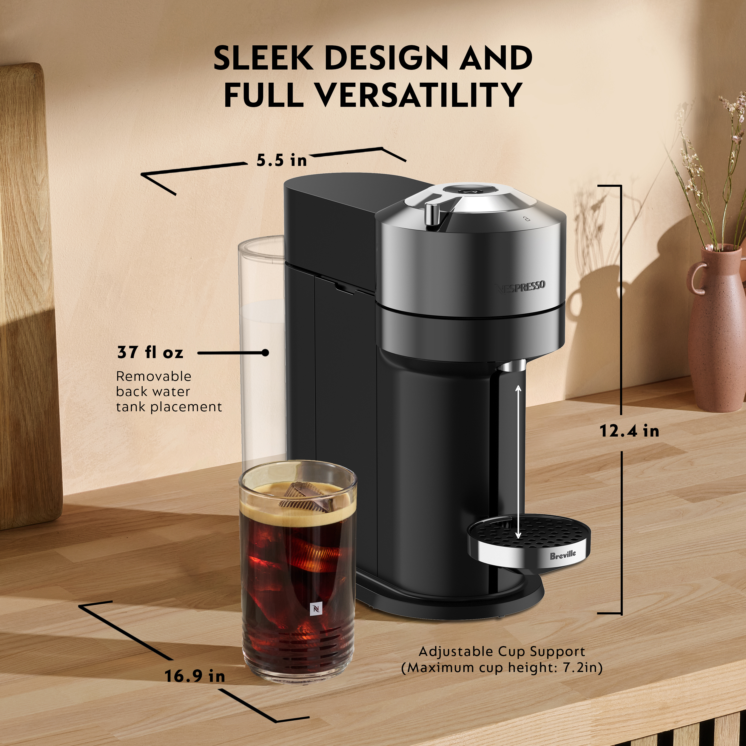 Group ID BNV570DCR1BUC1 National Product Title Nespresso Vertuo Next Deluxe Coffee and Espresso Maker by Breville with Aeroccino Milk Frother Product Description Nespresso VERTUO NEXT coffee and espresso maker by Breville provides ultimate brewing experience. In addition to its original espressos, NESPRESSO VERTUO NEXT produces an extraordinary cup of coffee with a smooth layer of crema, the signature of truly great cup of coffee. The VERTUO coffee and espresso coffee machine conveniently makes 5, 8, 12, 18 oz Coffee and single and double Espresso. Bundled with Nespresso Aeroccino3 milk frother it provides smooth hot or cold milk froth for your coffee recipes with one touch. Nespresso brings together the know-how of all its coffee experts, who have carefully chosen the origin and roasting of each coffee blend and created a brewing system using Centrifusion technology, a patented extraction technology developed by Nespresso. Just insert a Vertuo capsule and close the lever — when activated, the capsule spins, blending ground coffee with water and extracting every drop of flavor. Its precision brewing system recognizes each capsule and automatically adjusts its brewing parameters to consistently deliver the best in cup result. Bundled with Nespresso's Aeroccino3, provides smooth hot or cold milk froth for your coffee recipes with one touch. It froths all types of milk in a few seconds, without noise or vibration. Each machine includes a complimentary welcome set with a range of Nespresso Vertuo capsules with unique aroma profiles. Order your Nespresso capsules, receive personalized advice, and obtain technical support or repair for your machine through Nespresso via mobile app, online at Nespresso.com, by telephone or in one of our Boutiques. This coffee machine is compatible exclusively with Nespresso Vertuo pods. Input power (W):1260 Bullet 1 SIGNATURE COFFEES AND ESPRESSOS: Vertuo Next offers a variety of coffee formats in 6 sizes, including 5, 8, 12oz coffees, as well as single and double espressos brewed hot or over ice. Bullet 2 SLIM & SUSTAINABLE DESIGN: Nespresso’s newest innovation, Vertuo Next, is the most compact, sustainable, and smart Vertuo machine yet. It’s made of partially recycled materials, and is only 5.5 inches wide. Bullet 3 AEROCCINO MILK FROTHER INCLUDED: The Nespresso Aeroccino3 provides smooth hot or cold milk frother for your cappuccinos and lattes in a few seconds with one touch. Bullet 4 PRECISION BREWING: unlocks a smooth full bodied coffee topped with a velvety layer of coffee foam, for a perfect cup every time. Bullet 5 PREMIUM COFFEE BLENDS: Nespresso offers an array of over 40 permanent specialty Vertuo coffees, from dark and strong to mild and smooth, as well as unique limited edition blends and flavors. A complimentary tasting pack is included with your machine (assortment may vary). Capsules exclusively compatible with Nespresso Vertuo machines. Bullet 6 NESPRESSO CAPSULES: Machine is exclusively compatible with Nespresso Vertuo capsules. Includes complimentary starter set included (assortment may vary from picture) Bullet 7 $20 OF VALUE INSIDE THE BOX: The Nespresso Vertuo Pop coffee and espresso machine includes a 12-capsule sample pack (assortment may vary) and voucher for $10 off your next purchase from Nespresso. Unit Height 12.4 Unit Length 16.9 Unit Width 5.5 Unit Dimensions UOM in Unit Net Weight 8.8 Unit Net Weight UOM lbs Unit Type Machine + Aeroccino