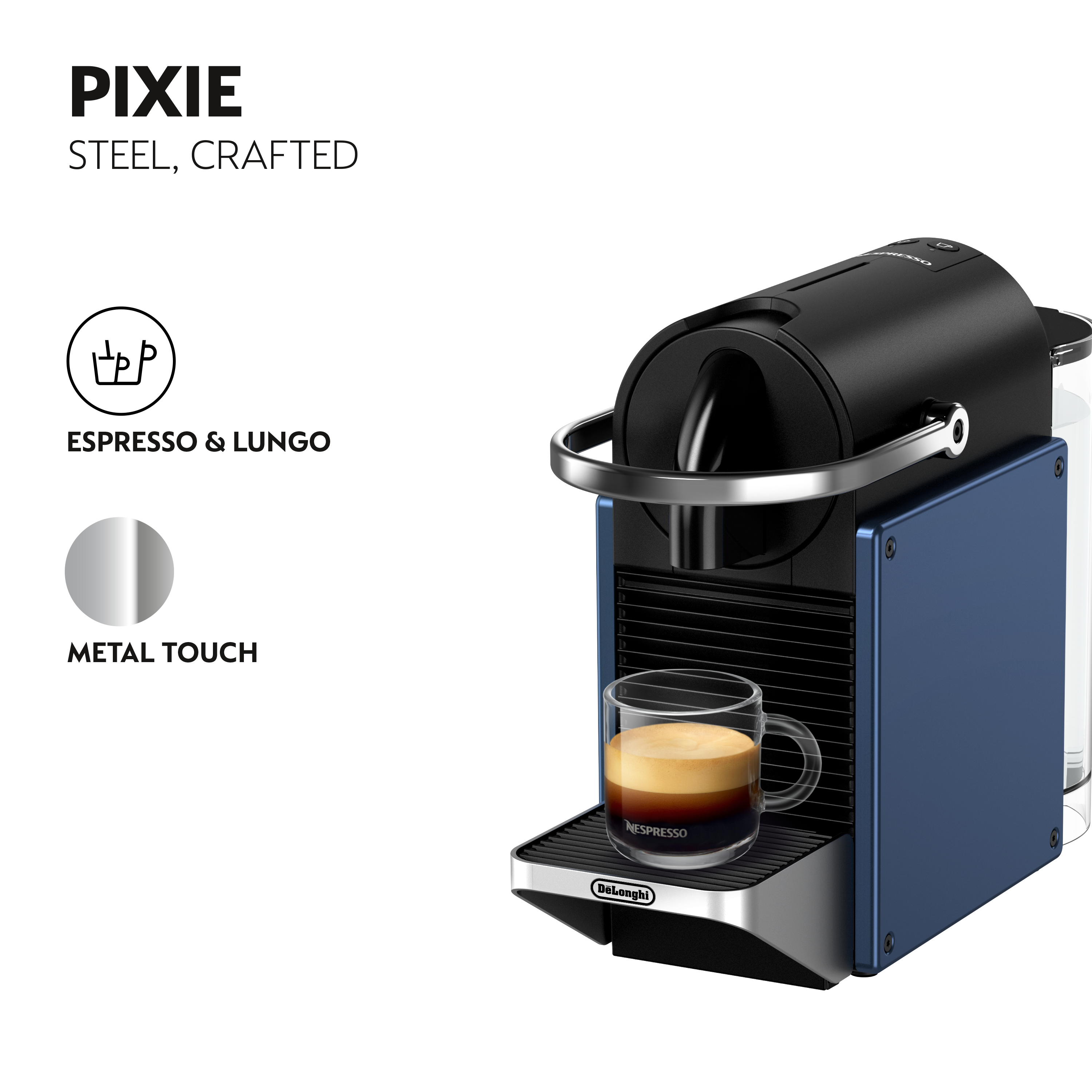 Straight from the design studio, the Nespresso Pixie single-serve espresso machine is an ode to the modern industrial style. Crafted for those with high standards in coffee and in looks, its essential lines and compact shape make it an icon in any kitchen. Simply press the button to have your Espresso or Lungo in one swift move. The Pixie machine has a fast heat-up system, as well as a 19-bar high-pressure pump so you can enjoy every flavor in your coffee. And with polished metal sides and a solid steel handle, the machine is as sturdy on the inside as on the outside.