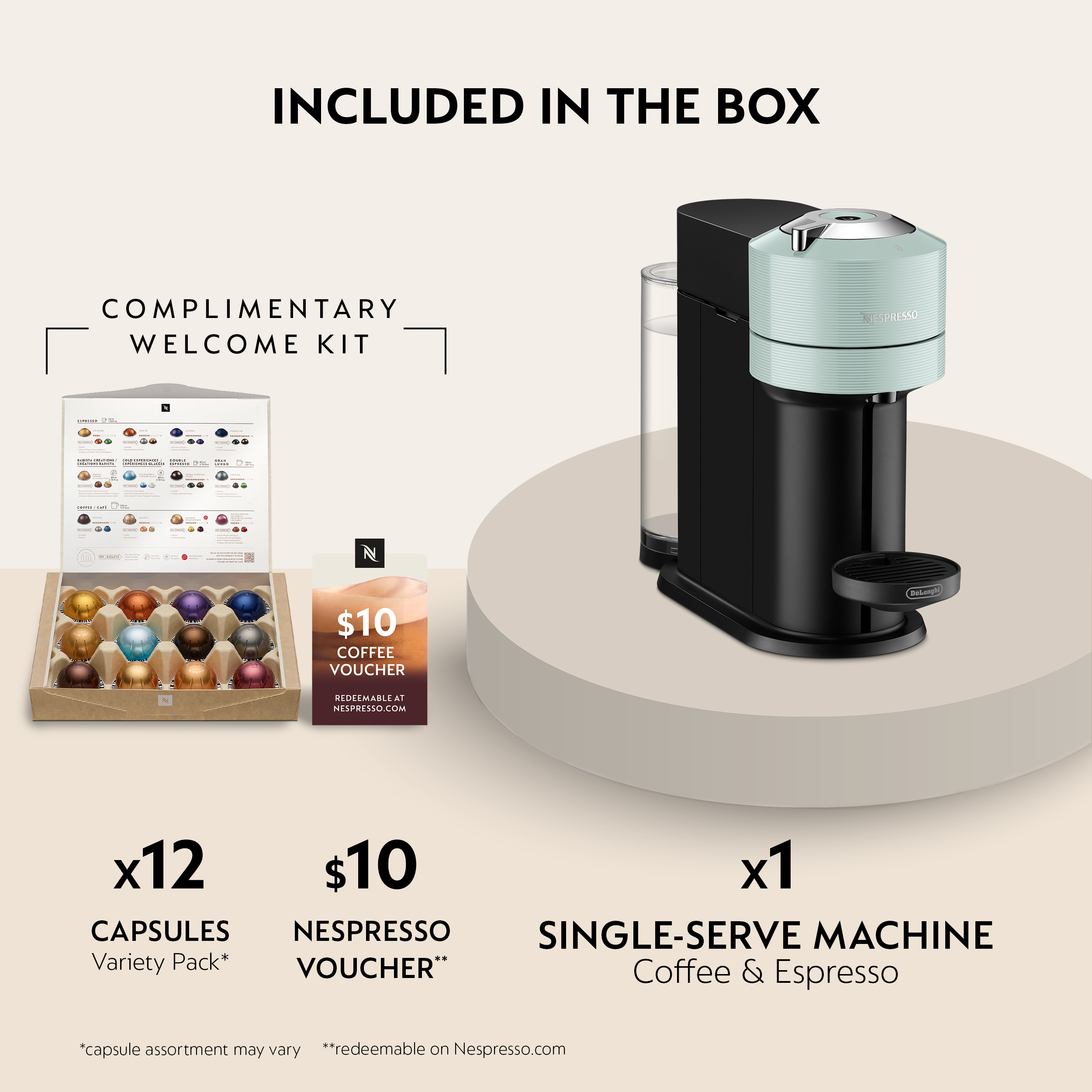 Nespresso VERTUO NEXT coffee maker and espresso machine takes the full range of Nespresso coffee styles even further. In addition to its original espressos, NESPRESSO VERTUO NEXT produces an extraordinary cup of coffee with a smooth layer of crema, the signature of truly great cup of coffee. The VERTUO coffee and espresso maker conveniently makes 6 brew sizes: 5, 8, 12, 18 oz Coffee and single and double Espresso. This Nespresso machine brings together the know-how of all its coffee experts, who have carefully chosen the origin and roasting of each coffee blend and created a brewing system using Centrifusion technology, a patented extraction technology developed by Nespresso. Just insert a Vertuo capsule and close the lever when activated, the capsule spins, blending ground coffee with water and extracting every drop of flavor. Its precision brewing system recognizes each capsule and automatically adjusts its brewing parameters to consistently deliver the best in cup result. Each machine includes a complimentary welcome set with a range of Nespresso pods Vertuo with unique aroma profiles. Order your Nespresso pods, receive personalized advice, and obtain technical support or repair for your machine through Nespresso via mobile app, online at Nespresso.com, by telephone or in one of our Boutiques. This coffee machine is compatible exclusively with Nespresso Vertuo pods.