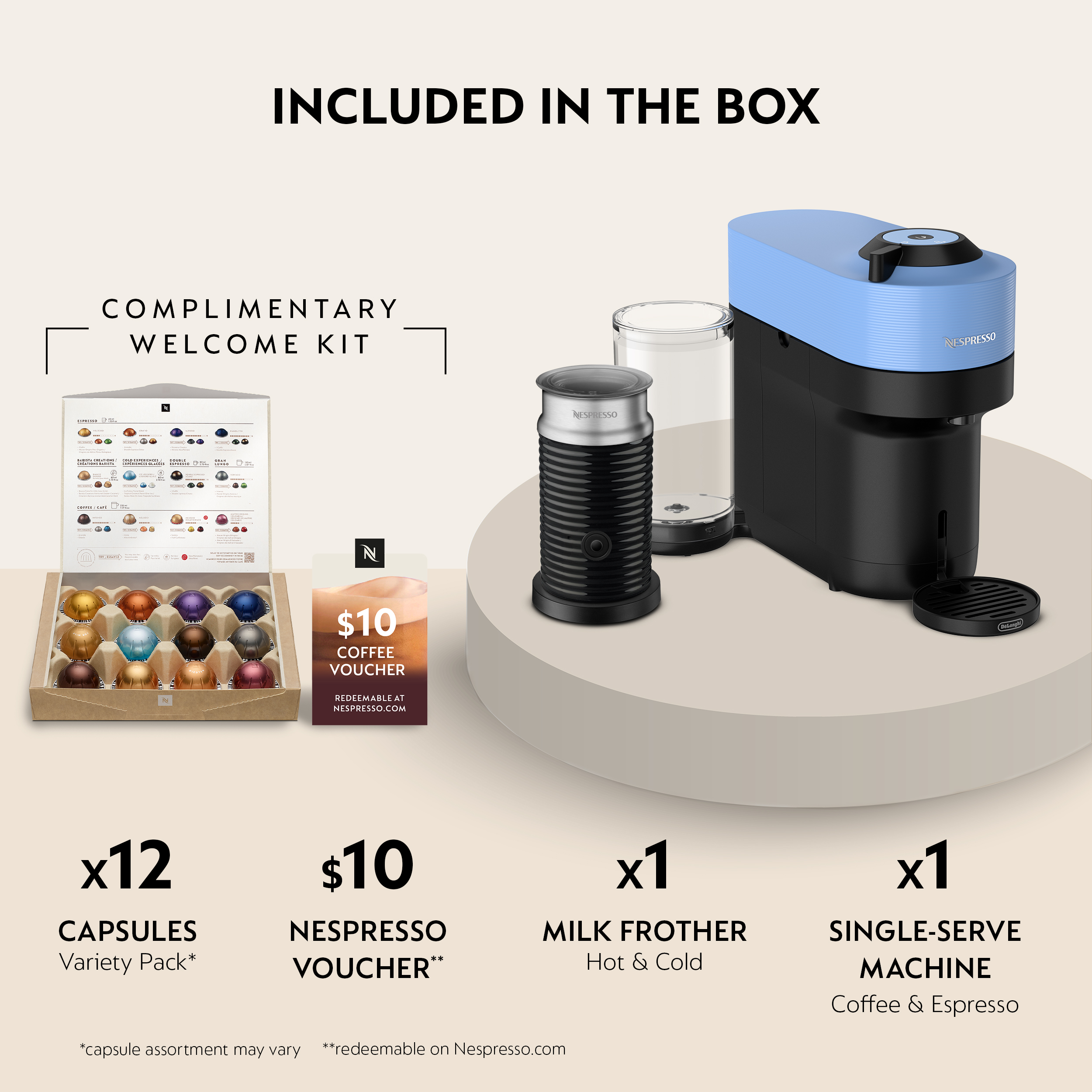 Bursting in a range of vibrant colors, Vertuo Pop+ makes a bold statement to match your style. With five cup sizes, from Espresso to Alto and Cold Brew style coffee, simply choose your Vertuo pod, pop it in, and you’re away at the touch of a button. The machine comes bundled with the Nespresso Aeroccino3 milk frother that provides smooth hot or cold milk froth for your cappuccinos and lattes in a few seconds with one touch.