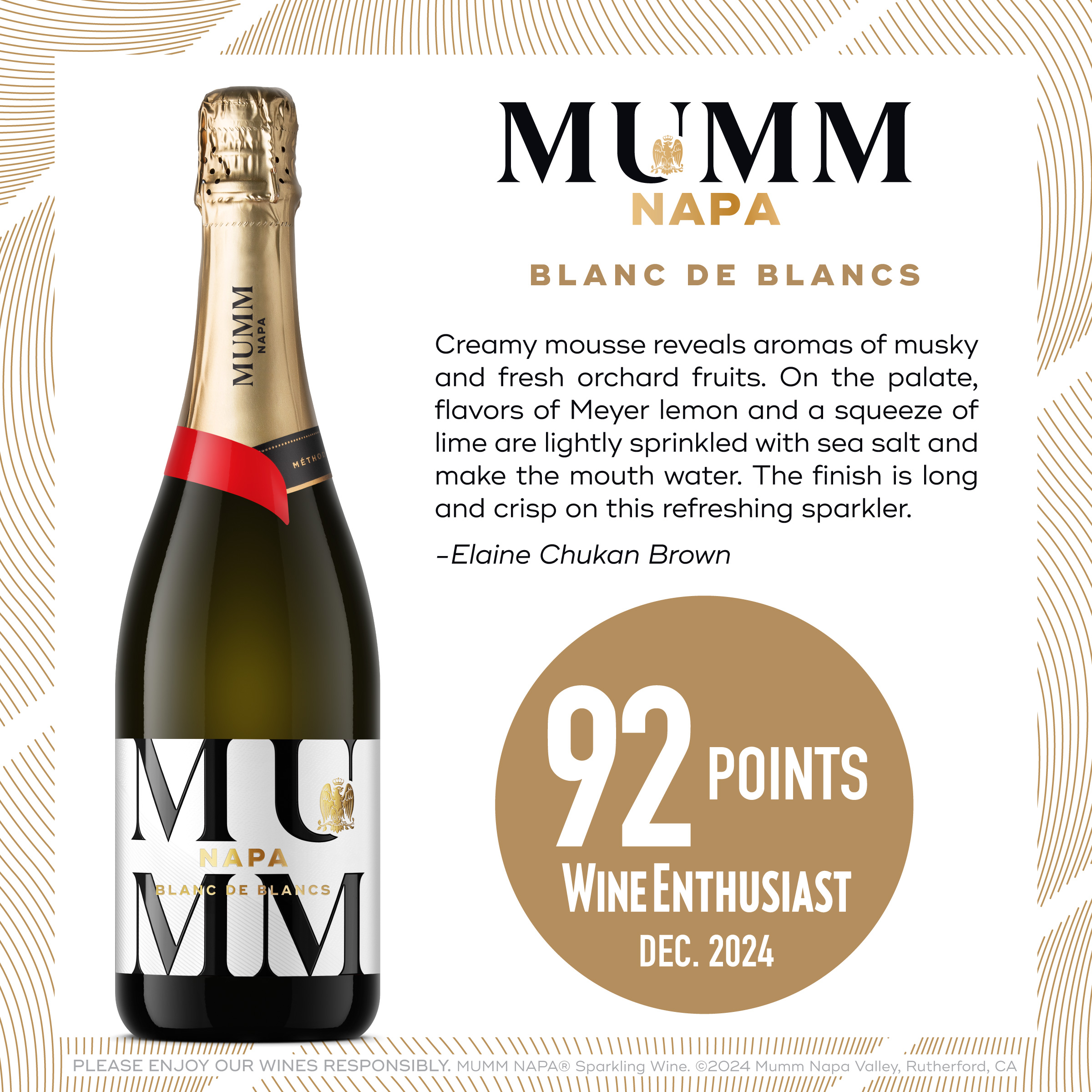 - INCLUDES: One 750 mL bottle of Mumm Napa Blanc de Blancs Sparkling Wine