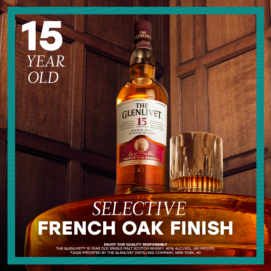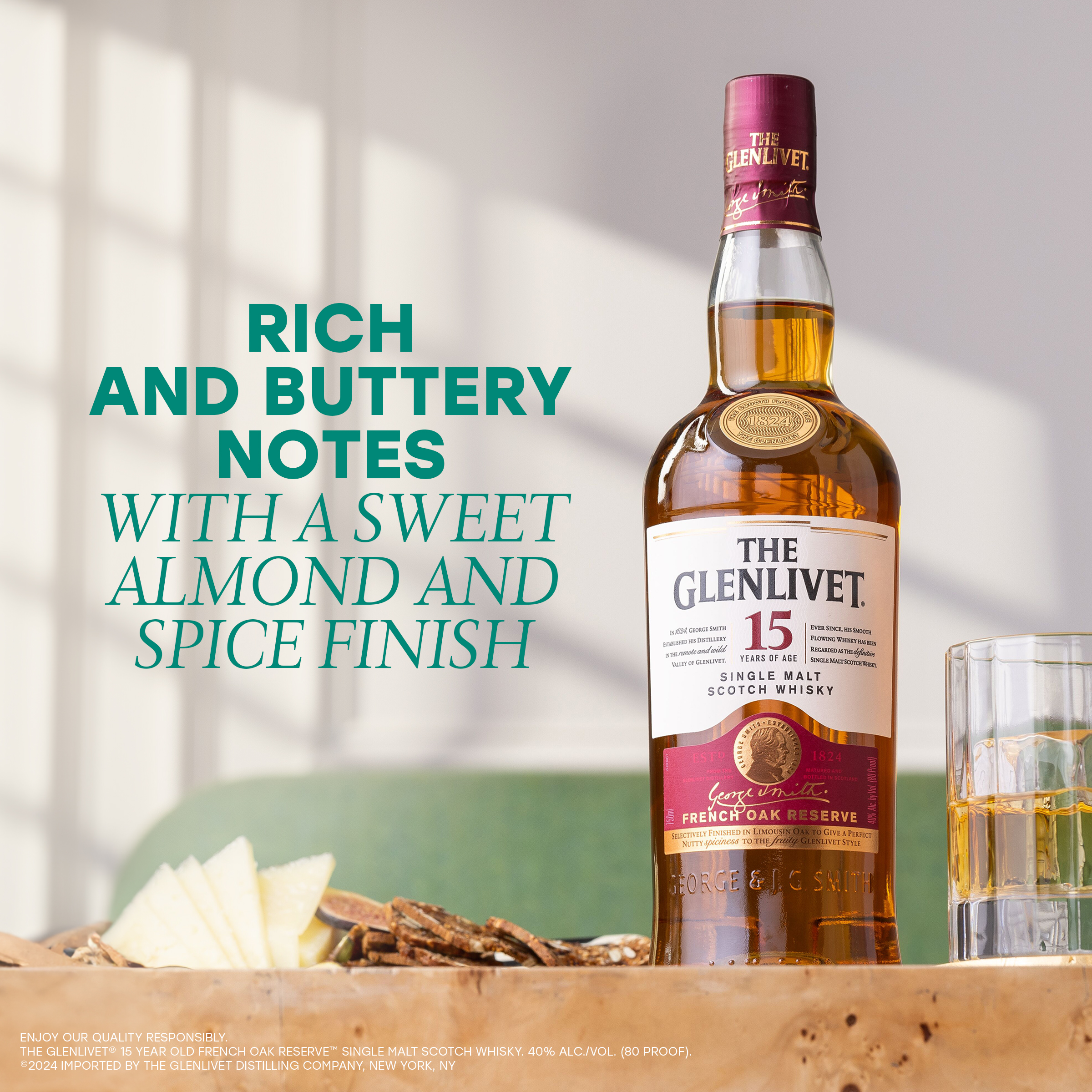 Product Title - Base 15 Year Old Single Malt Scotch Whisky Short Description The Glenlivet 15 Year Old gets its distinctively rich and exotic character from selective liquid matured in French Limousin oak casks. The low density in the cask's wood allows the whisky to sink deep into the wood and draw out rich, spice flavors. Long Description The Glenlivet 15 Year Old is a Single Malt Scotch Whisky with a sweet, incredibly smooth flavor and intense gold color. This distinctively rich Single Malt Scotch Whisky is selectively matured in French Limousin oak casks. The cask's wood is cut from France’s Dordogne region, which is known for making and maturing Cognac. Its low density allows the whisky to sink deep into the wood and draw out rich, spice flavors. On the nose, enjoy creamy and rich notes of toasted almond. Delivering round, sweet and incredibly smooth fruity and nutty flavors, this premium scotch whisky ends in a lingering, sweet almond and spicy finish. Enjoy this liquor neat or on the rocks. Pair The Glenlivet 15 Year Old with full-flavored venison dishes. Join us in continuing the vision of our founder, George Smith, as we break traditions, set new standards, and move things forward; opening up the world of single malt to all through exceptional casks, finishes, and unique serves. Enjoy Responsibly. Manufacturer Pernod Ricard Awards - GOLD, International Spirits Challenge 2022