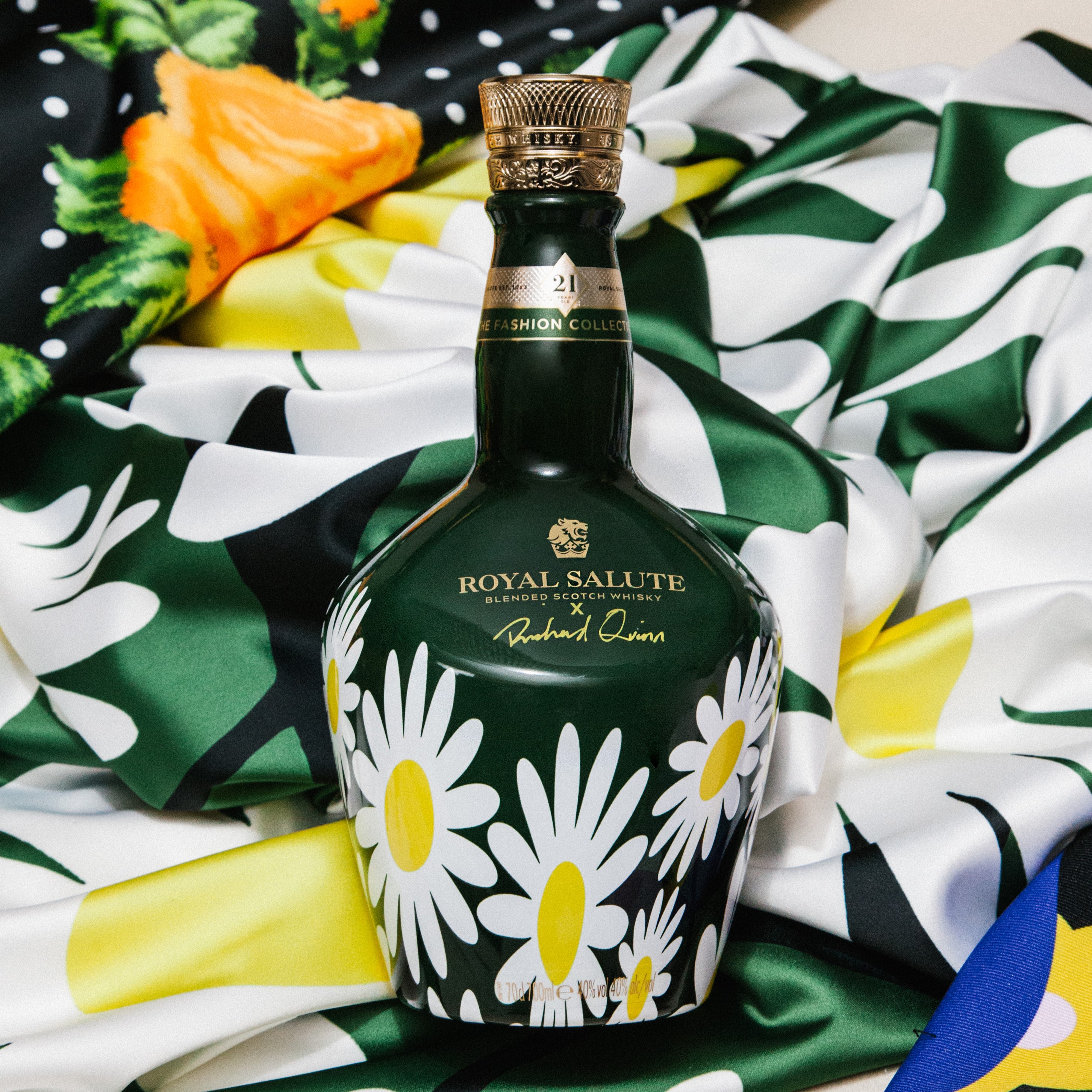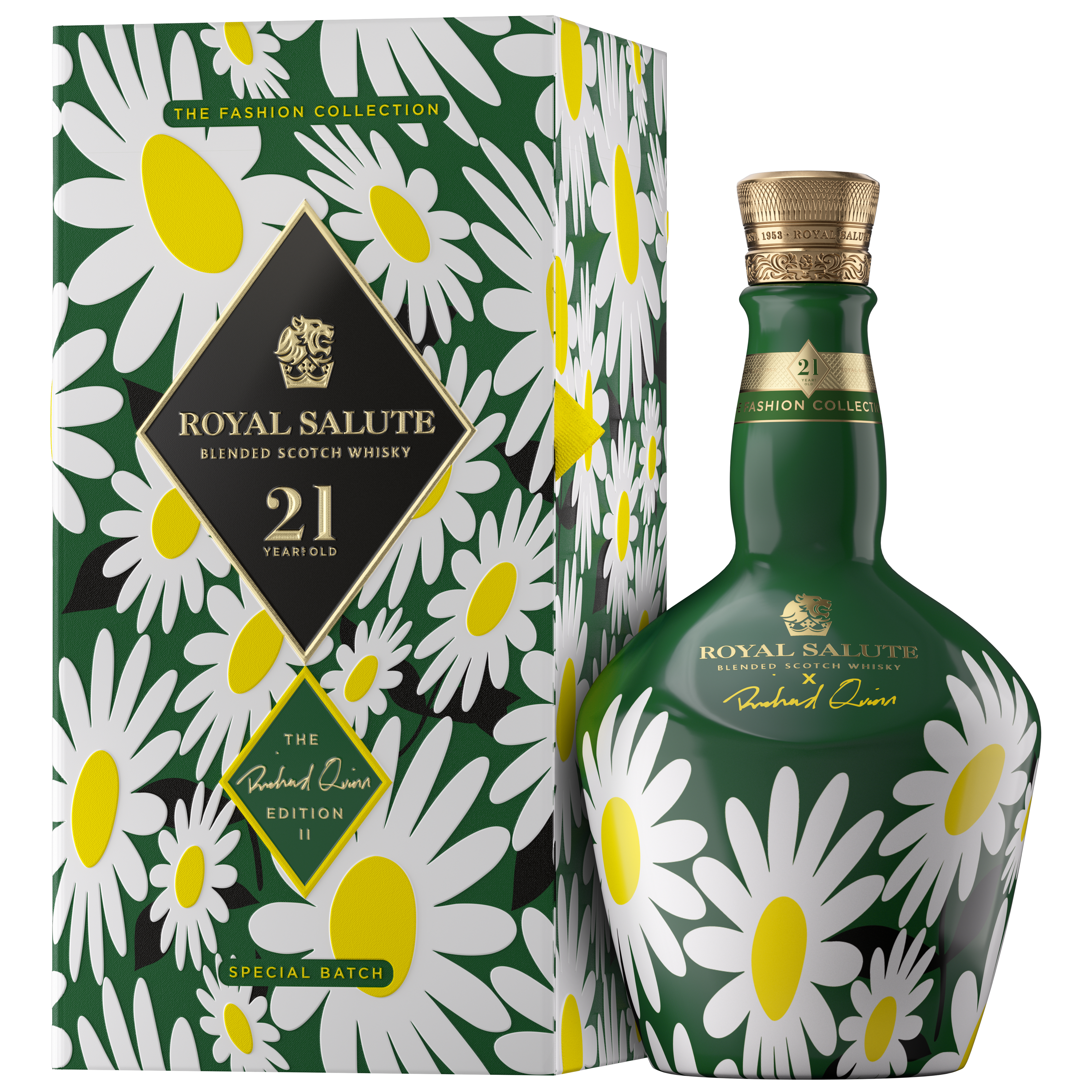 Product Title - Base 21 Year Old Fashion Edition, Blended Scotch Whisky, Daisy Bottle Long Description This new edition of Royal Salute 21 Year Old Blended Scotch Whisky, Richard Quinn is a further exploration into the many eclectic facets of Richard Quinn’s unique style and his love of traditional patterns. This bold design, energetic and contemporary in style, perfectly encapsulates Richard Quinn’s dedication to pushing the boundaries with his daring, innovative designs. A new and exquisite 21-Year-Old blend was meticulously co-created by Royal Salute Master Blender, Sandy Hyslop, and Richard Quinn himself in Strathisla distillery in Scotland. The finest Scotch whiskies from Braeval, Strathisla and Caperdonich distilleries were hand-selected and blended to reflect Richard’s personal palate, creating a balanced and opulent whisky with a remarkable depth of flavour. Meticulously sampling and selecting a range of the finest 21-year-old whiskies, the pair created the perfect balance of flavours to represent the depth and maturity of our ongoing partnership. Manufacturer Pernod Ricard Vineyard History Created in 1953 to commemorate the coronation of Queen Elizabeth II, Royal Salute’s iconic 21-Year-Old Signature Blend is named after the 21 Gun Salute fired at the Tower of London for royal celebrations. Royal Salute is the only Scotch Whisky where the product range begins at 21 years old. With an unwavering commitment to mastery in blending and bespoke packaging design, these exceptional Scotch Whiskies are housed in coated glass flagons or hand-blown crystal decanters. Brand ROYAL SALUTE GPC SPIRITS Last Updated Date 2025-05-20 Product ID RS FASHION 2 DAISY 6/700US Product Line Description ROYAL SALUTE OTHER