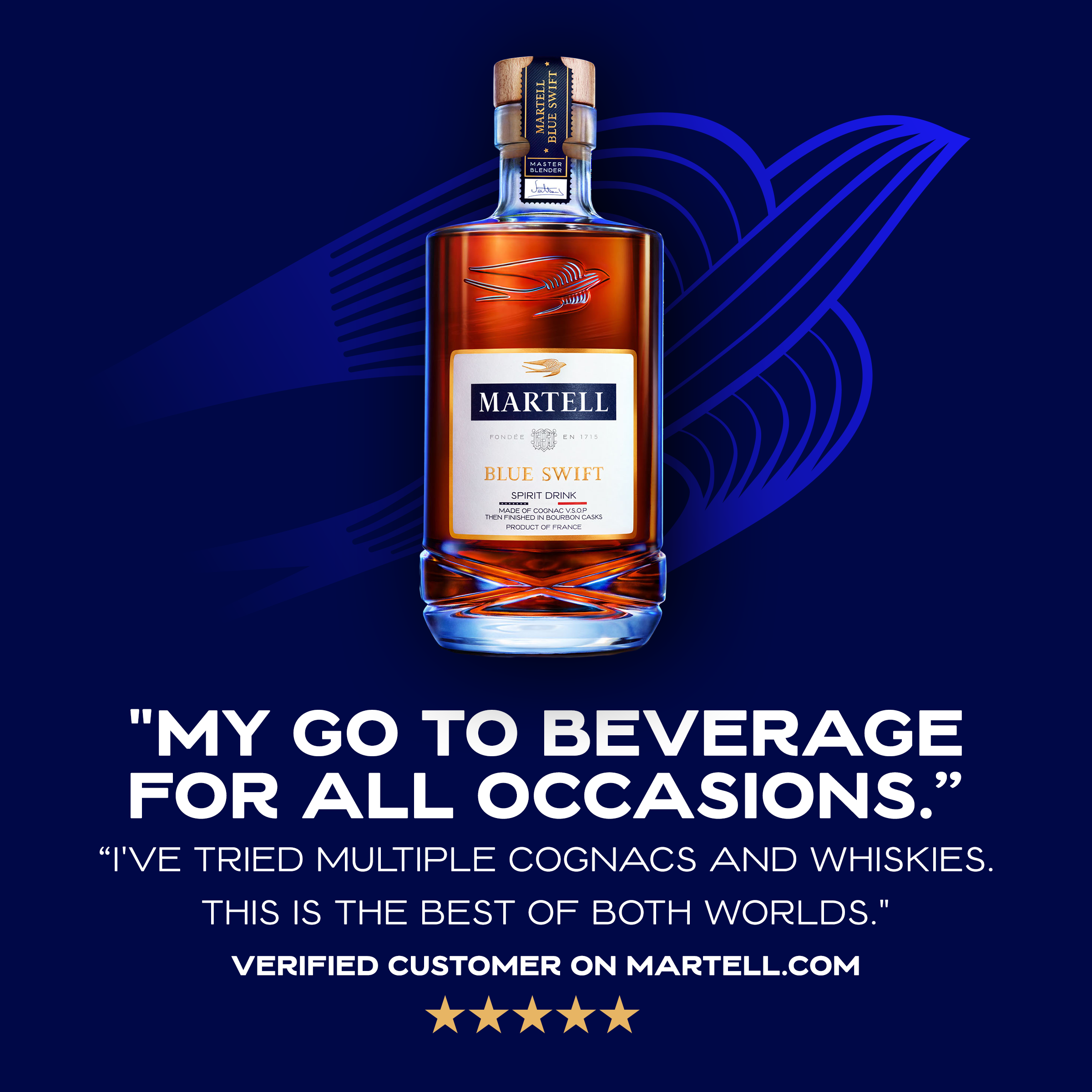 Product Title - Base Blue Swift Cognac Spirit Short Description An audacious combination, Martell Blue Swift is the first-ever VSOP cognac finished in bourbon casks. Hints of plum and candied fruits mix with the subtle sweetness of vanilla and toasted oak from the casks for a one-of-a-kind flavor and singularly smooth taste. Long Description After 300 years of renowned expertise, Maison Martell dared to redefine long established and respected traditions in pursuit of one exceptionally smooth spirit. An audacious combination, Martell blue swift is made of 100% VSOP cognac and then aged in bourbon barrels for a notably smoother finish – making it the perfect addition in any cocktail. Enjoy Martell Blue Swift neat, over ice, or in a cocktail like a Swift Old Fashioned. Defy Expectations with Martell Blue Swift. Enjoy Responsibly. Manufacturer Pernod Ricard Awards - Double Gold, San Francisco World Spirits Competition, 2022