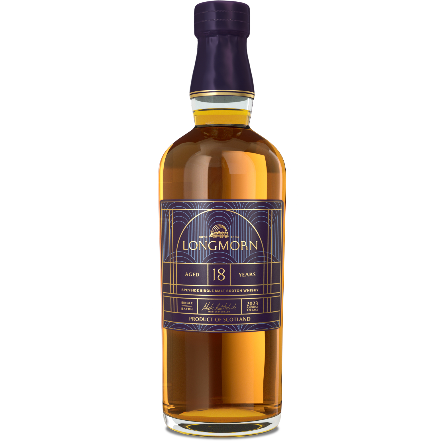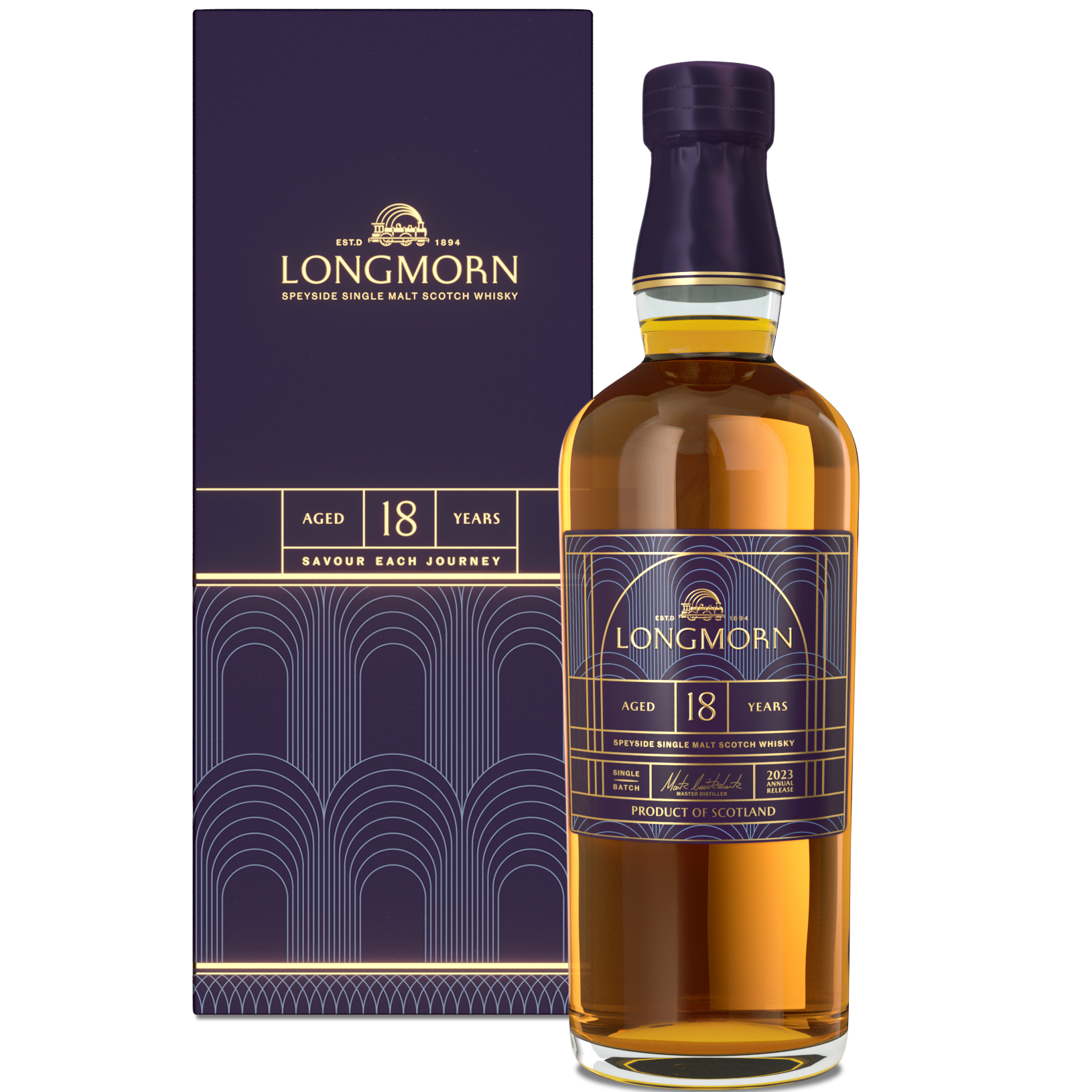 - LUXURIOUS PACKAGING: Longmorn’s luxurious packaging harks back to its heritage and John Duff’s original railway, featuring vibrant golden arches representative of train tunnels and bridges, layered on a deep purple background