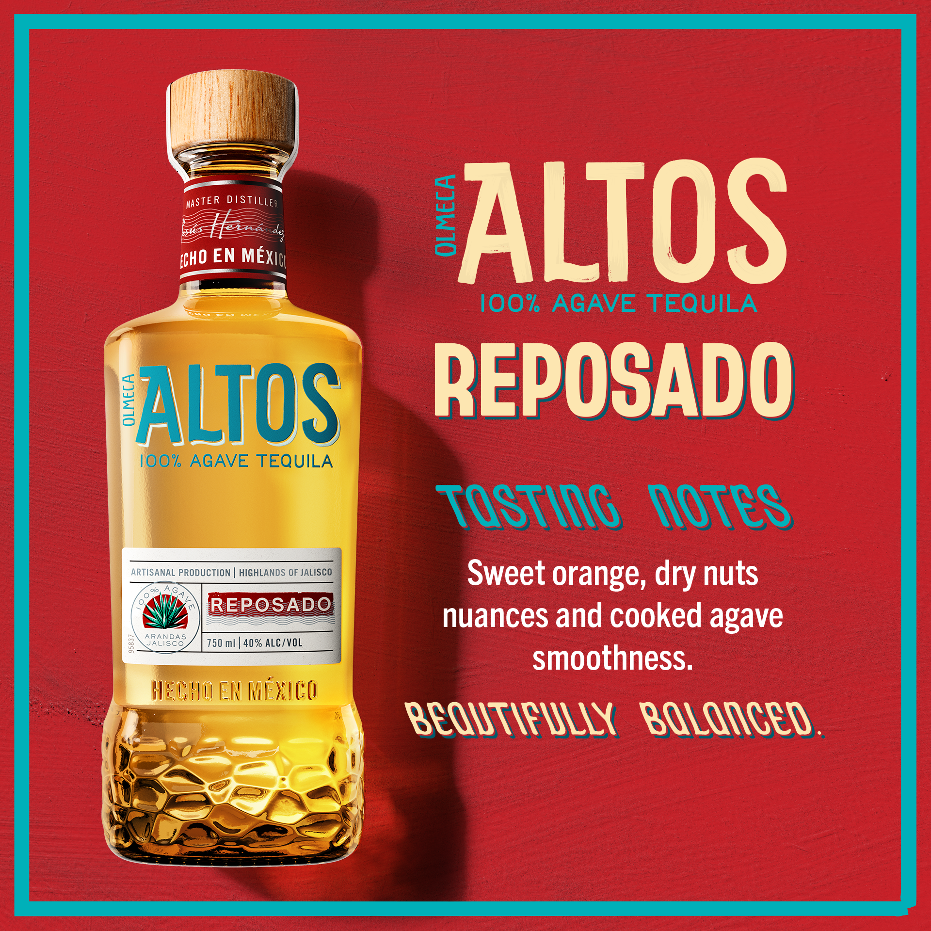 Product Title - Base Reposado Tequila Short Description Altos Reposado is the perfect drink to kick back and relax. Pairing traditional flavors such as citrus, oak, cooked agave, and vanilla, with notes of nutmeg and allspice, Altos Reposado is a high-quality tequila with a crisp finish. Long Description Reposado means "restful" in Spanish, and Altos Reposado is the perfect drink to kick back and relax. Pairing traditional flavors such as citrus, oak, cooked agave, and vanilla, with notes of nutmeg and allspice, Altos Reposado is a high-quality tequila with a crisp finish. Altos Reposado is made from 100 percent blue agave grown in the state of Jalisco, Mexico, and is aged for six to eight months in barrels once used for whiskey, adding a unique flavor to every sip. With hints of orange peel, caramel, and smoke, this 40 percent ABV tequila is delicious alone, but will also steal the show as the star ingredient in your next batch of Margaritas. Every bottle of this high-quality tequila is crafted in a small batch, with each barrel holding no more than 20,000 liters, and unlike other tequilas, Altos Reposado contains only cultivated yeast, giving it a smooth and delicious flavor. Manufacturer Pernod Ricard Product History Created in 2009, our Maestro Tequilero Jesús Hernández teamed up with two of the world´s most recognized bartenders: Henry Besant and Andrés Masso to create Altos tequila. Searching for a 100% agave tequila for craft cocktails at an affordable price, they created a high quality, agave-rich tequila good enough to sip or to mix in a cocktail. Brand ALTOS TEQUILA GPC SPIRITS Last Updated Date 2025-06-25 Product ID OLMECA ALTOS REP80 12/375 18US Product Line Description ALTOS REPOSADO