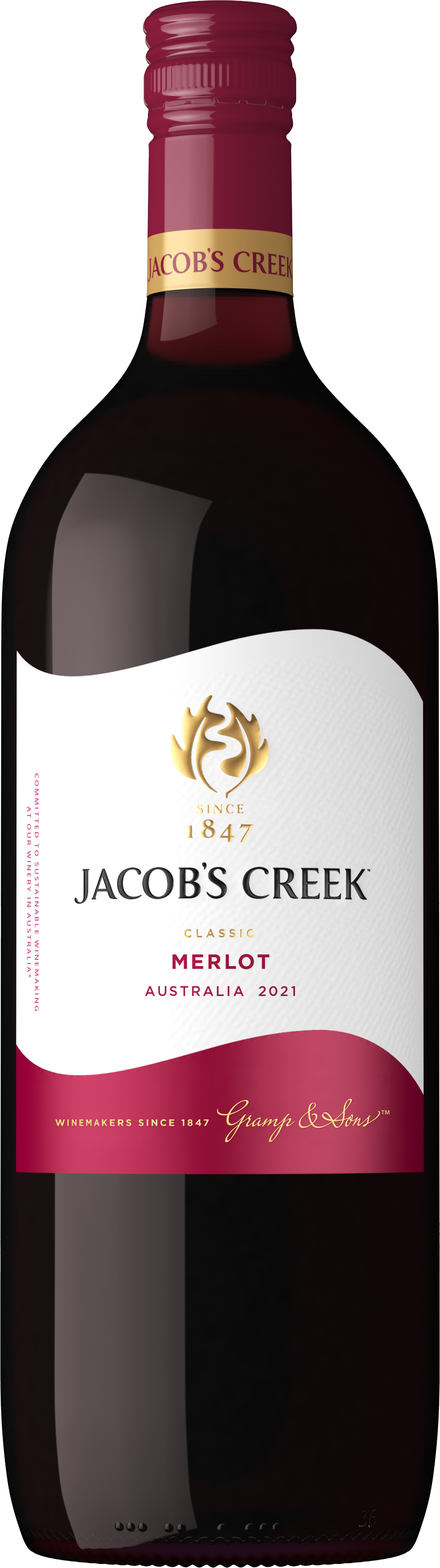 Product Title - Base Classic Merlot Red Wine Short Description A modern Australian Classic – showcasing merlot's varietal purity with a soft, enjoyable finish. It has great lift with concentration of varietal spice and savory red fruits. This red wine is medium bodied with dried cranberry and ripe strawberry juiciness that flows generously into plush tannins. Long Description A modern Australian Classic – showcasing varietal purity with a soft, enjoyable finish. This Merlot is deep garnet with a bright purple, red hue. On the nose, there is great lift and concentration of varietal spice and savory red fruits with a medium bodied palate and mouth filling dried cranberry and ripe strawberry juiciness that flows generously into structural, plush tannins. Pairs well with pizza or pasta, barbequed meats, vegetable stew or blue cheese. 13.9% alcohol by volume, 1.5L bottle. TA 5.9g/L, pH 3.47, G/F 4.4g/L Manufacturer Pernod Ricard Vineyard History In 1847, along the banks of Jacob’s Creek, Johann Gramp planted his first vineyard. His vision was to create great tasting wines that reflect the true character of the grapes and the land. To this day we live and breathe this vision by producing wines that showcase how each grape variety expresses itself when shaped by the soil and the sun of Australia. In over 160 years of heritage, Jacob's Creek has won almost 7,000 awards. Product History In 1847, along the banks of Jacob’s Creek, Johann Gramp planted his first vineyard. His vision was to create great tasting wines that reflect the true character of the grapes and the land. To this day we live and breathe this vision by producing wines that showcase how each grape variety expresses itself when shaped by the soil and the sun of Australia. To care for the environment in which we operate, Jacob's Creek is also the first large Australian company to use 100% renewable electricity. Brand JACOBS CREEK GPC STILL WINE Last Updated Date 2025-09-18 Product ID JC MRLT 28 NP 6/1.5L US Product Line Description JACOBS CREEK CLASSIC