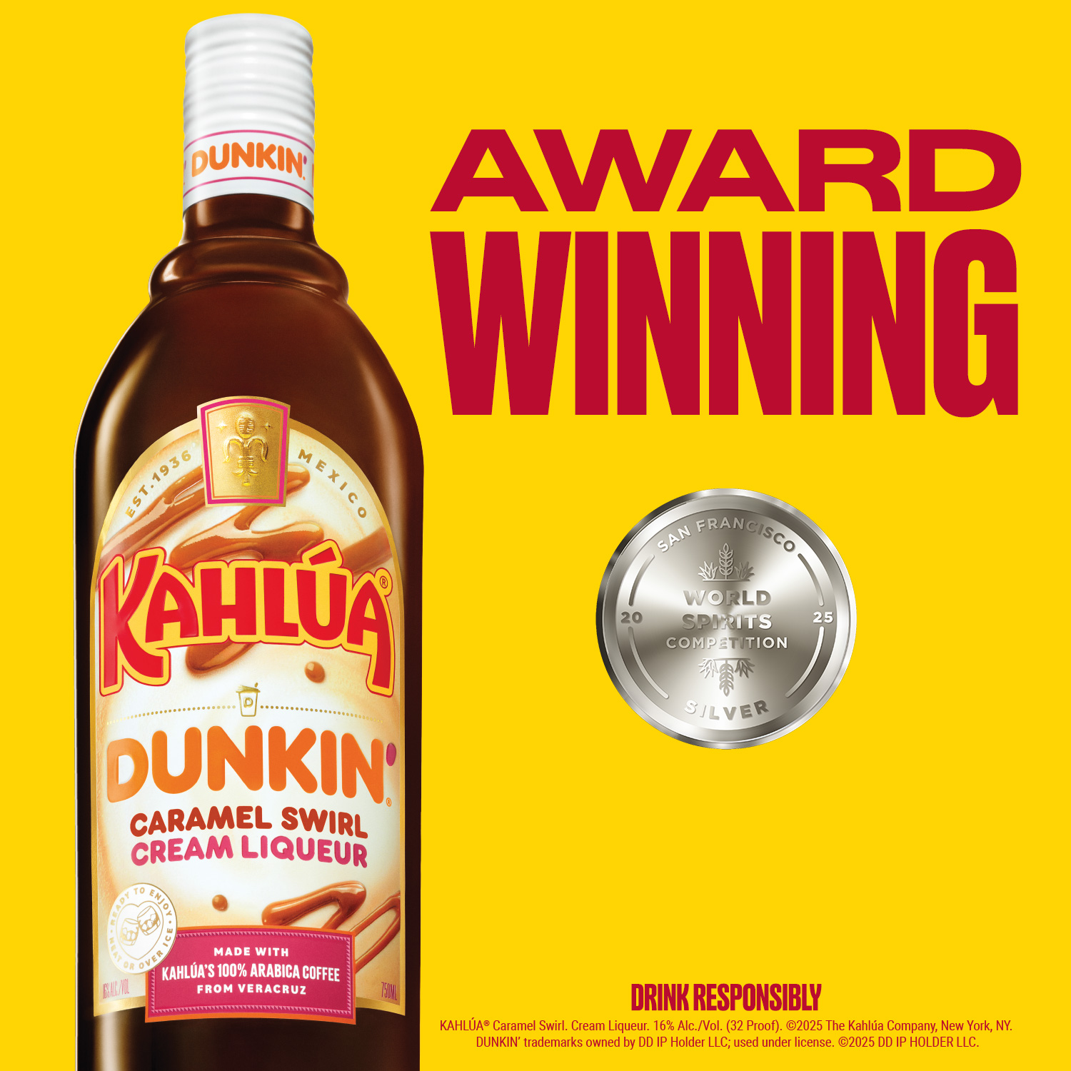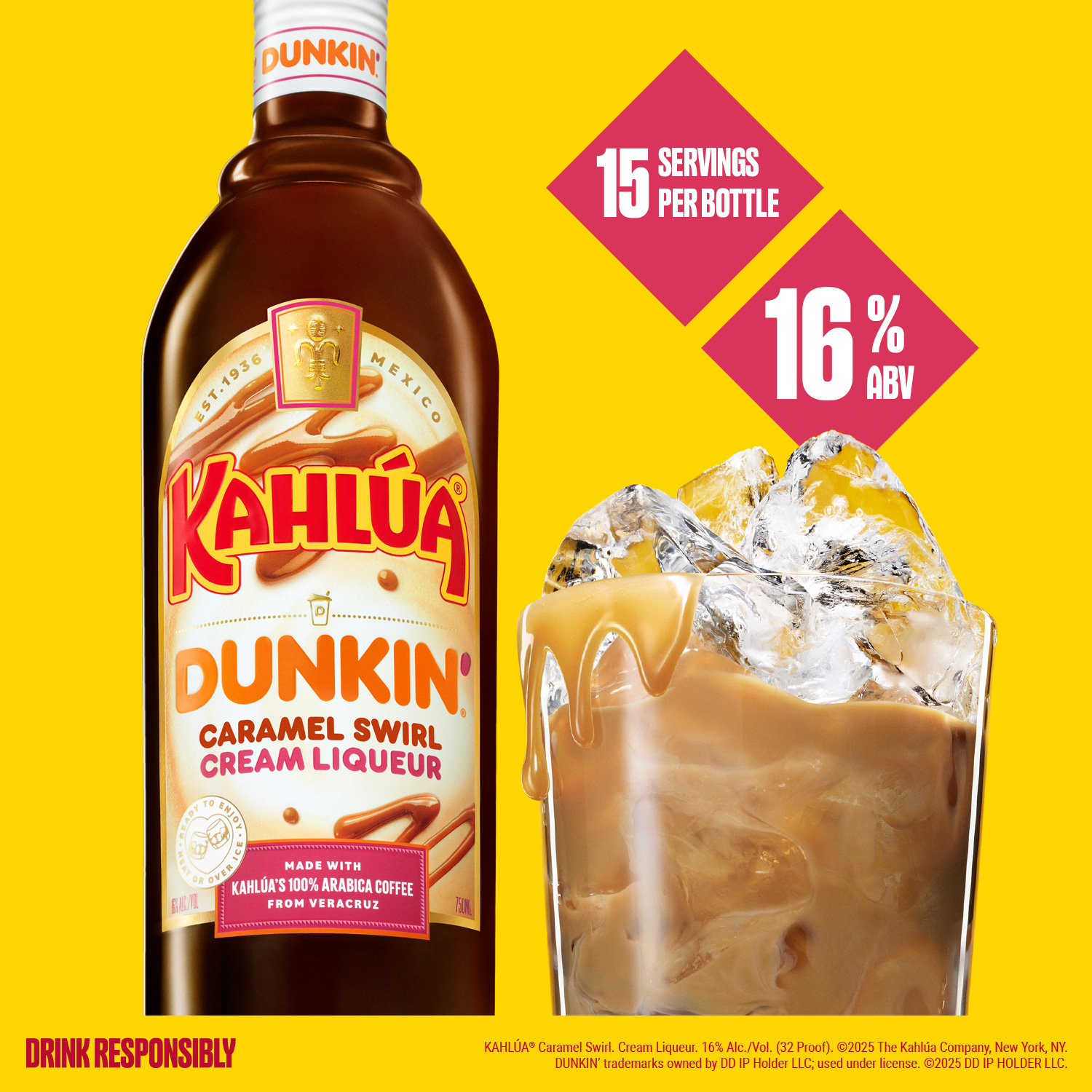 Product Title - Base Dunkin' Caramel Swirl Coffee Liqueur Short Description We Dunkin did it! Treat yourself and give Kahlua with a Dunkin swirl a whirl, a delicious, velvety, and creamy liqueur blending the iconic Dunkin Caramel Swirl flavor with real cream, 100% Arabica coffee, and a generous splash of rum. Kahlua Dunkin Cream Liqueur really is a cream come true. Ready, set, indulge! Long Description We Dunkin did it! Experience a smooth, playful and decadent flavor sensation that’s sure to tantalize your taste buds, give Kahlua with a Dunkin swirl a whirl. Kahlua Dunkin' Cream Liqueur is a rich, velvety cream liqueur that combines Dunkin’s #1 selling swirl flavor with real cream, 100% Arabica coffee, and Premium Rum. The result is a perfectly balanced caramel swirl, with a rich and sweet aroma of toffee, vanilla, and dulce de leche, harmoniously blended with hints of coffee and chocolate, and notes of rum, coconut and oak for a sophisticated finish. This full-bodied liqueur is equally enjoyable chilled, neat, or over ice, making it ideal for a cozy night in or for adding a special touch to your dinner parties, it’s truly a cream come true. Ready, set, indulge! Manufacturer Pernod Ricard Awards Silver Medal SFWSC Brand KAHLUA LIQUEUR GPC SPIRITS Last Updated Date 2025-08-06 Product ID KAH DUNKIN 32 120/50 US Product Line Description KAHLUA DUNKIN