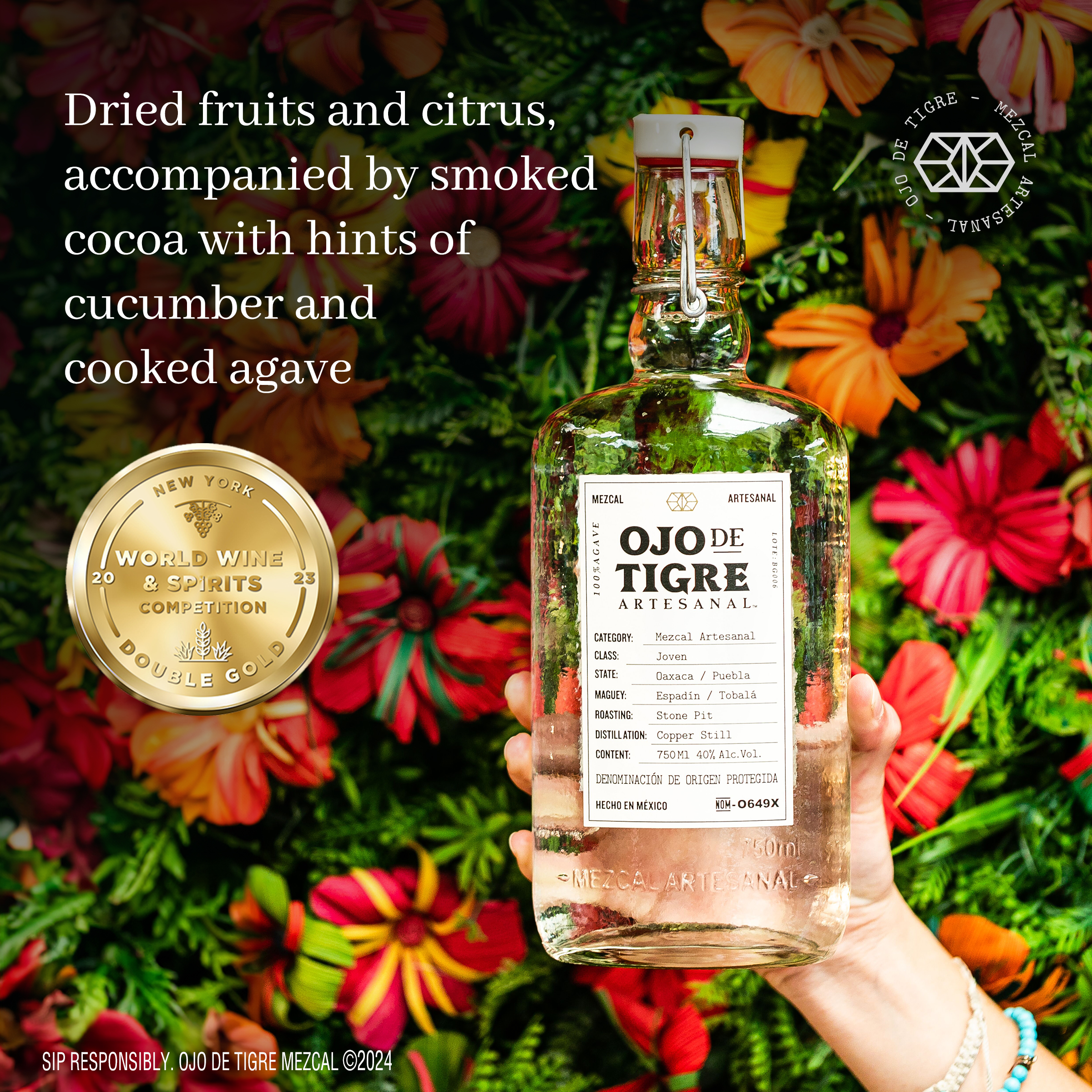 Product Title - Base Mezcal Artesanal Long Description Ojo De Tigre Mezcal Artesanal is an artisanal mezcal from Mexico that delivers an approachable, versatile and well-balanced flavor profile. This mezcal is crafted from two sustainably cultivated agaves, combining the savory flavors of Espadin from Oaxaca with the herbal complexity of Tobala from Puebla. The result is a sweet, smoky mezcal with notes of caramel and dried fruits. Launched in Mexico in 2018 and the United States in 2020, this 100% Mexican artisanal mezcal was created by founder Luis Gerardo Mendez and Casa Lumbre. Enjoy this liquor neat or in a variety of cocktails and alcohol drinks like an Oaxaca Old Fashioned or Mezcal Mule. Ojo de Tigre Mezcal was awarded Gold at Spirits Business Tequila & Mezcal Masters 2022, Gold at IWSC Awards 2022, Gold at World Spirits Competition San Francisco 2022, and Platinum at SIP Awards 2022. Discover why Ojo De Tigre is the Mezcal for All. Enjoy responsibly. Manufacturer Pernod Ricard Brand OJO DE TIGRE MEZCAL GPC SPIRITS Last Updated Date 2024-02-13 Product ID 7503035530007 Product Line Description OJO DE TIGRE JOVEN