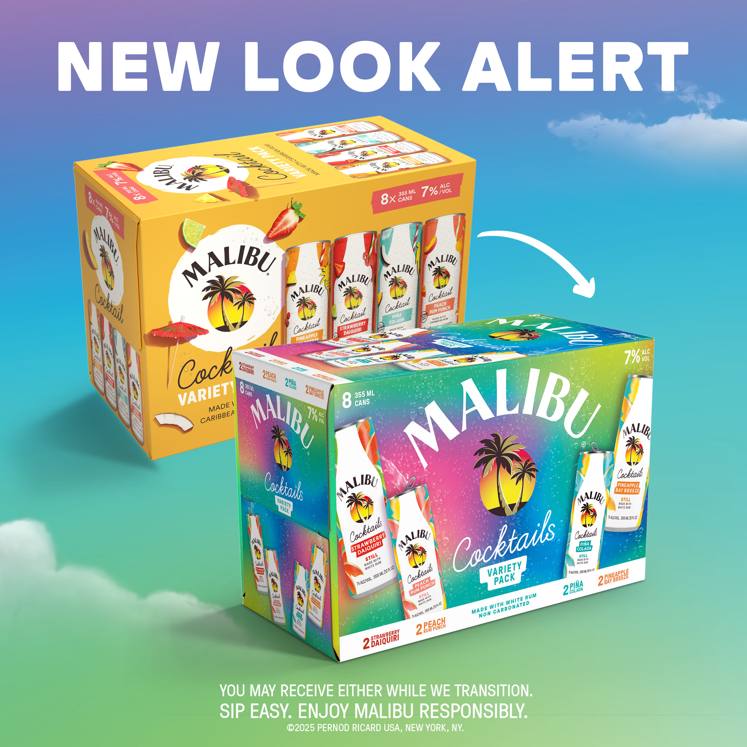 Product Title - Base Ready to Drink Cocktail Variety Pack Short Description Enjoy the delicious and refreshing taste of the ready-to-sip Malibu Variety Pack, including flavors like Pineapple Bay Breeze, Pina Colada, Strawberry Daquiri and Peach Rum Punch, all in convenient and sleek 12 oz cans that are perfect for your next hangout. Long Description Enjoy the delicious and refreshing taste of the ready-to-sip Malibu Variety Pack, including flavors like Pineapple Bay Breeze, Pina Colada, Strawberry Daquiri and Peach Rum Punch, all in sleek 12 oz cans. Whether you're enjoying the tangy taste of sweet peaches, juicy pineapple, strawberry or coconut, these premixed cocktails are perfect for your next hangout, offering the signature flavor of Malibu in your favorite cocktails on the go. Each Malibu Variety Pack contains two cans of each flavor. Manufacturer Pernod Ricard Brand MALIBU RUM CANS GPC SPIRITS Last Updated Date 2025-08-14 Product ID MALI RTDVRPCK24/355 3X8CNWRUS* Product Line Description MALIBU COMBOS RTD CKTL