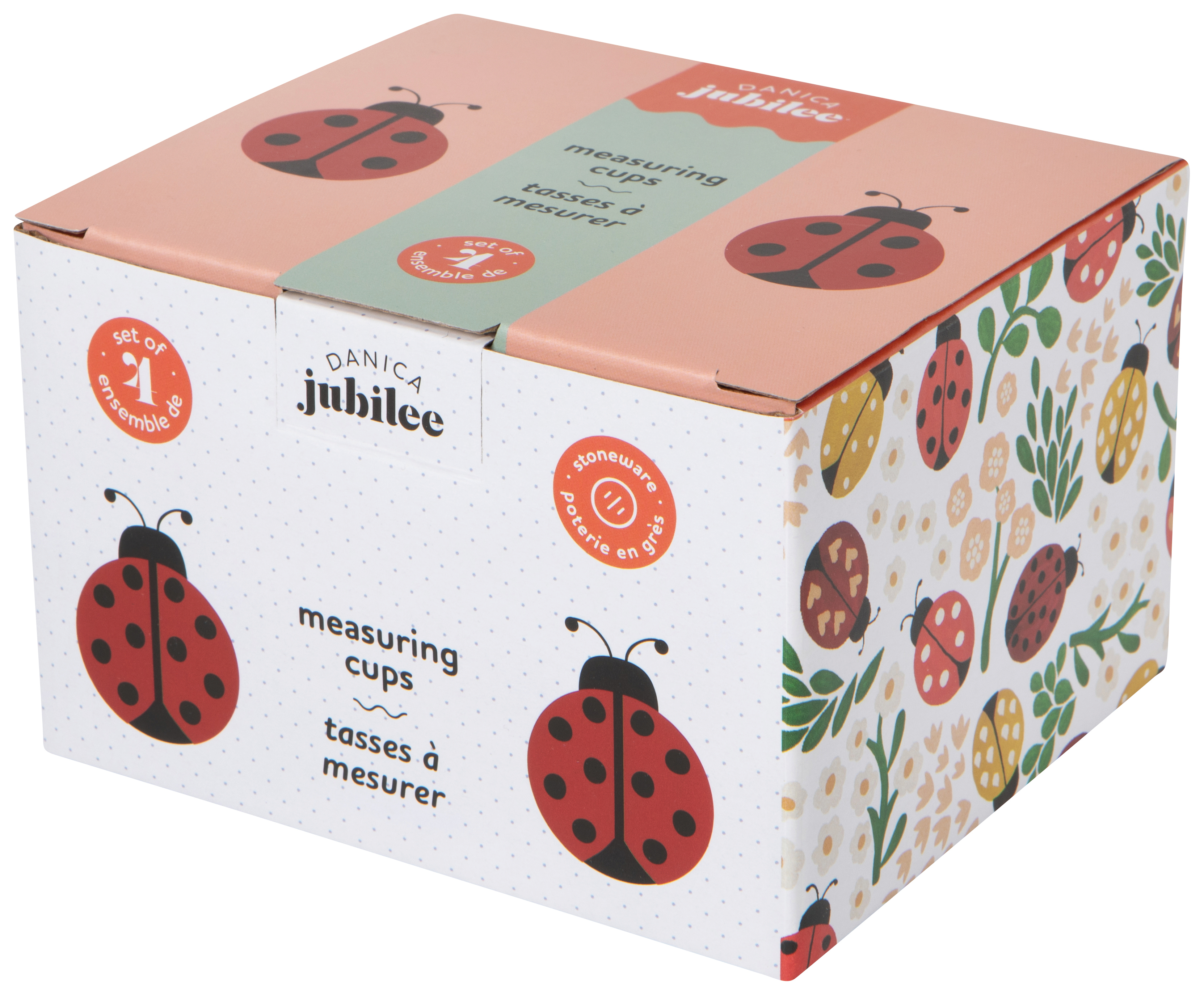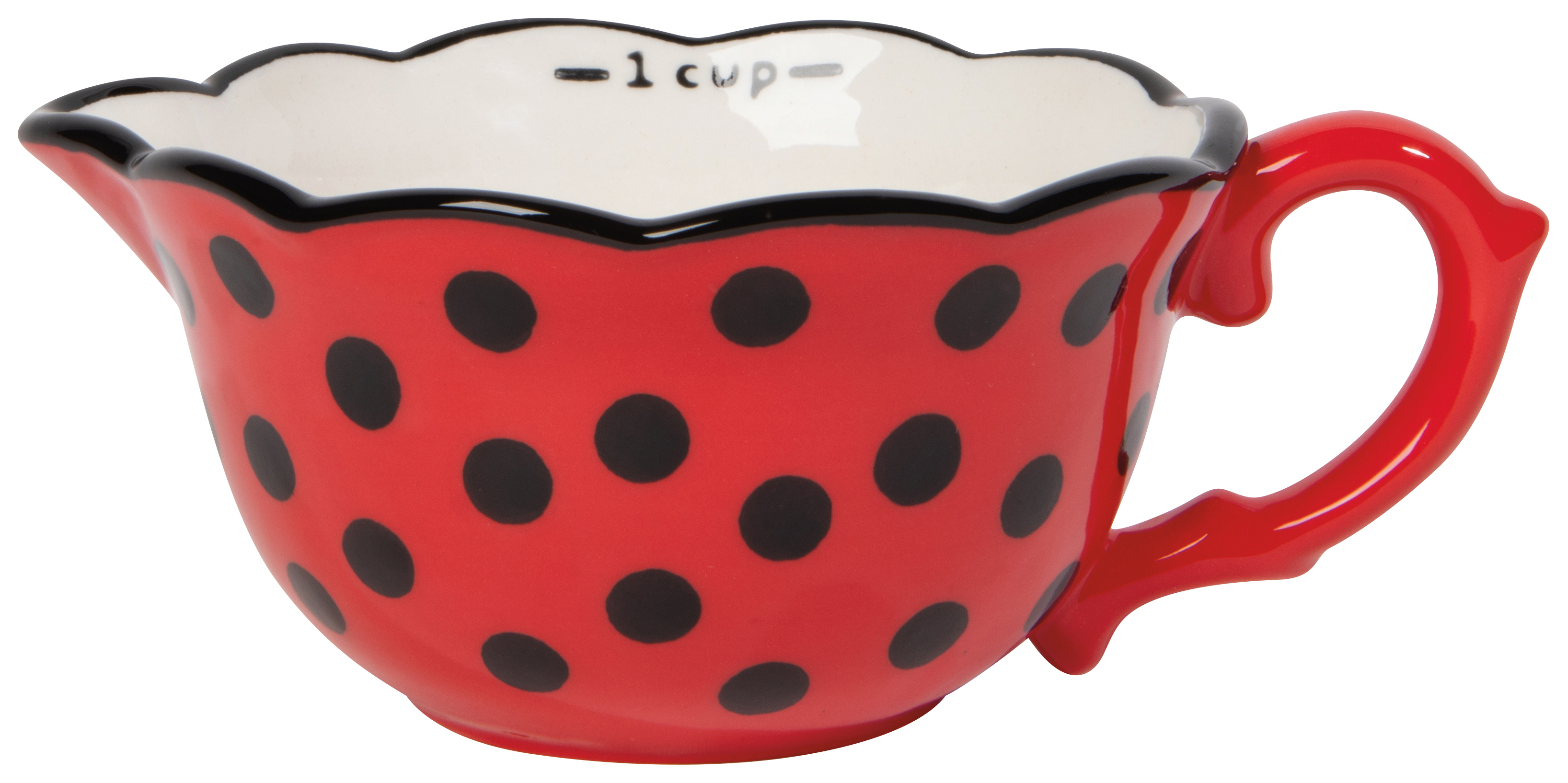 - Steeped in style, our teacup-inspired ceramic Ladybugs measuring cups sweeten up baking time with hand-painted details and scalloped rims. It's spot on for summer! Our Ladybugs collection is bright, bold, and dotted with whimsy, making it a bug deal for any sunny day. Dimensions: 1/4 Cup / 1/3 Cup / 1/2 Cup / 1 Cup Material: 100% Stoneware Care Instructions: Dishwasher and microwave safe.