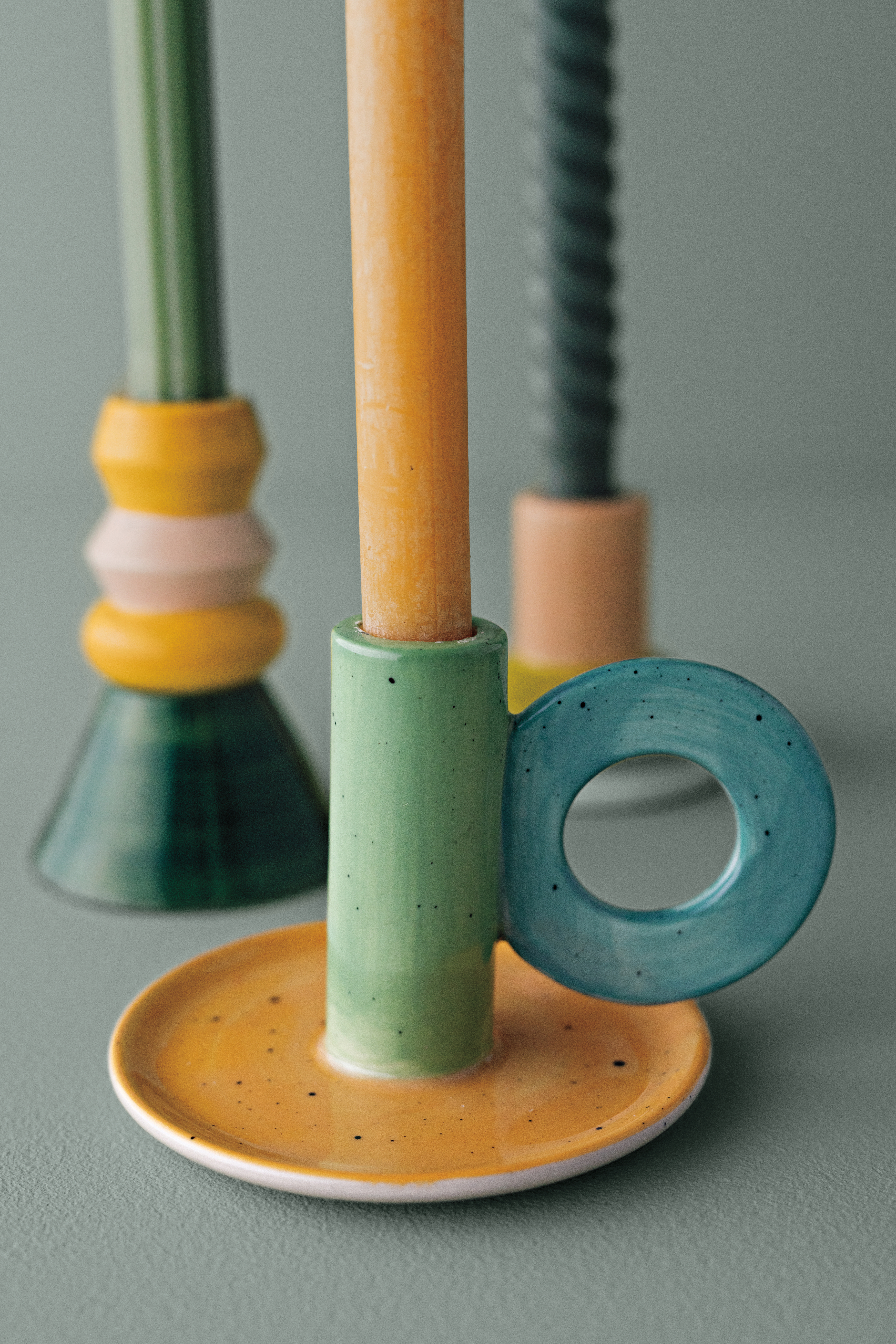 - Color-blocked and sculpted, our Disco Candle Holder offers an outstanding display for candlelit occasions or evenings of quiet contemplation. Allowing personal expression to shine, from the Formation collection, this design gives shape to the wonder we feel for vibrant colors creating a stunning centerpiece. Dimensions: W4 x L5.25 x H4in Material: 100% Stoneware Care Instructions: Hand wash only.