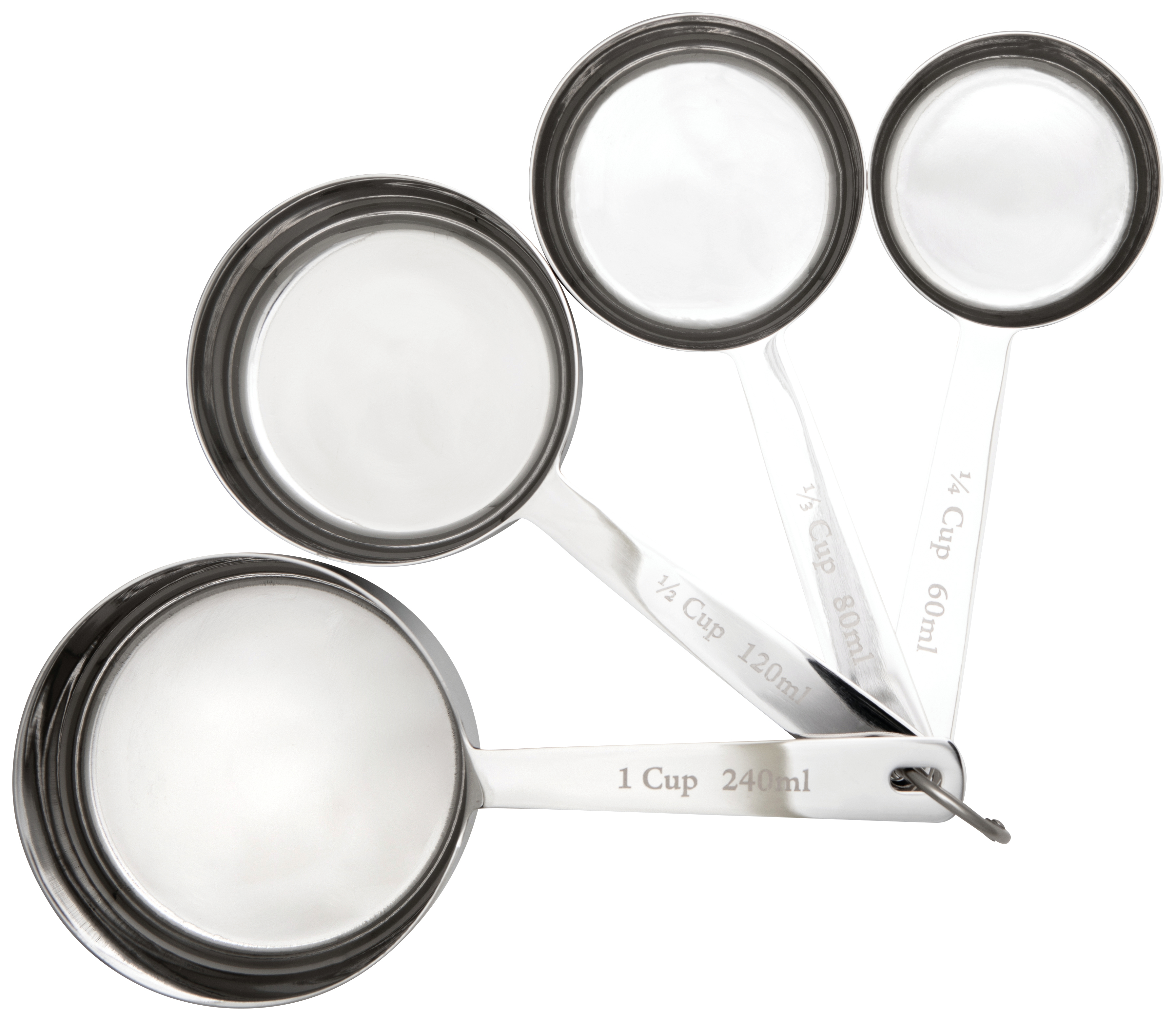 - Crafted from high-quality stainless steel, each set of measuring cups offers four precise, standard measures. Streamlined silhouettes bring functional elegance to timeless tools. Dimensions: 1/4 Cup / 1/3 Cup / 1/2 Cup / 1 Cup Material: 100% Stainless Steel Care Instructions: Dishwasher safe.