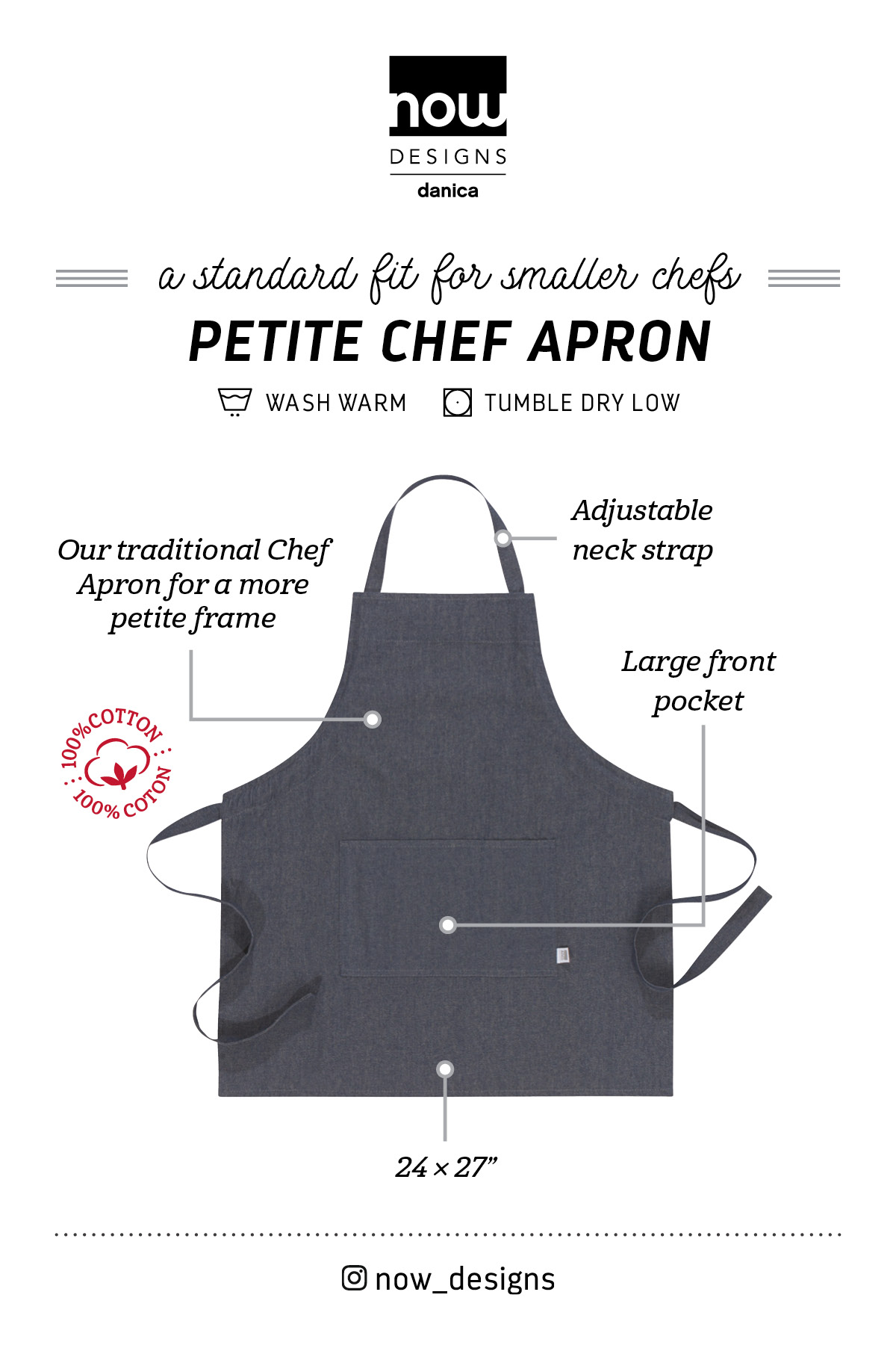 - Thrill the gifted young connoisseur cook with this handsome red and black Buffalo Check Petite Chef Apron from Now Designs. Specifically designed for junior chefs and featuring a boxy cut that’s perfect for teens, our petite chef apron features a 100% cotton construction for durability and comfortable wear. Dimensions: W24 x L27in Material: 100% Cotton Care Instructions: Machine wash cold, tumble dry on low setting.