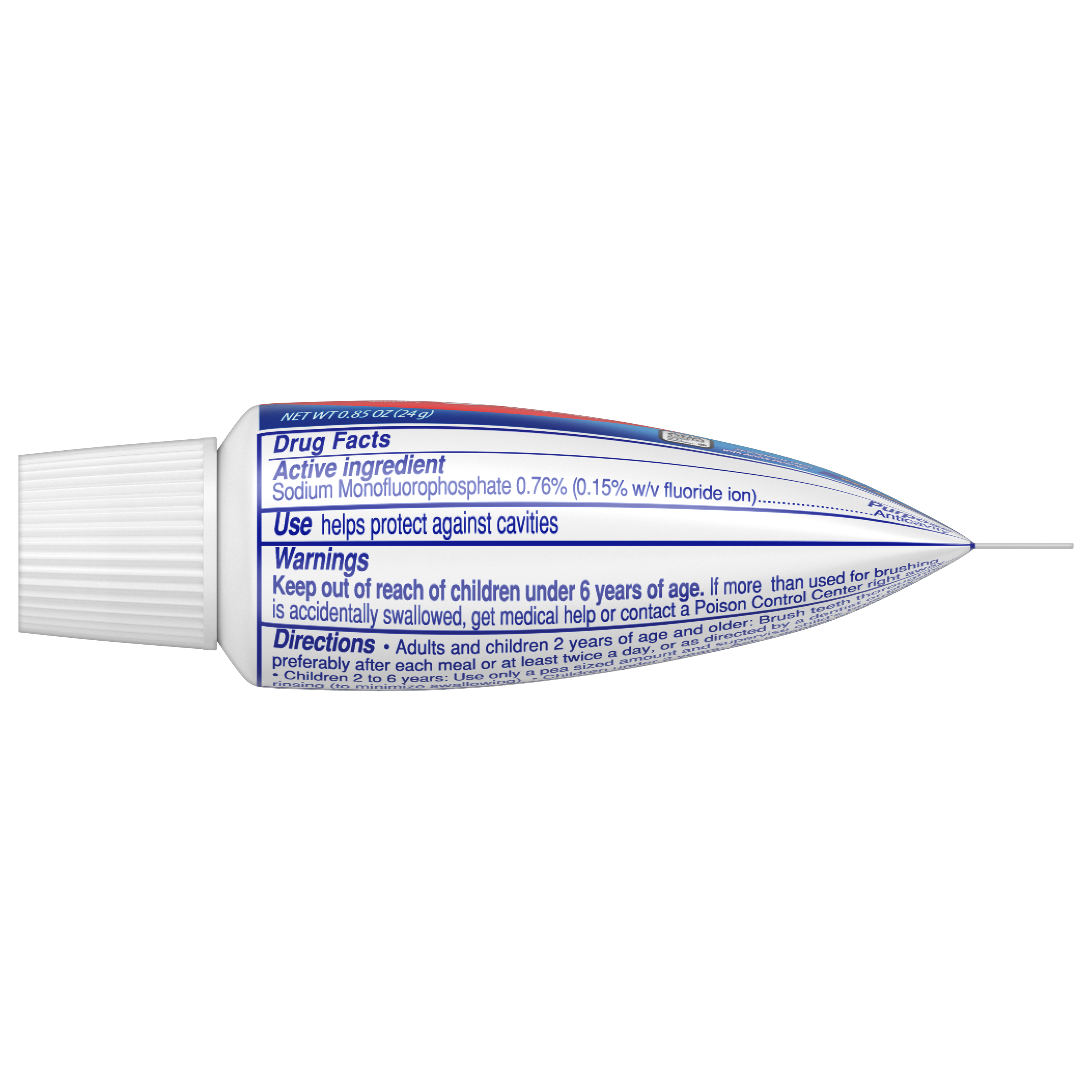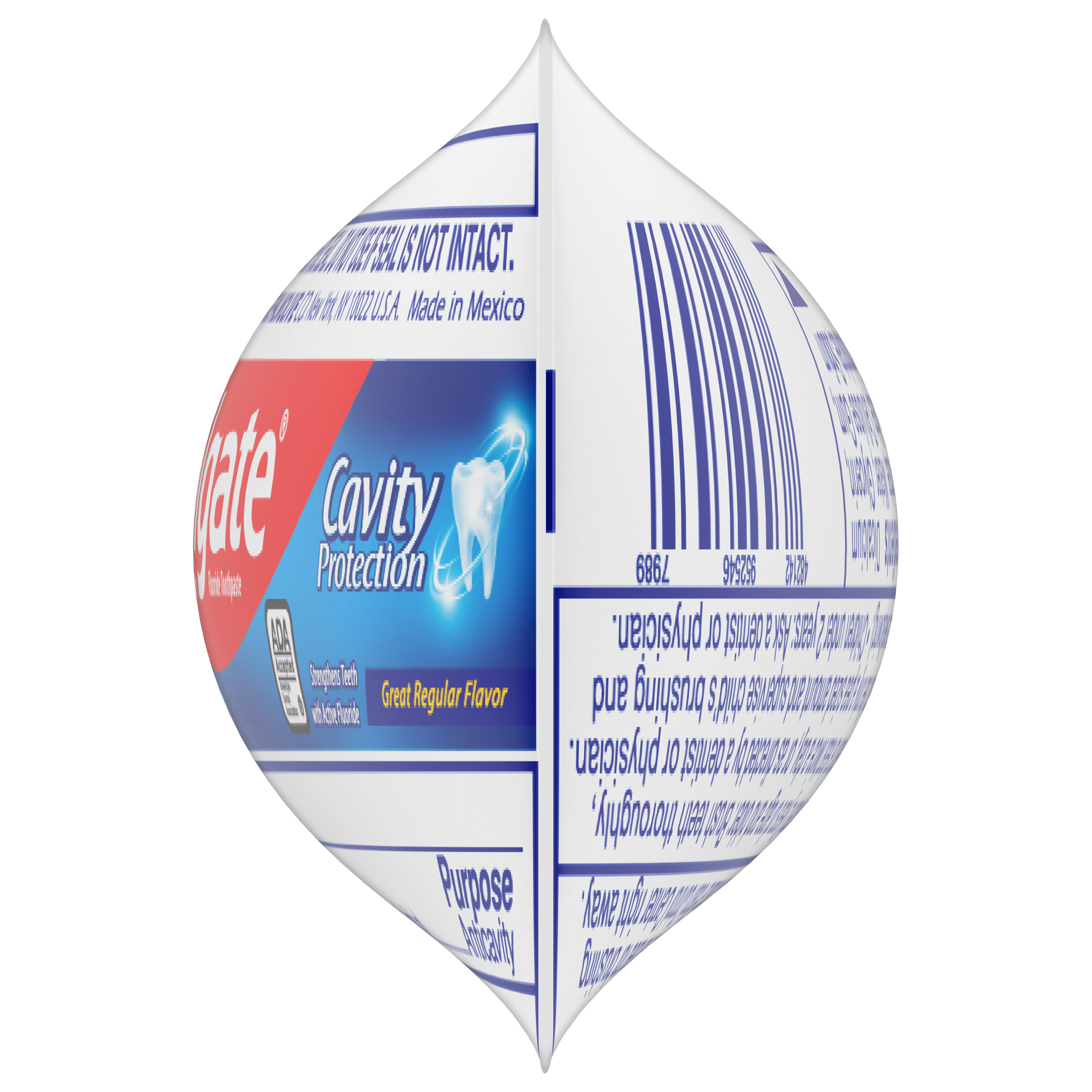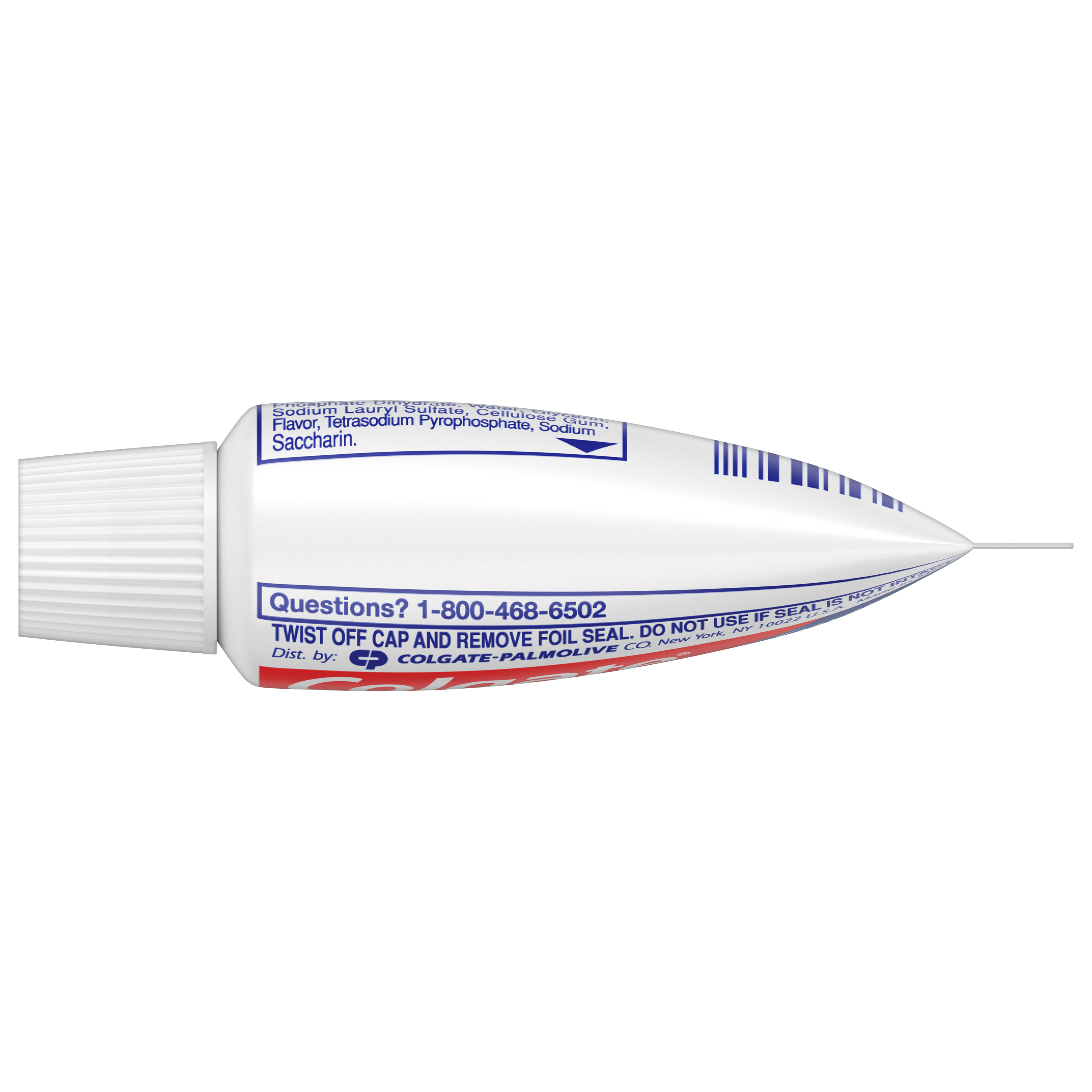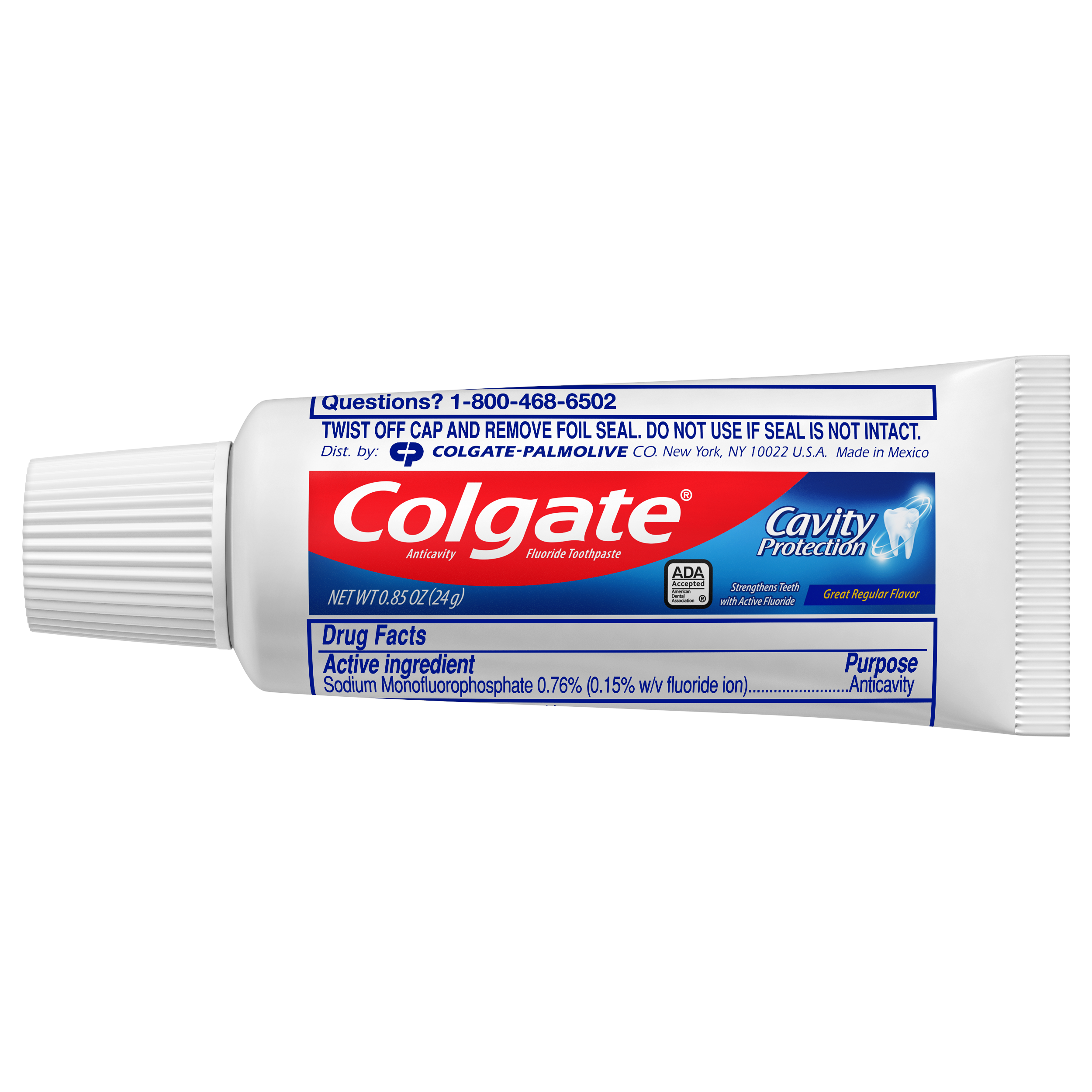 SKU 109782 Consumer Unit - GTIN 00035000502001 Case - GTIN 00035000097828 Product Category Oral Care Product Sub Category Toothpaste Product Equity (Brand) Colgate Product Sub Brand Colgate Maximum Cavity Protection TP Product Title Colgate Cavity Protection Travel Toothpaste with Fluoride, Great Regular Flavor - 0.85 Ounce Product Description Colgate Cavity Protection Toothpaste with Fluoride provides trusted cavity protection for the entire family. Formulated with active fluoride, this toothpaste is clinically proven to help strengthen teeth and leave your mouth feeling fresh and clean. This Colgate toothpaste is ADA (American Dental Association) accepted. It has been trusted by dentists and parents globally for over 45 years. eCommerce Copy- Long Description Colgate Cavity Protection Toothpaste with Fluoride provides trusted cavity protection for the entire family. Formulated with active fluoride, this toothpaste is clinically proven to help strengthen teeth and leave your mouth feeling fresh and clean. This Colgate toothpaste is ADA (American Dental Association) accepted. It has been trusted by dentists and parents globally for over 45 years. Bullet 1 Fluoride toothpaste fights cavities Bullet 2 Cleans teeth thoroughly Bullet 3 Strengthens teeth enamel with active fluoride Bullet 4 Great Mint Taste Bullet 5 Anticavity fluoride toothpaste Active Ingredients Sodium Monofluorophosphate 0.76 % (0.15% w/v fluoride ion)