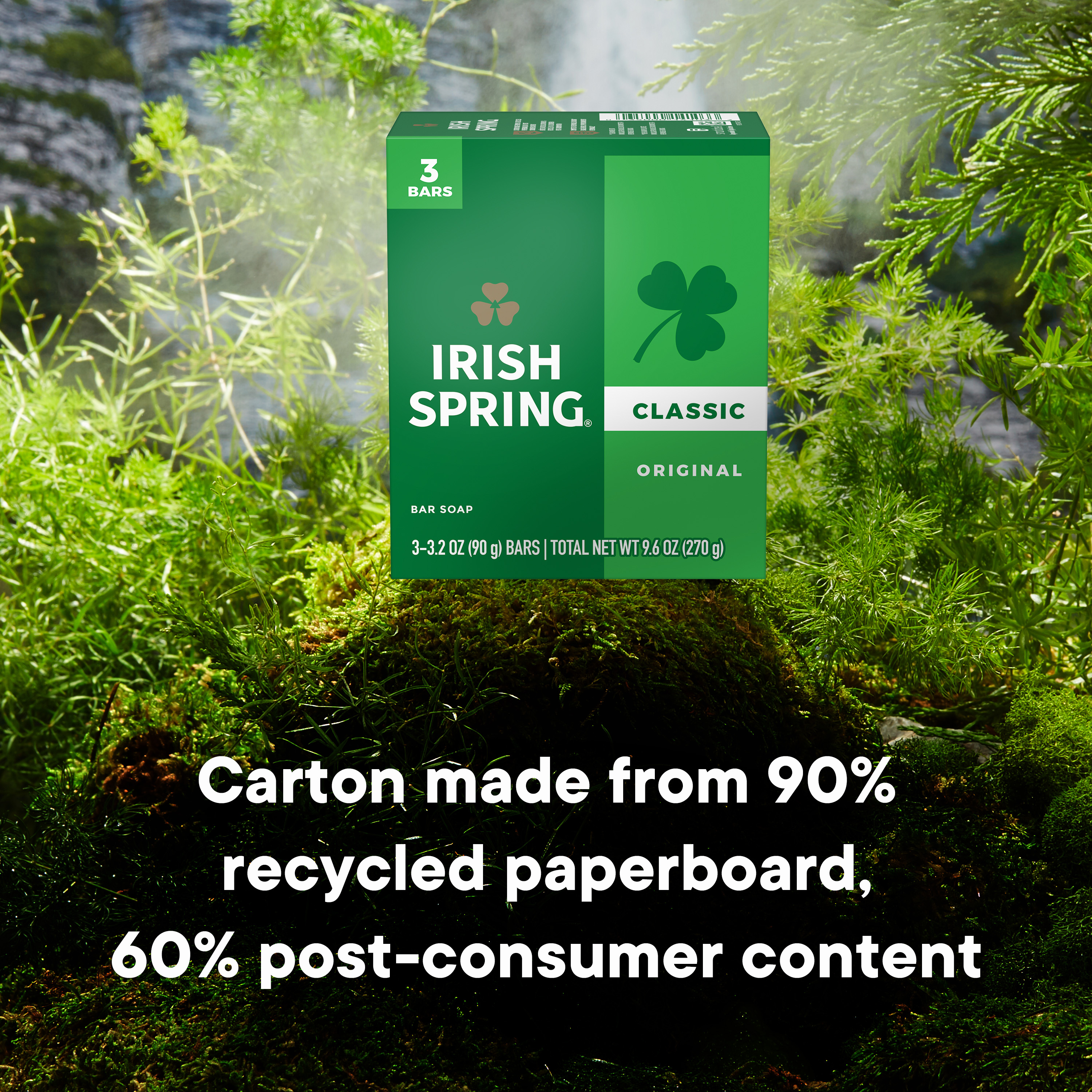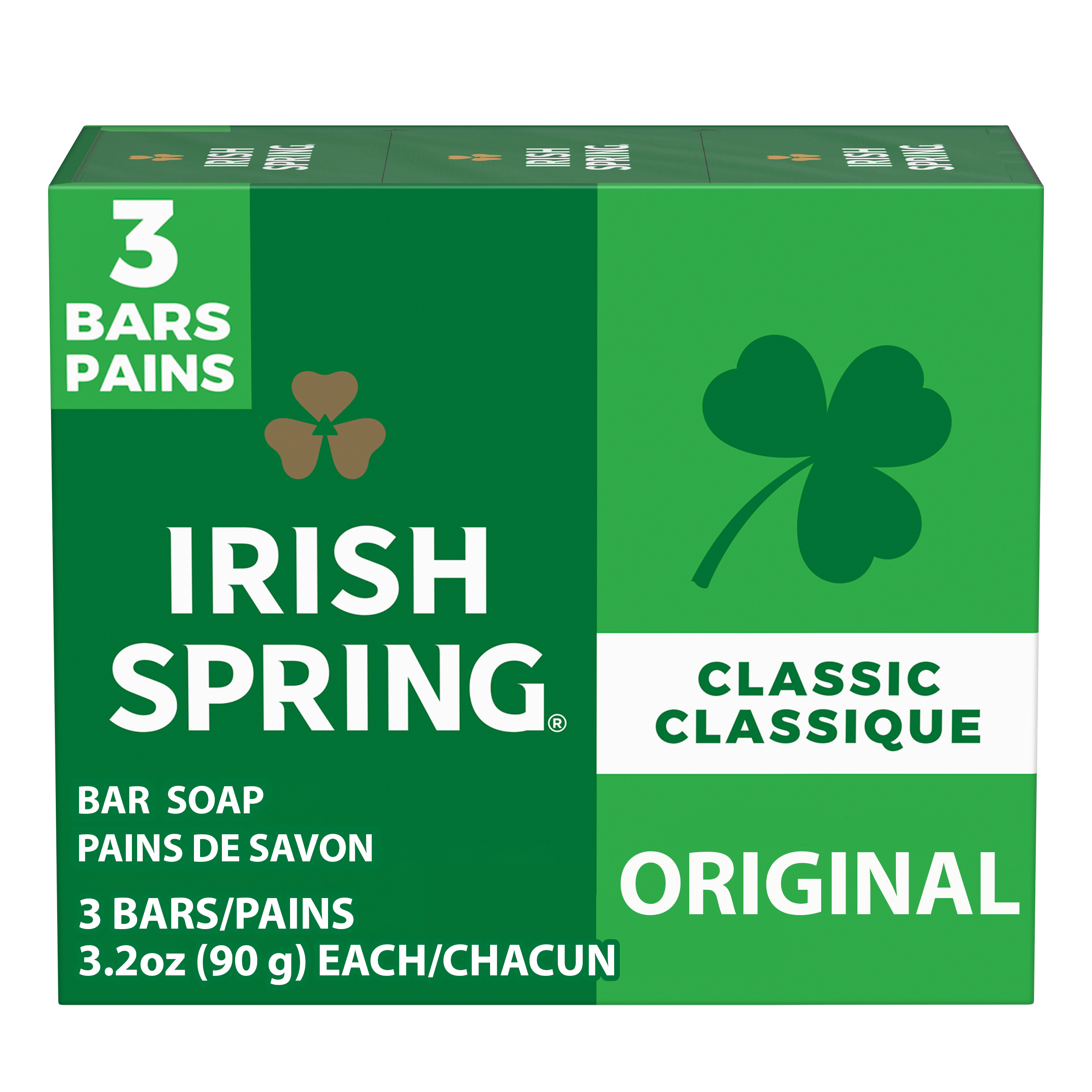 SKU 114181 Consumer Unit - GTIN 00035000141033 Case - GTIN 00035000141811 Product Category Personal Care Product Sub Category Bar Soap Product Equity (Brand) Irish Spring Product Sub Brand Irish Spring BS Product Title Irish Spring Original Deodorant Bar Soap for Men, With Flaxseed Oil, 12 Hour Fresh Deodorant Soap, 3.2 oz Bar (3 Pack) Product Description Count on Irish Spring Original Bar Soap to leave your skin feeling clean and fresh. Our deodorant bar soap for men is made with a 98% naturally derived formula that keeps you fresh for 12 hours and is suitable for all skin types. Irish Spring Original Bar Soap can be used as a hand soap or face wash. This bar soap is suitable for all skin types, including normal, oily, and dry skin, ensuring an effective cleanse. It is also paraben, phthalate, and gluten free and has flaxseed oil. Add some adventure to your everyday life with the entire Irish Spring line of body washes and bar soaps for men. eCommerce Copy- Long Description Irish Spring Original Clean Deodorant Bar Soap, 3 Pack Smell like you came from a nice-smelling place with Irish Spring Bar Soap. Count on Irish Spring Original Bar Soap to leave your skin feeling clean — our original bar soap for men is made with a 98% naturally derived formula that keeps you fresh for 12 hours. Fresh Look, Great Smell Feel clean, smell serene with the new Irish Spring. Our recyclable carton might have a new design, but it’s still the same great bar soap you love. Our packaging refresh is all part of our master plan to bring the amazing places you love to smell straight to your bathroom. Get as fresh as the great outdoors and add some adventure to your everyday with the whole line of body washes and bar soaps for men. We want you to smell as great as you feel, so you can focus on moments that turn into memories. Bar Soap for Body and Hands Irish Spring Original Bar Soap has a sudsy lather that washes away bacteria, so you can use it as a hand soap bar and keep the fresh smell going all day long. Plus, this soap bar is mild for skin. It’s paraben, phthalate and gluten free and has flaxseed oil. Feel good while washing your hands and body with Irish Spring. Irish Spring Bar Soap Pack Never go without smelling your best. The Irish Spring bar soap pack is conveniently packaged so that you can stock up. Keep some in your bathroom, in the pantry, give some to your friends and keep the good smells going. Bullet 1 What’s Included: Three 3.2 oz soap bars of Irish Spring Original Deodorant Bar Soap for Men Bullet 2 Deodorant Soap: Our bar soap leaves your skin feeling clean Bullet 3 Versatile Use: Irish Spring bar soap can be used as a hand soap or a face wash Bullet 4 Infused with Flaxseed Oil: This bar soap is crafted with flaxseed oil Bullet 5 Natural Ingredients: 98% naturally derived formula, gluten free, paraben free, and formulated without phthalates Bullet 6 Sustainably Packaged: Carton made from 90% recycled paperboard, 60% post-consumer content Bullet 7 Refreshing Scent: That cool outdoor Freshness? We’re bringing it to the palm of your hand