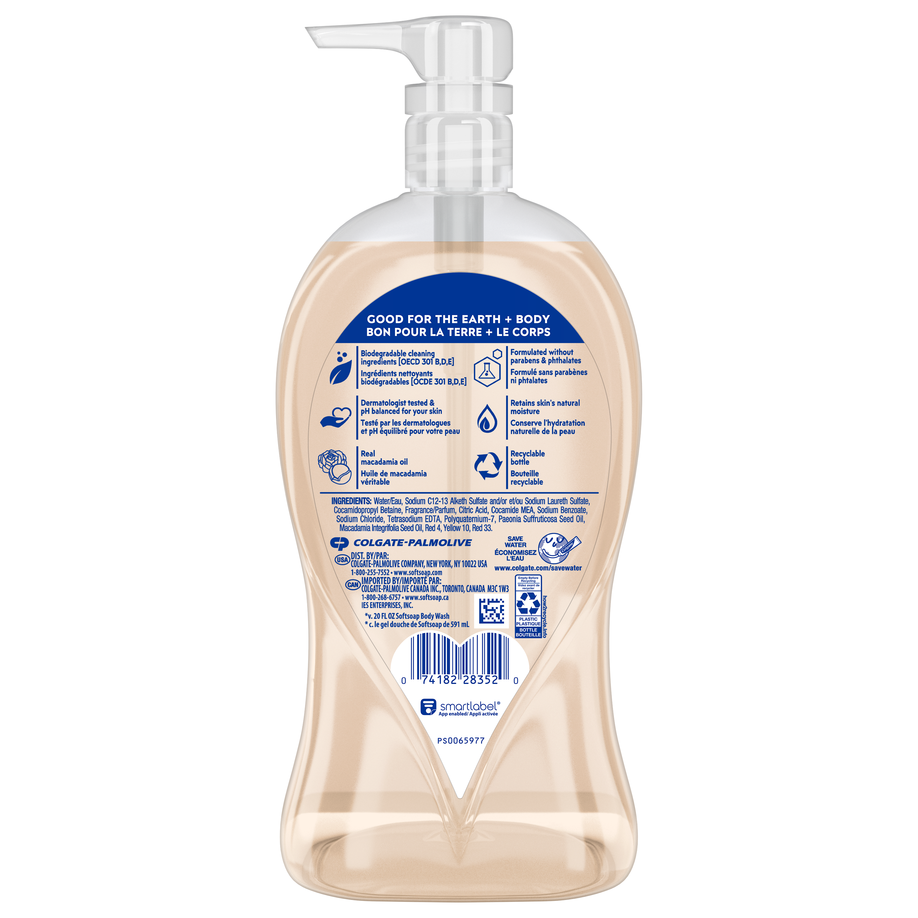 SKU 128352 Consumer Unit - GTIN 00074182283520 Case - GTIN 10074182283527 Product Category Personal Care Product Sub Category Body Wash Product Equity (Brand) Softsoap Product Sub Brand Softsoap Oils BW Product Title Softsoap Moisturizing Body Wash Pump, Luminous Oils Macadamia Oil & Peony - 32 Fluid Ounce Pump Product Description Show your skin some love with Softsoap Luminous Oils Body Wash, Macadamia & Peony, to leave your skin feeling radiant. This delightfully fragrant body wash is made with a touch of real macadamia oil and helps retain skin's natural moisture. eCommerce Copy- Long Description Softsoap Body Macadamia Oil & Soft Peony Scent, 32 Oz. Softsoap Body Macadamia Oil & Soft Peony Scent Body Wash gives you a delightfully moisturizing yet effective clean. This body wash is made with real macadamia oil. This luminous oil body wash retains skin’s moisture and is dermatologist tested and pH balanced for your skin. Feel the joy of clean with Softsoap Body! New Look, Same Great Clean Softsoap labels may have a fresh look, but they still deliver the same great clean and same great scents. Confidently wash with Softsoap Body while enjoying fragrant scents and fun labels that will bring you joy. For everyone, every mood, and every shower, Softsoap Body is designed to make you joyfully clean. Softsoap Body Macadamia Oil & Soft Peony Scent body wash is the perfect way to add a moment of joy to your life. Feel Good About Your Body Wash This body wash formula retains skin’s natural moisture and is made with biodegradable cleaning ingredients. Plus, this body wash is formulated without parabens or phthalates, so you can feel good about your body wash. Feel the Joy of Clean At Softsoap, we believe that the little moments throughout your day should be fun! With delightful bubbles and surprisingly fragrant scents, every trip to the sink and every shower leaves you feeling uplifted. Enjoy those small moments of joy and get brilliantly clean with Softsoap liquid hand soaps and body washes—now, you’re ready to take on the world! Bullet 1 Moisturizing body wash pump Bullet 2 Formulated without parabens and phthalates Bullet 3 pH balanced for your skin Bullet 4 Retains skins natural moisture Bullet 5 Dermatologist Tested Bullet 6 with real macadamia oil Bullet 7 Biodegradable cleaning ingredients Bullet 8 Recyclable bottle Walmart RPC 133436222 Walmart URL (Computed) https://www.walmart.com/ip/a/133436222