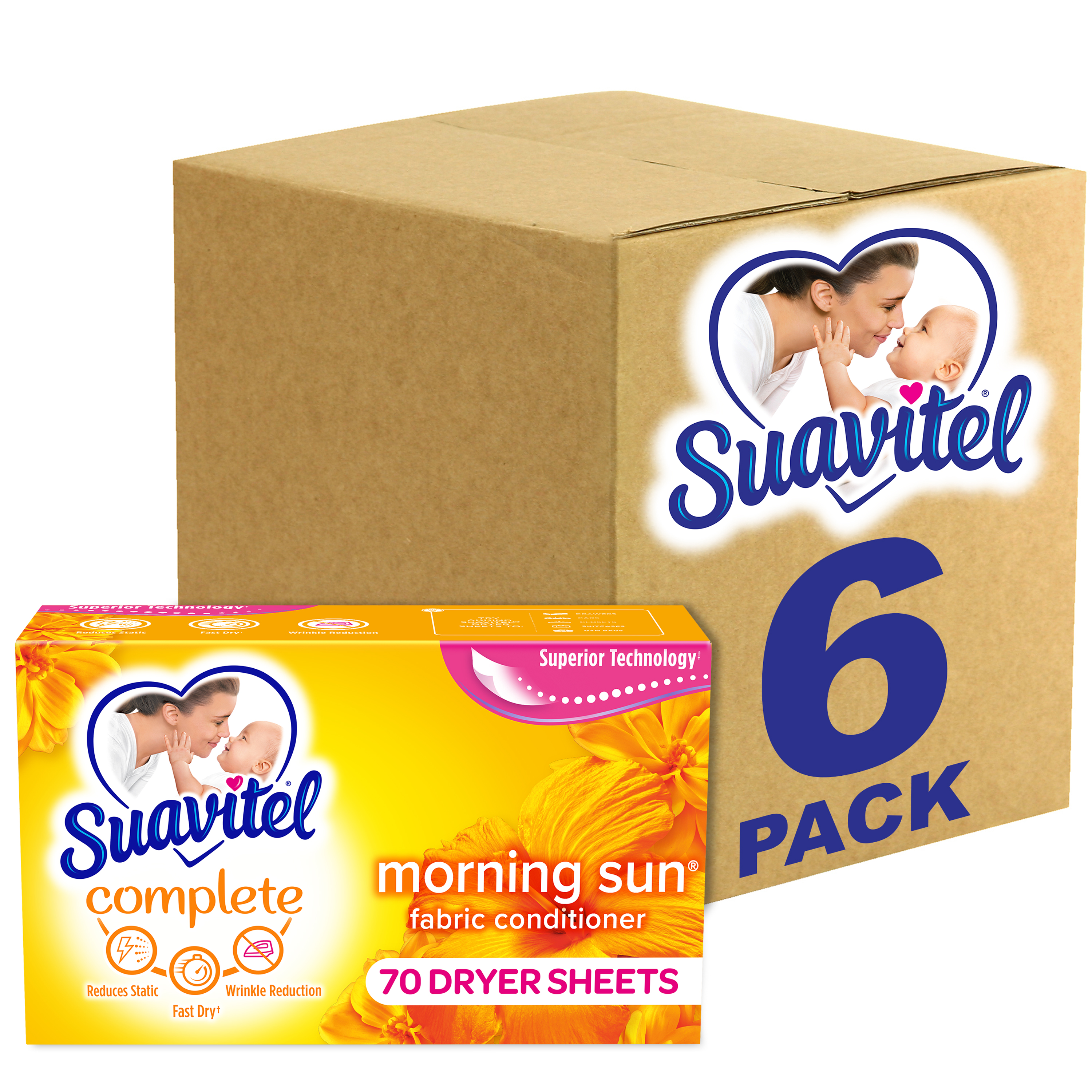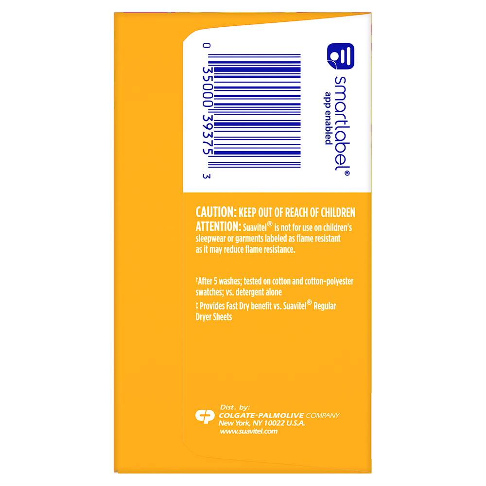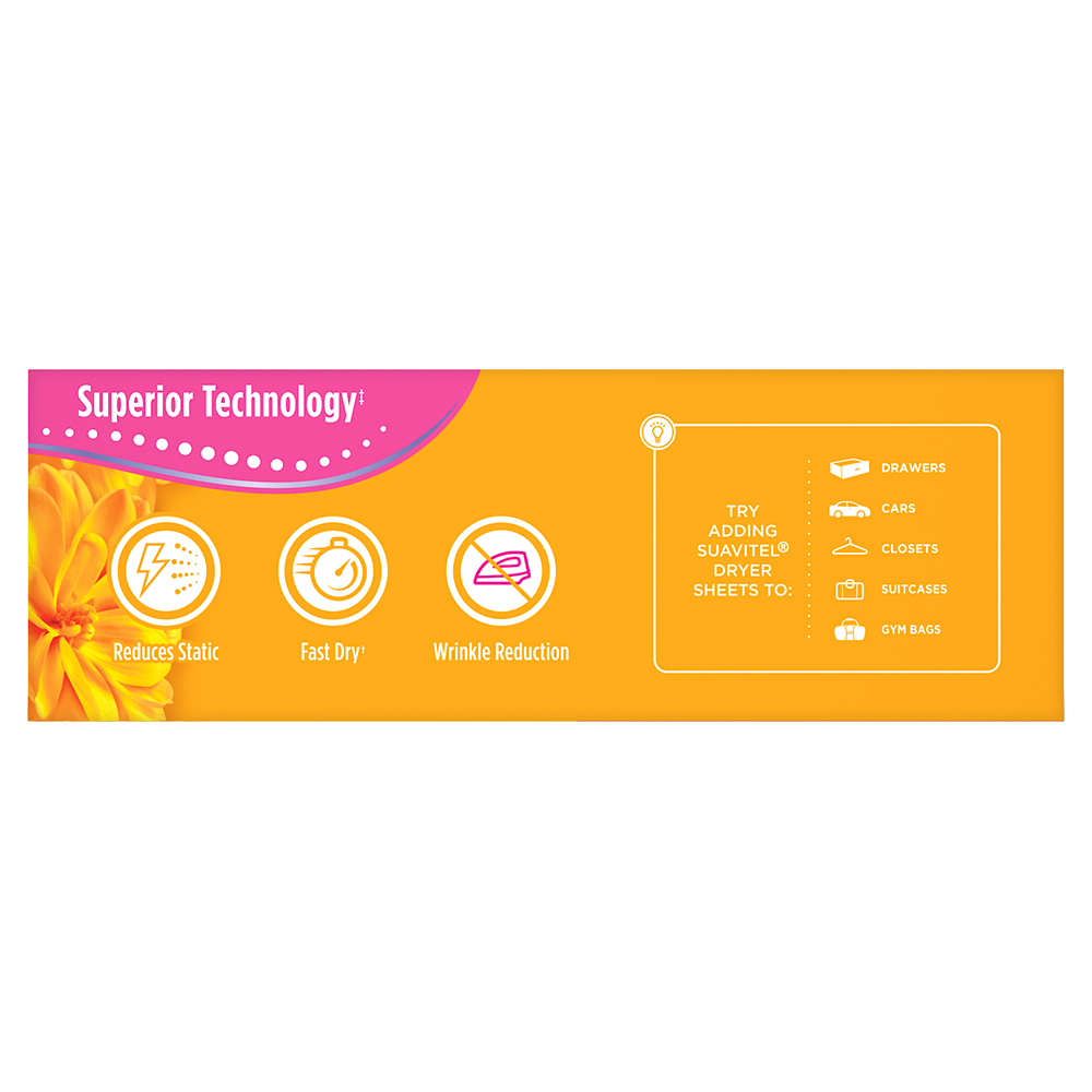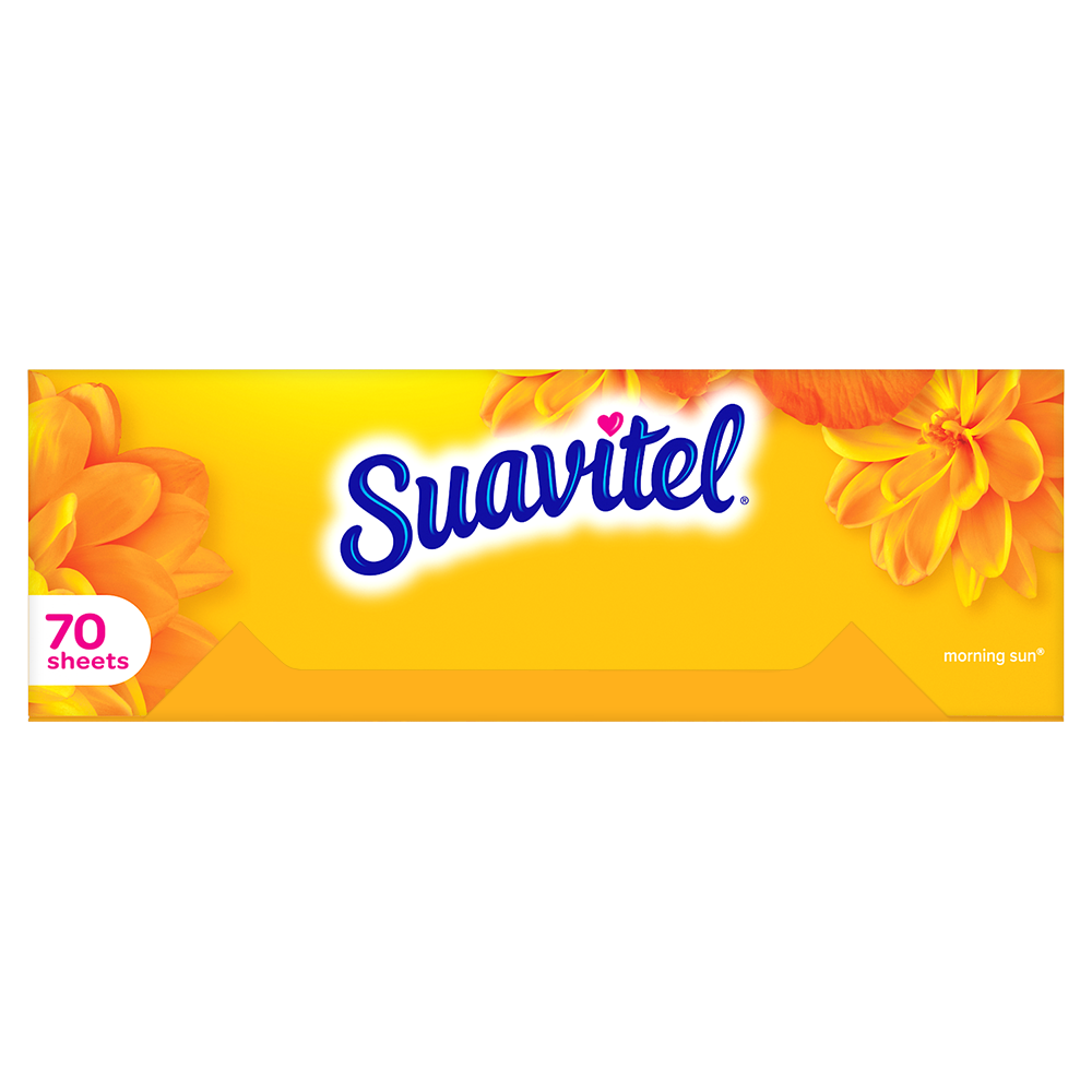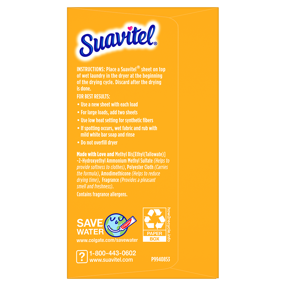 SKU 139375 Consumer Unit - GTIN 00035000393753 Case - GTIN 10035000393750 Product Category Home Care Product Sub Category FC Sheets Product Equity (Brand) Suavitel Product Sub Brand Suavitel Cmplt Sheets FC Product Title Suavitel Complete Dryer Sheets, Fabric Conditioner, Morning Sun Scent, 70 Sheets Product Description Discover the power of superior technology (1) with Suavitel Complete Morning Sun Fabric Softener Dryer Sheets. Engineered to streamline your laundry experience, these fabric softener sheets offer a remarkable Fast Dry (2) technology, allowing your clothes to dry quicker compared to regular dryer sheets. Effectively reduces static and provides wrinkle reduction, ensuring a smooth finish for your clothes. Enjoy the light, fresh scent of a bright summer morning with every wash and revel in the softness that Suavitel fabric softener provides to your clothes and linens. But why stop at laundry? Extend the fresh, Morning Sun scent to other areas of your life by placing Suavitel dryer sheets in dresser drawers, closets, suitcases, and gym bags. Appreciate the irresistibly fresh scent and the exceptional care that Suavitel brings to your clothes, making freshness easier and more delightful than ever for you and your family. (1) Provides Fast Dry benefit vs. Suavitel Regular Dryer Sheets (2) after 5 washes; tested on cotton and cotton-polyester swatches; vs. detergent alone eCommerce Copy- Long Description Suavitel Complete Morning Sun Fabric Softener Dryer Sheets have superior technology* that reduces static and wrinkles, and provides Fast Dry benefits** – all while delivering irresistible softening and freshness that you and your family will love. Try placing them in dresser drawers, closets, suitcases, gym bags – even in your car – to keep the feeling of warm summer sunshine with you wherever you go. And for even better laundry results, pair Suavitel Complete Morning Sun Dryer Sheets with Suavitel Complete Morning Sun Liquid Fabric Conditioner, which helps keep clothes looking newer longer**! *Provides Fast Dry benefit vs. Suavitel Regular Dryer Sheets **After 5 washes; tested on cotton and cotton polyester fabric; vs. detergent alone 50 Years of Loving Softness, Freshness & Care For decades, people have chosen Suavitel for the way it makes their laundry smell and feel - but also for how it makes them feel at home. Suavitel is more than just the sum of its parts: it’s unconditional love, bottled. Today, our fabric conditioners are accessible and affordable, responsibly made,* and are safe for all washing machines. As a brand, we care about more than your clothes - we are committed to helping you care for what you love most and helping you give your family a loving touch that lasts. *To learn more, visit www.colgatepalmolive.com/responsibly-made Bullet 1 One 70 count box of Suavitel Complete Dryer Sheets, Fabric Conditioner, Morning Sun Scent Bullet 2 Enjoy a 2X Longer Lasting Fragrance (1) keeping your laundry fresh for weeks Bullet 3 Effectively reduces static, ensuring your clothes are smoother and more comfortable to wear Bullet 4 This laundry softener effectively reduces static and provides wrinkle reduction, ensuring a smooth finish for your garments Bullet 5 Enjoy the light, fresh scent of a bright summer morning with every wash and revel in the softness that Suavitel fabric softener provides to your clothes and linens Bullet 6 Provides incredible softness, enhancing the comfort and feel of your clothing with every load Bullet 7 Making freshness easier and more delightful than ever for you and your family Amazon RPC B017II5CPY AMZ URL https://www.amazon.com/dp/B017II5CPY Walmart RPC 147576468 Walmart URL (Computed) https://www.walmart.com/ip/a/147576468 Target RPC 78016110 Target URL https://www.target.com/p/a/-/A-78016110 Albertsons RPC 970114865 Albertsons URL https://www.albertsons.com/shop/product-details.970114865.html CVS RPC 365060