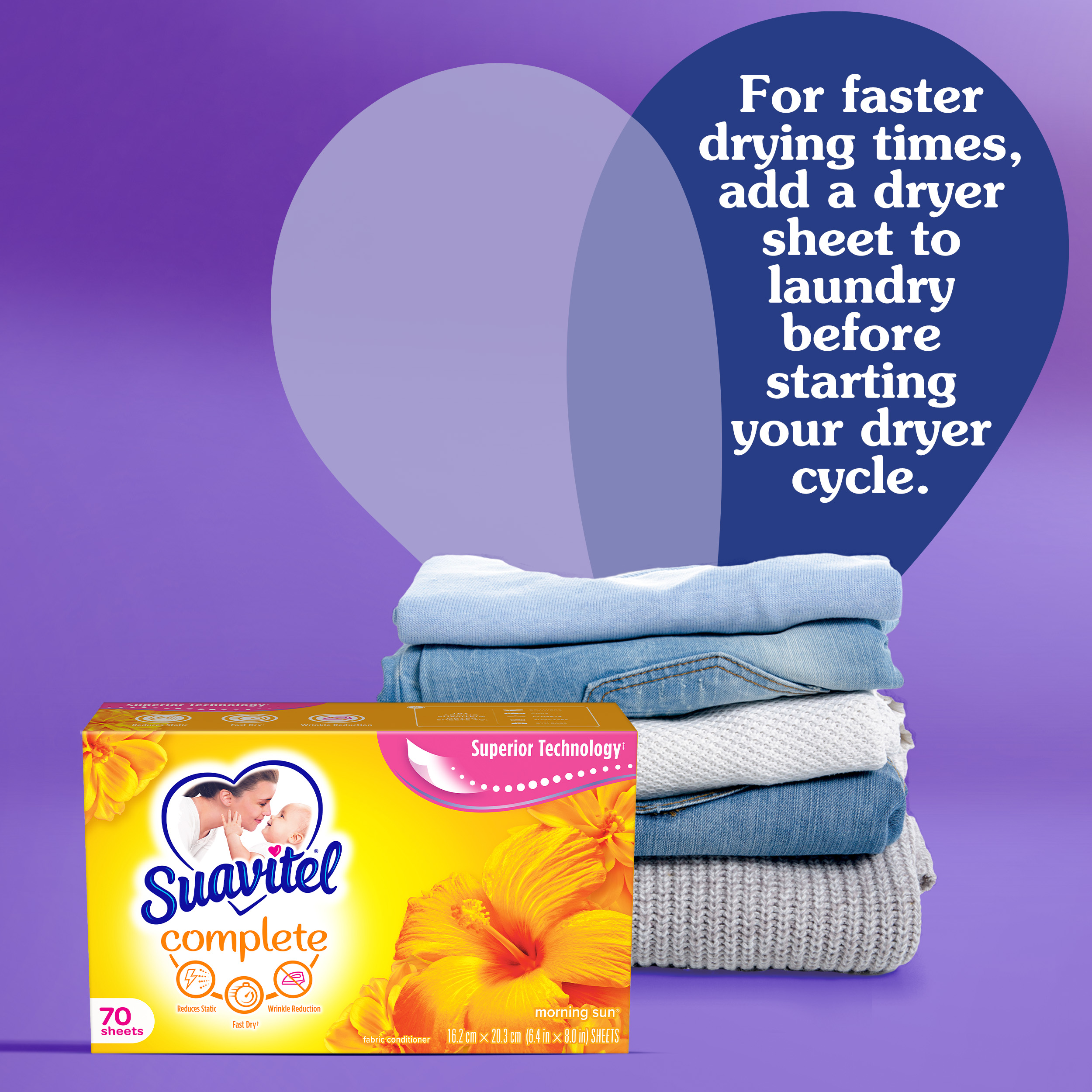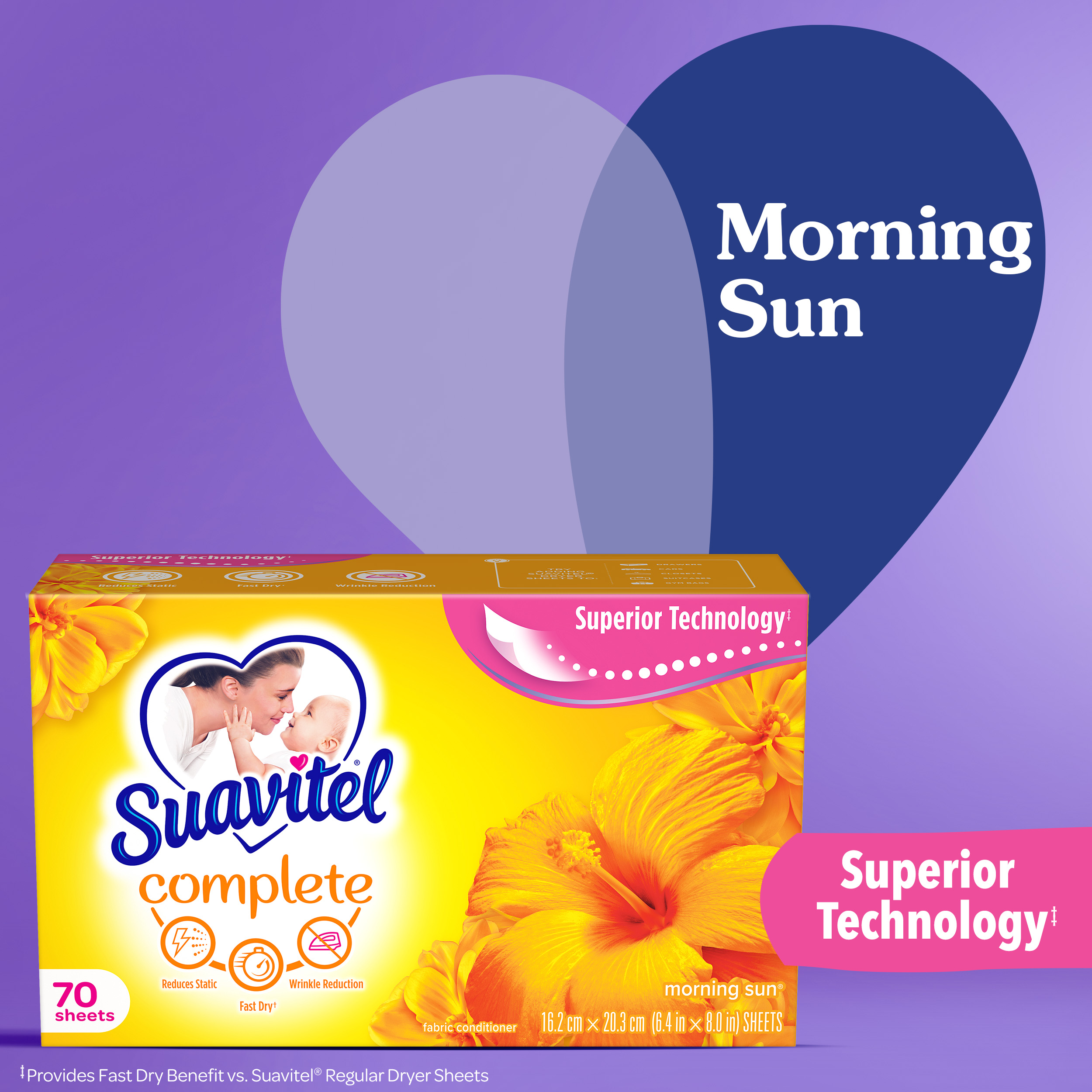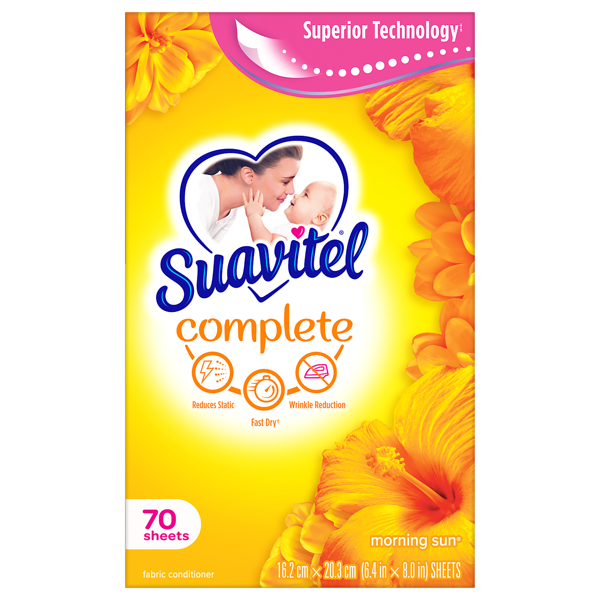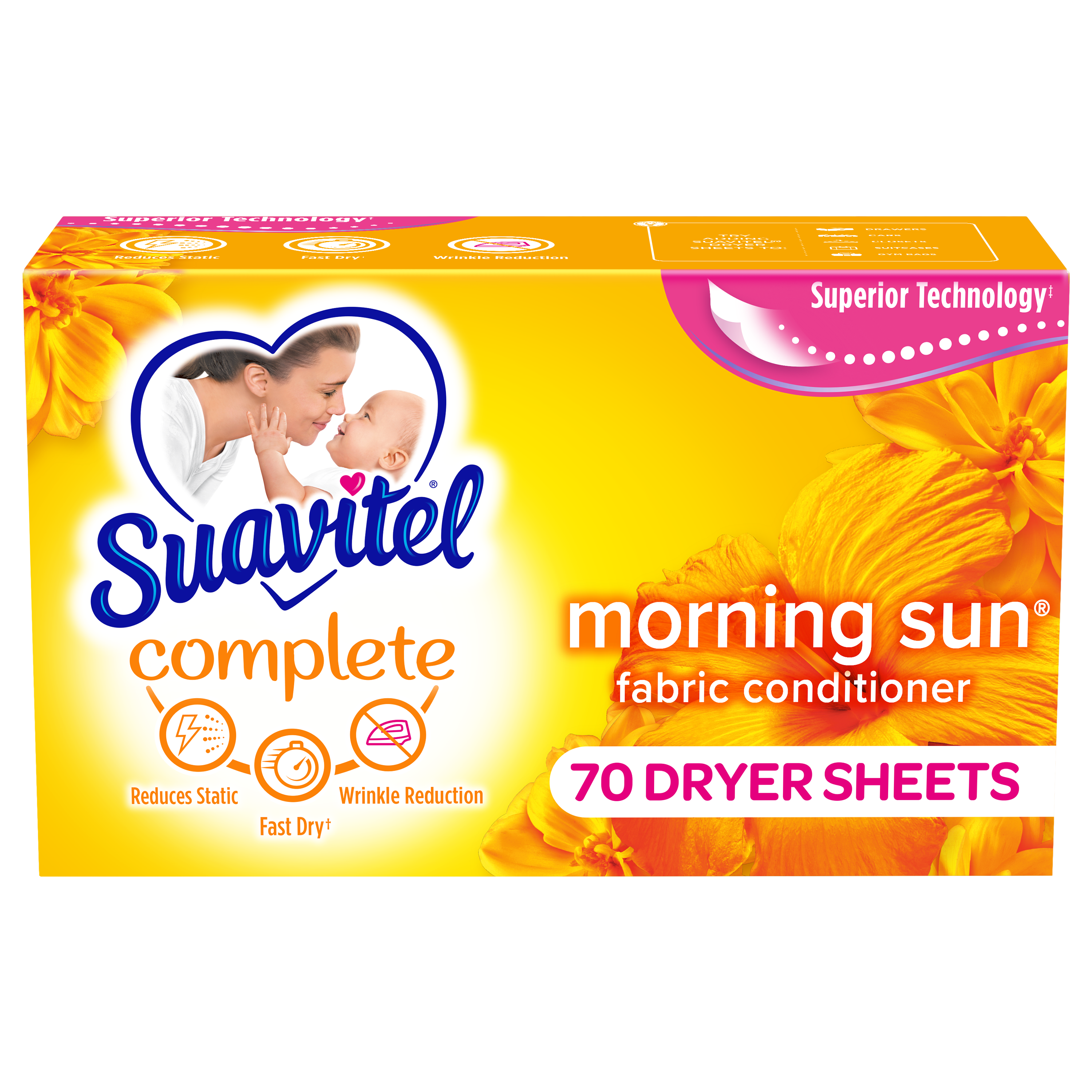 SKU 139375 Consumer Unit - GTIN 00035000393753 Case - GTIN 10035000393750 Product Category Home Care Product Sub Category FC Sheets Product Equity (Brand) Suavitel Product Sub Brand Suavitel Cmplt Sheets FC Product Title Suavitel Complete Dryer Sheets, Fabric Conditioner, Morning Sun Scent, 70 Sheets Product Description Discover the power of superior technology (1) with Suavitel Complete Morning Sun Fabric Softener Dryer Sheets. Engineered to streamline your laundry experience, these fabric softener sheets offer a remarkable Fast Dry (2) technology, allowing your clothes to dry quicker compared to regular dryer sheets. Effectively reduces static and provides wrinkle reduction, ensuring a smooth finish for your clothes. Enjoy the light, fresh scent of a bright summer morning with every wash and revel in the softness that Suavitel fabric softener provides to your clothes and linens. But why stop at laundry? Extend the fresh, Morning Sun scent to other areas of your life by placing Suavitel dryer sheets in dresser drawers, closets, suitcases, and gym bags. Appreciate the irresistibly fresh scent and the exceptional care that Suavitel brings to your clothes, making freshness easier and more delightful than ever for you and your family. (1) Provides Fast Dry benefit vs. Suavitel Regular Dryer Sheets (2) after 5 washes; tested on cotton and cotton-polyester swatches; vs. detergent alone eCommerce Copy- Long Description Suavitel Complete Morning Sun Fabric Softener Dryer Sheets have superior technology* that reduces static and wrinkles, and provides Fast Dry benefits** – all while delivering irresistible softening and freshness that you and your family will love. Try placing them in dresser drawers, closets, suitcases, gym bags – even in your car – to keep the feeling of warm summer sunshine with you wherever you go. And for even better laundry results, pair Suavitel Complete Morning Sun Dryer Sheets with Suavitel Complete Morning Sun Liquid Fabric Conditioner, which helps keep clothes looking newer longer**! *Provides Fast Dry benefit vs. Suavitel Regular Dryer Sheets **After 5 washes; tested on cotton and cotton polyester fabric; vs. detergent alone 50 Years of Loving Softness, Freshness & Care For decades, people have chosen Suavitel for the way it makes their laundry smell and feel - but also for how it makes them feel at home. Suavitel is more than just the sum of its parts: it’s unconditional love, bottled. Today, our fabric conditioners are accessible and affordable, responsibly made,* and are safe for all washing machines. As a brand, we care about more than your clothes - we are committed to helping you care for what you love most and helping you give your family a loving touch that lasts. *To learn more, visit www.colgatepalmolive.com/responsibly-made Bullet 1 One 70 count box of Suavitel Complete Dryer Sheets, Fabric Conditioner, Morning Sun Scent Bullet 2 Enjoy a 2X Longer Lasting Fragrance (1) keeping your laundry fresh for weeks Bullet 3 Effectively reduces static, ensuring your clothes are smoother and more comfortable to wear Bullet 4 This laundry softener effectively reduces static and provides wrinkle reduction, ensuring a smooth finish for your garments Bullet 5 Enjoy the light, fresh scent of a bright summer morning with every wash and revel in the softness that Suavitel fabric softener provides to your clothes and linens Bullet 6 Provides incredible softness, enhancing the comfort and feel of your clothing with every load Bullet 7 Making freshness easier and more delightful than ever for you and your family Amazon RPC B017II5CPY AMZ URL https://www.amazon.com/dp/B017II5CPY Walmart RPC 147576468 Walmart URL (Computed) https://www.walmart.com/ip/a/147576468 Target RPC 78016110 Target URL https://www.target.com/p/a/-/A-78016110 Albertsons RPC 970114865 Albertsons URL https://www.albertsons.com/shop/product-details.970114865.html CVS RPC 365060