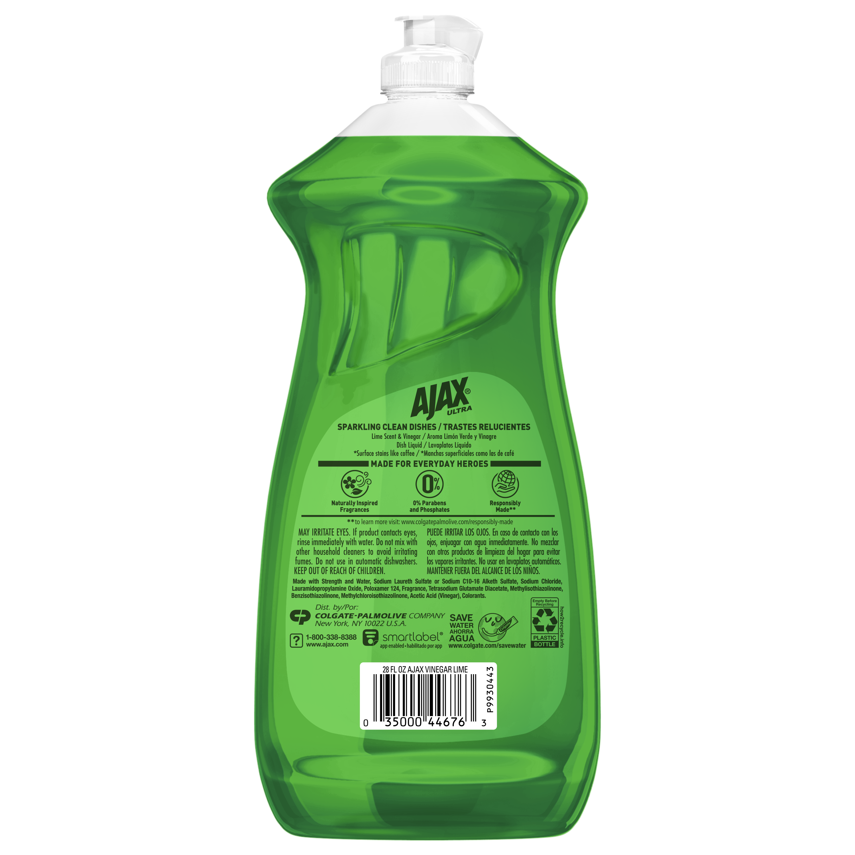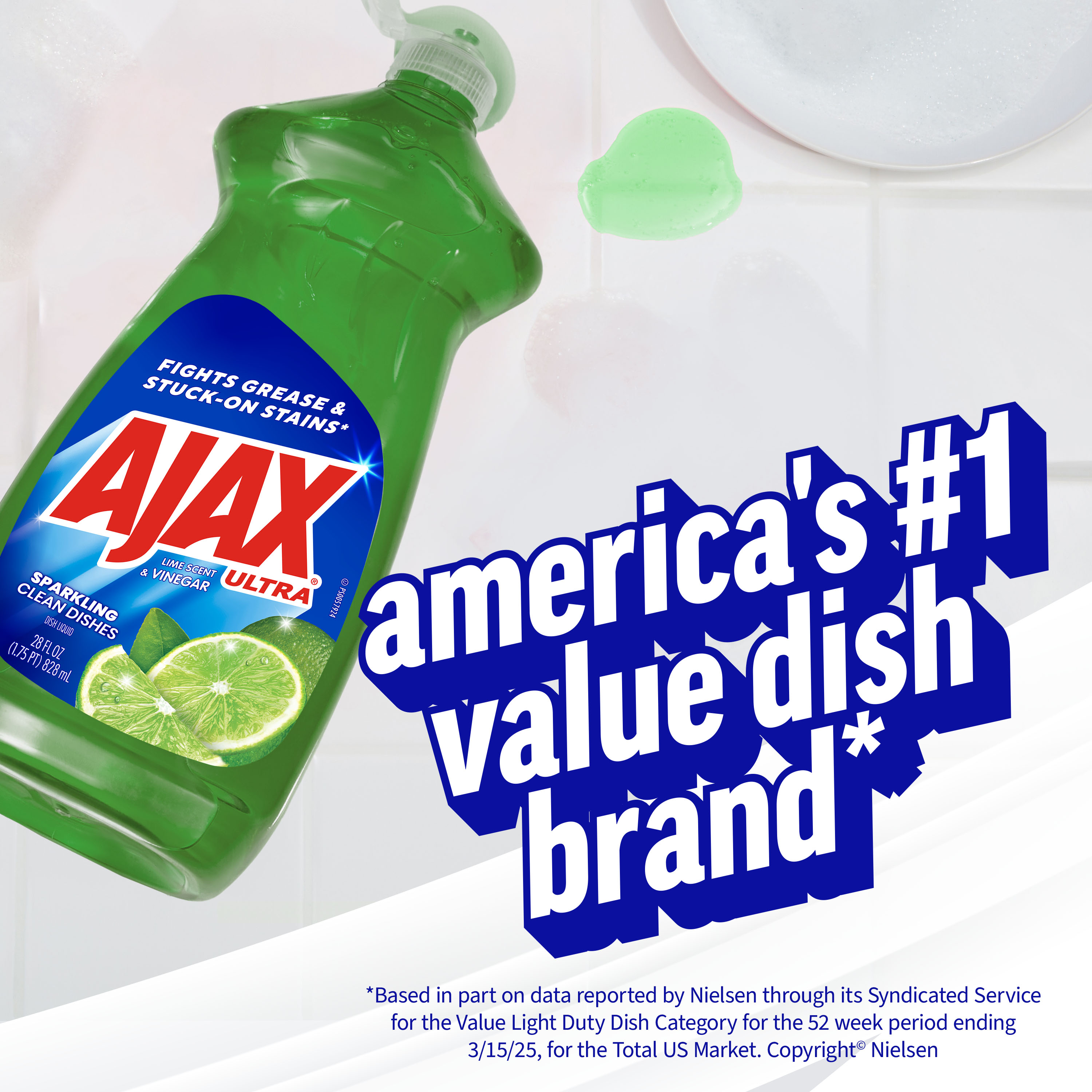 SKU 144676 Consumer Unit - GTIN 00035000446763 Case - GTIN 10035000446760 Product Category Home Care Product Sub Category Dish Hand Product Equity (Brand) Ajax Product Sub Brand Ajax HD Product Title Ajax Ultra Liquid Dish Soap Vinegar and Lime Scent, Sparkling Clean Dishes, 28 oz Bottle Product Description Boost your dishwashing experience with Ajax Ultra Liquid Dish Soap. We have combined your favorite lime scent with the efficacy of Ajax that fights grease and stuck on stains. This green dish soap easily dissolves stuck on grease with a delightful burst of citrus freshness. Enhance your cleaning arsenal by harnessing the natural power of vinegar, a versatile cleaner that effortlessly tackles tough stains and grime, leaving surfaces with that perfect shine. This dishwashing liquid is made with naturally inspired fragrances, zero parabens and no phosphates. The power of Ajax Ultra goes beyond the sink. This versatile kitchen dish soap allows you to pre-treat laundry, wash tires, and wipe down appliances. Life is tough, but you're tougher! We understand that life isn’t easy. You work hard—heck, REALLY hard. You tackle big and small tough jobs, without looking for applause. That’s why we at Ajax recognize you, the everyday heroes, who step up at the end of a long day and get the dishes done. Because, let’s face it, at the end of the day a clean home is a happy home. Leave the grime to us so you can get back to what really matters! eCommerce Copy- Long Description A crisp, fresh scent to help you tackle tough jobs Leave dishes sparkling! Ajax Ultra Liquid Dish Soap with Lime Scent + Vinegar easily dissolves stuck-on grease to get dishes clean. This dish liquid is made with 100% real citrus extract, so you can enjoy long-lasting suds with the crisp, fresh scent of juicy lime and a touch of vinegar.. This product is phosphate-free. Made with naturally inspired fragrances, 0% parabens and phosphates, and 100% biodegradable active ingredients, this dish soap is designed for everyday heroes like you. Plus, try this product to tackle tough jobs beyond dishwashing! Learn more at ajax.com. Life is tough, but you're tougher! We understand that life isn’t easy. You work hard—heck, REALLY hard. You tackle big and small tough jobs, without looking for applause. That’s why we at Ajax recognize you, the everyday heroes, who step up at the end of a long day and get the dishes done. Because, let’s face it, at the end of the day a clean home is a happy home. By standing tall in the face of messes, you are an everyday hero. Leave the grime to us so you can get back to what really matters! Bullet 1 One 28 oz Bottle of Ajax Ultra Liquid Dish Soap Lime Scent and Vinegar, Sparkling Clean Dishes Bullet 2 This liquid dish soap brings a freshness to your kitchen with a burst of limes Bullet 3 This green dish soap provides a pleasant and powerful cleaning experience Bullet 4 Enhance your cleaning arsenal by harnessing the natural power of vinegar, a versatile cleaner that effortlessly tackles tough stains and grime Bullet 5 This dishwashing liquid is made with naturally inspired fragrances, zero parabens and no phosphates Bullet 6 The power of Ajax kitchen dish soap goes beyond the sink. This versatile dish soap liquid allows you to pre-treat laundry, wash tires, and wipe down appliances Bullet 7 Leave the grime to us so you can get back to what really matters Walmart RPC 43710507 Walmart URL (Computed) https://www.walmart.com/ip/a/43710507 Albertsons RPC 960517302 Albertsons URL https://www.albertsons.com/shop/product-details.960517302.html CVS RPC 888700