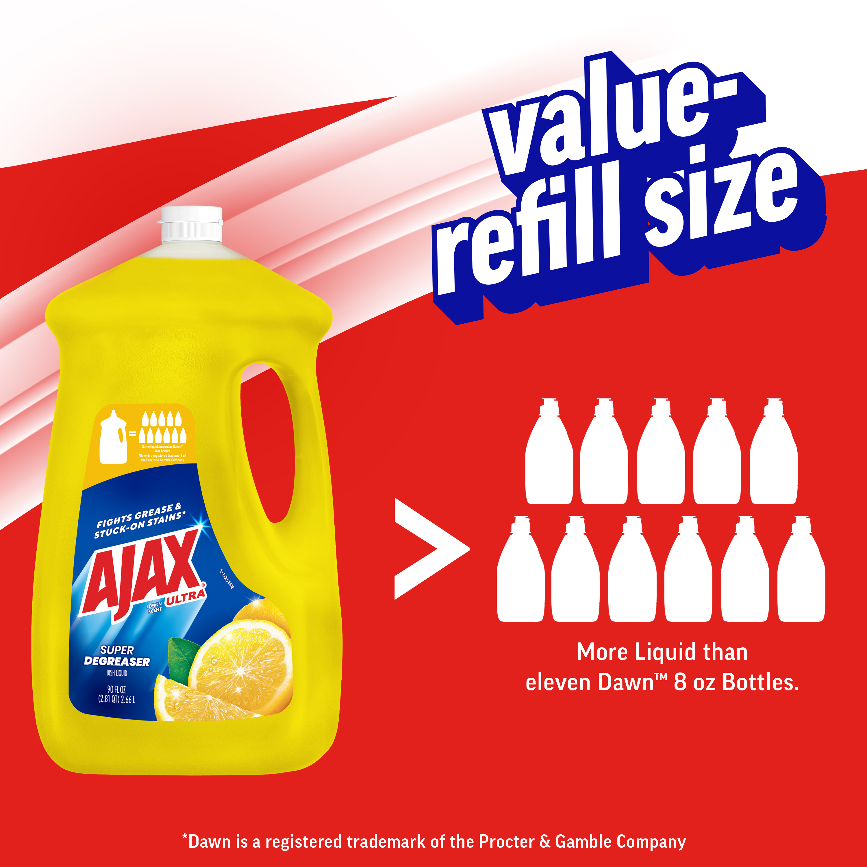 SKU 149110 Consumer Unit - GTIN 00035000491107 Case - GTIN 10035000491104 Product Category Home Care Product Sub Category Dish Hand Product Equity (Brand) Ajax Product Sub Brand Ajax HD Product Title Ajax Ultra Liquid Dish Soap Lemon Scent, Super Degreaser, 90 fl oz Bottle Product Description Boost your mood and your dishwashing experience with Ajax Ultra Liquid Dish Soap. We have combined your favorite lemon scent with the efficacy of Ajax to help you fight grease and stuck-on stains on dishes, ensuring a powerful cleaning experience. Our super degreaser formula ensures you conquer grease and stubborn stains on your dishes, delivering a deep-cleaning action that leaves your kitchenware spotless. This dishwashing detergent liquid is made with naturally inspired fragrances, zero parabens, and no phosphates. The power of Ajax Ultra goes beyond the sink. This versatile kitchen dish soap allows you to pre-treat laundry, wash tires, and wipe down appliances. Life is tough, but you're tougher! We understand that life isn’t easy. You work hard—heck, REALLY hard. You tackle big and small tough jobs, without looking for applause. That’s why we at Ajax recognize you, the everyday heroes, who step up at the end of a long day and get the dishes done. Because, let’s face it, at the end of the day a clean home is a happy home. Leave the grime to us so you can get back to what really matters! Refillable packaging solutions. eCommerce Copy- Long Description Easily dissolve stuck-on grease Boost your mood and your dishwashing experience: Delight in the fresh, clean aroma of lemon and leave your dishes sparkling clean with Ajax Ultra Super Degreaser Liquid Dish Soap with Lemon Scent. This product easily dissolves stuck-on grease. Enjoy the clean scent of lemon with this dish liquid made from 100% real citrus extract. This product is phosphate-free. Made with naturally inspired fragrances, 0% parabens and phosphates, and 100% biodegradable active ingredients, this dish soap is designed for everyday heroes like you. Plus, try this product to tackle tough jobs beyond dishwashing! Learn more at ajax.com. Life is tough, but you're tougher! We understand that life isn’t easy. You work hard—heck, REALLY hard. You tackle big and small tough jobs, without looking for applause. That’s why we at Ajax recognize you, the everyday heroes, who step up at the end of a long day and get the dishes done. Because, let’s face it, at the end of the day a clean home is a happy home. By standing tall in the face of messes, you are an everyday hero. Leave the grime to us so you can get back to what really matters! Bullet 1 One 90 fl oz bottle of Ajax Ultra Liquid Dish Soap Lemon Scent, Super Degreaser Bullet 2 This liquid dish soap brings a boost of mood and freshness to your kitchen with its refreshing lemon scent, creating a delightful and powerful cleaning experience Bullet 3 This yellow dish soap not only leaves your dishes sparkling clean but easily dissolves stuck-on grease and stubborn stains Bullet 4 This dishwashing detergent liquid is made with naturally inspired fragrances, zero parabens, and no phosphates Bullet 5 The power of Ajax kitchen dish soap goes beyond the sink. This versatile dish soap liquid allows you to pre-treat laundry, wash tires, and wipe down appliances Bullet 6 Life is tough, but Ajax applauds your resilience; let the lemon scent transform chores into moments of joy Bullet 7 Ajax salutes hardworking individuals, recognizing the unsung heroes who conquer tough jobs, making homes happy Walmart RPC 34938309 Walmart URL (Computed) https://www.walmart.com/ip/a/34938309 Target RPC 52305386 Target URL https://www.target.com/p/a/-/A-52305386 Albertsons RPC 970528913 Albertsons URL https://www.albertsons.com/shop/product-details.970528913.html Family Dollar RPC 1415033
