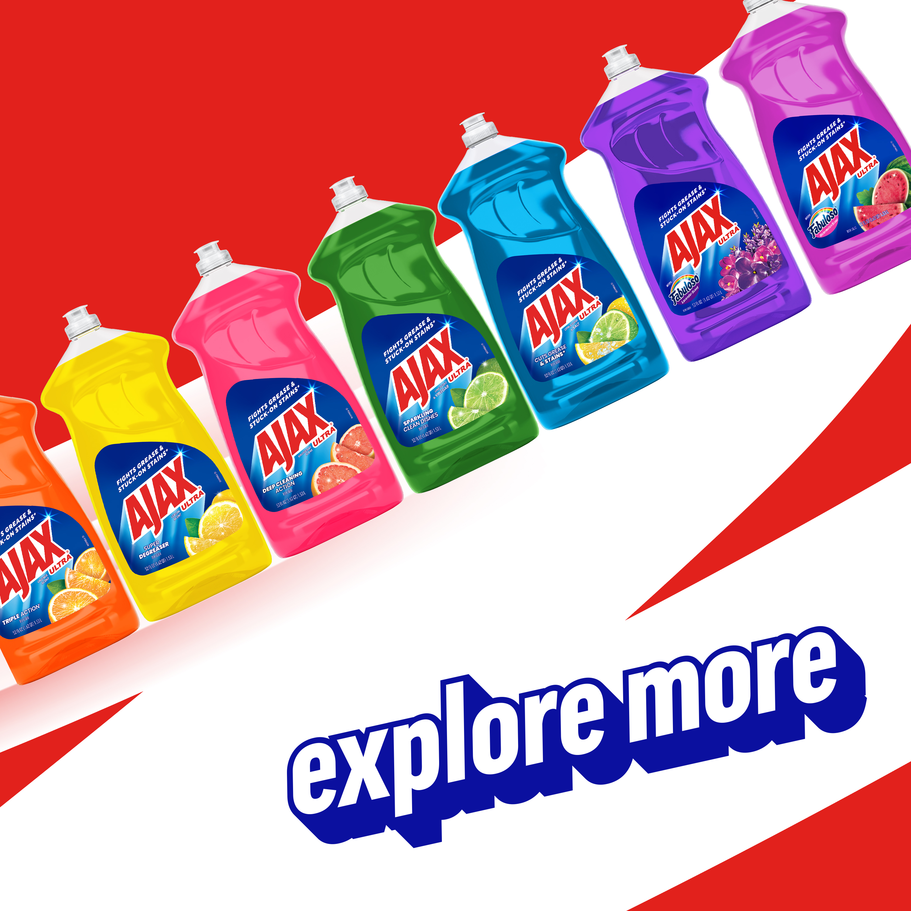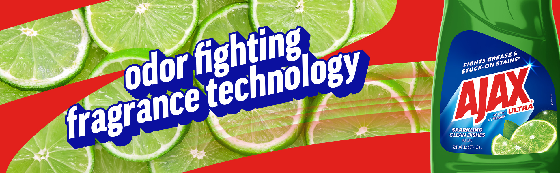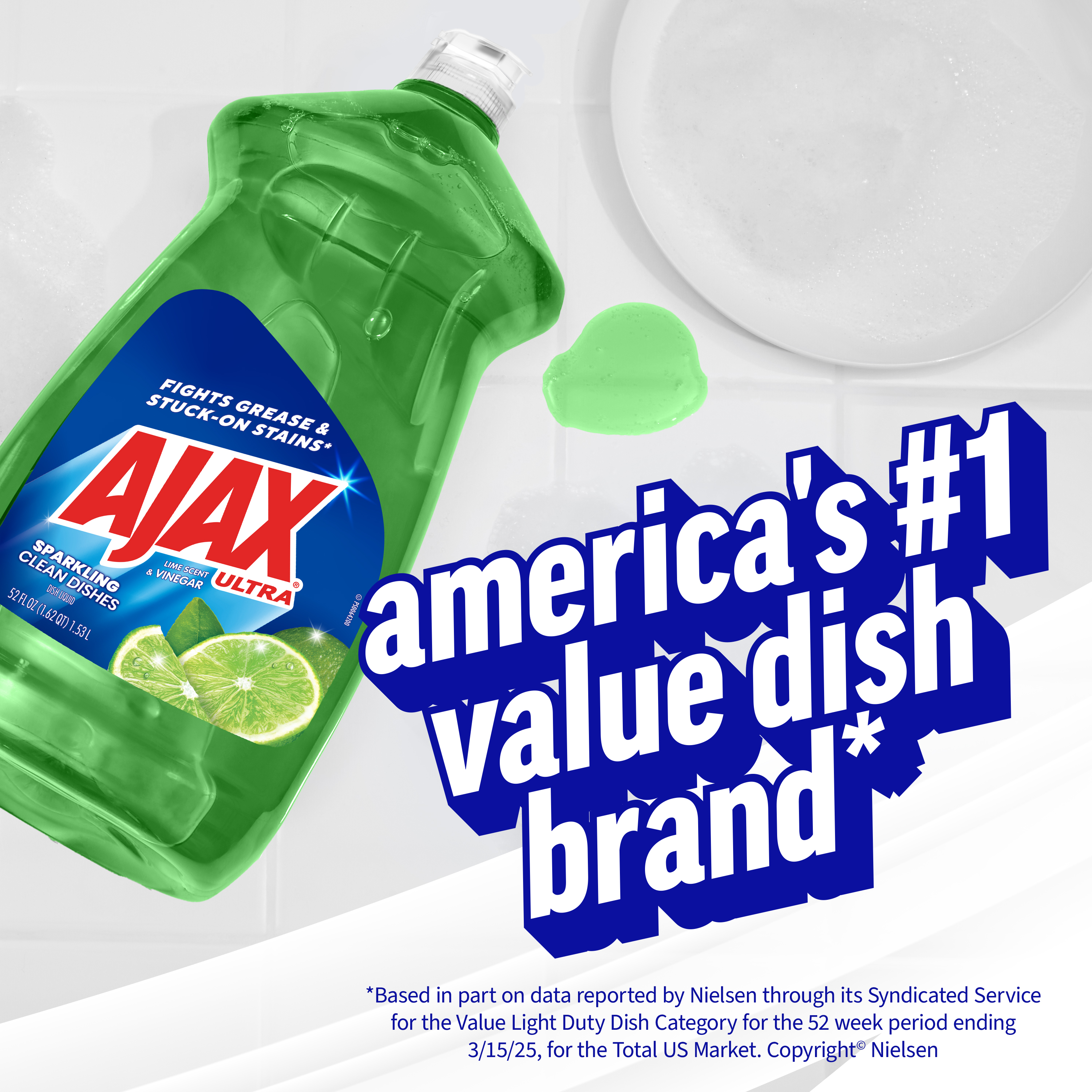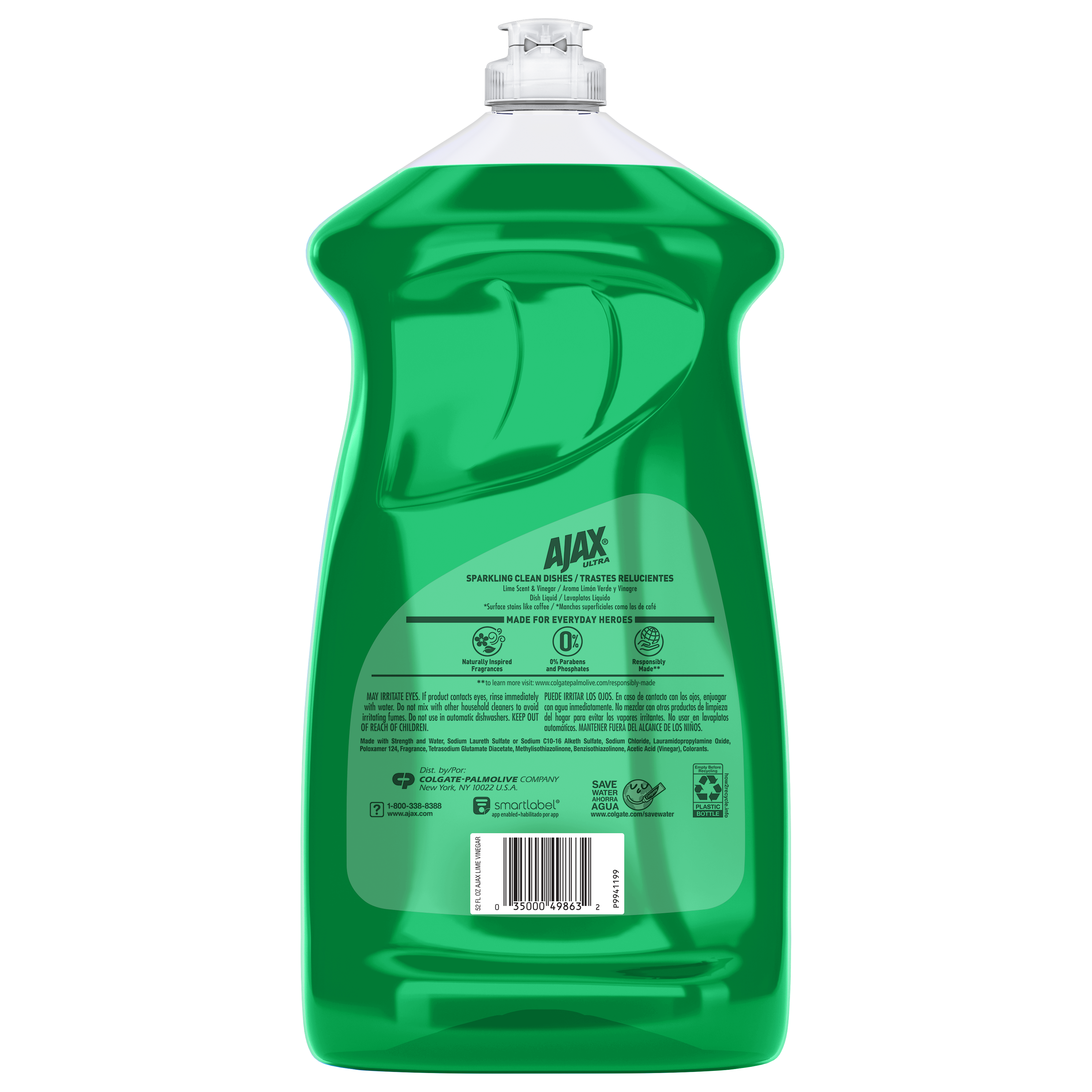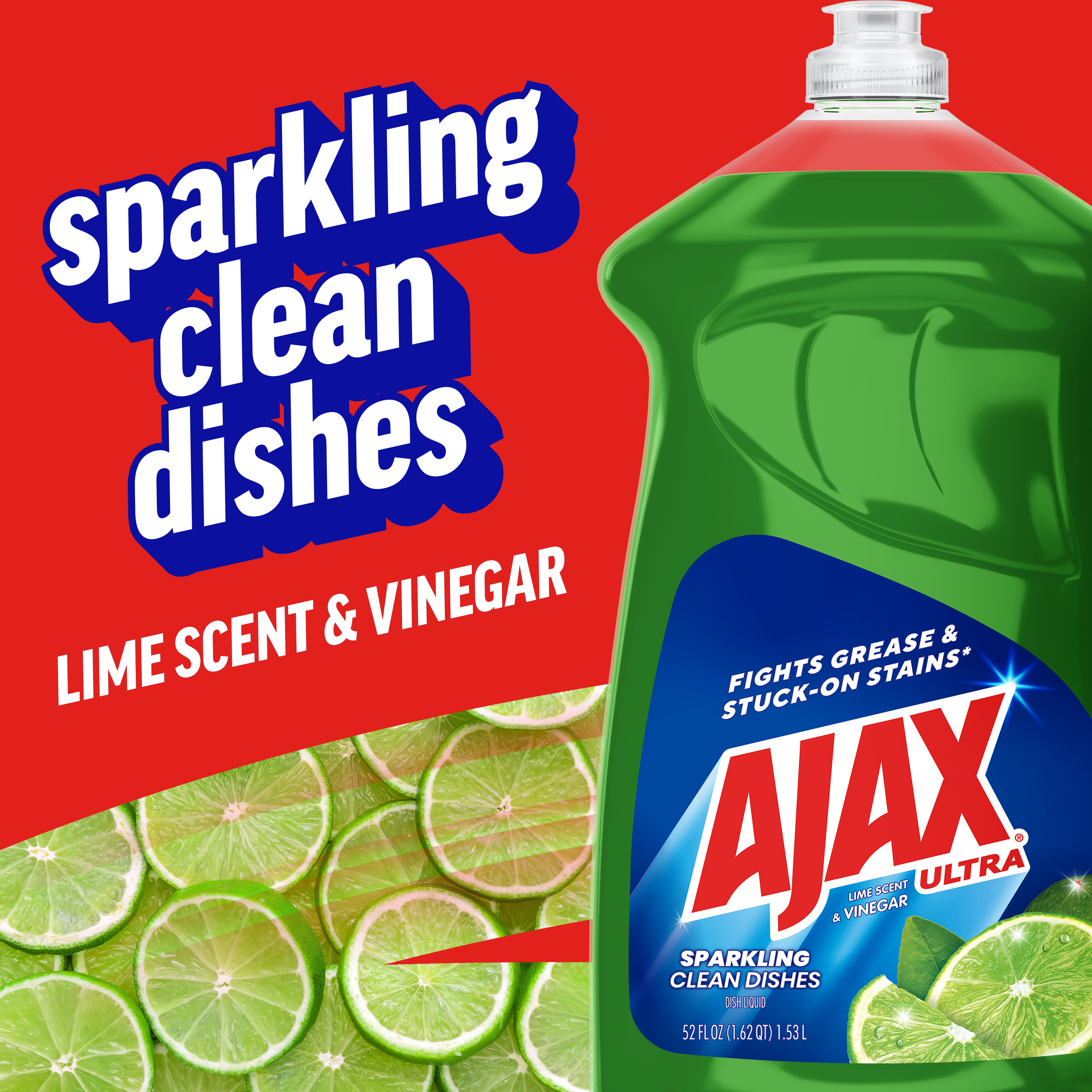 SKU 149863 Consumer Unit - GTIN 00035000498632 Case - GTIN 10035000498639 Product Category Home Care Product Sub Category Dish Hand Product Equity (Brand) Ajax Product Sub Brand Ajax HD Product Title Ajax Ultra Dish Soap Lime Scent and Vinegar, Sparkling Clean Dishes, Mess-Free, Easy-Flip Cap, 52 fl oz Bottle Product Description Boost your dishwashing experience with Ajax Ultra Liquid Dish Soap. We have combined your favorite lime scent with the efficacy of Ajax that fights grease and stuck-on stains. This green dish soap easily dissolves stuck-on grease with a delightful burst of citrus freshness. Enhance your cleaning arsenal a versatile cleaner that effortlessly tackles tough stains and grime, leaving surfaces with that perfect shine. The bottle features a convenient easy-flip cap for added ease of use. This dishwashing liquid is made with naturally inspired fragrances, zero parabens, and no phosphates. The power of Ajax Ultra goes beyond the sink. This versatile kitchen dish soap allows you to pre-treat laundry, wash tires, and wipe down appliances. Life is tough, but you're tougher! We understand that life isn’t easy. You work hard—heck, REALLY hard. You tackle big and small tough jobs, without looking for applause. That’s why we at Ajax recognize you, the everyday heroes, who step up at the end of a long day and get the dishes done. Because, let’s face it, at the end of the day a clean home is a happy home. Leave the grime to us so you can get back to what really matters! eCommerce Copy- Long Description A crisp, fresh scent to help you tackle tough jobs Leave dishes sparkling! Ajax Ultra Liquid Dish Soap with Lime Scent + Vinegar easily dissolves stuck-on grease to get dishes clean. This dish liquid is made with 100% real citrus extract, so you can enjoy long-lasting suds with the crisp, fresh scent of juicy lime and a touch of vinegar.. This product is phosphate-free. Made with naturally inspired fragrances, 0% parabens and phosphates, and 100% biodegradable active ingredients, this dish soap is designed for everyday heroes like you. Plus, try this product to tackle tough jobs beyond dishwashing! Learn more at ajax.com. Life is tough, but you're tougher! We understand that life isn’t easy. You work hard—heck, REALLY hard. You tackle big and small tough jobs, without looking for applause. That’s why we at Ajax recognize you, the everyday heroes, who step up at the end of a long day and get the dishes done. Because, let’s face it, at the end of the day a clean home is a happy home. By standing tall in the face of messes, you are an everyday hero. Leave the grime to us so you can get back to what really matters! Bullet 1 One 52 fl oz bottle of Ajax Ultra Dish Soap Lime Scent and Vinegar, Sparkling Clean Dishes Bullet 2 This green liquid dish soap brings a burst of lime freshness to your kitchen for a pleasant and powerful cleaning experience Bullet 3 Enhance your cleaning arsenal with a versatile cleaner that effortlessly tackles grease and tough stains Bullet 4 This dishwashing liquid is made with naturally inspired fragrances, zero parabens, and no phosphates Bullet 5 The bottle features a convenient easy-flip cap for added ease of use Bullet 6 This versatile dish soap liquid allows you to pre-treat laundry, wash tires, wipe down appliances, and more Bullet 7 Leave the grime to us so you can get back to what really matters Amazon RPC B07GX38S38 AMZ URL https://www.amazon.com/dp/B07GX38S38 Walmart RPC 20971293 Walmart URL (Computed) https://www.walmart.com/ip/a/20971293 CVS RPC 272704