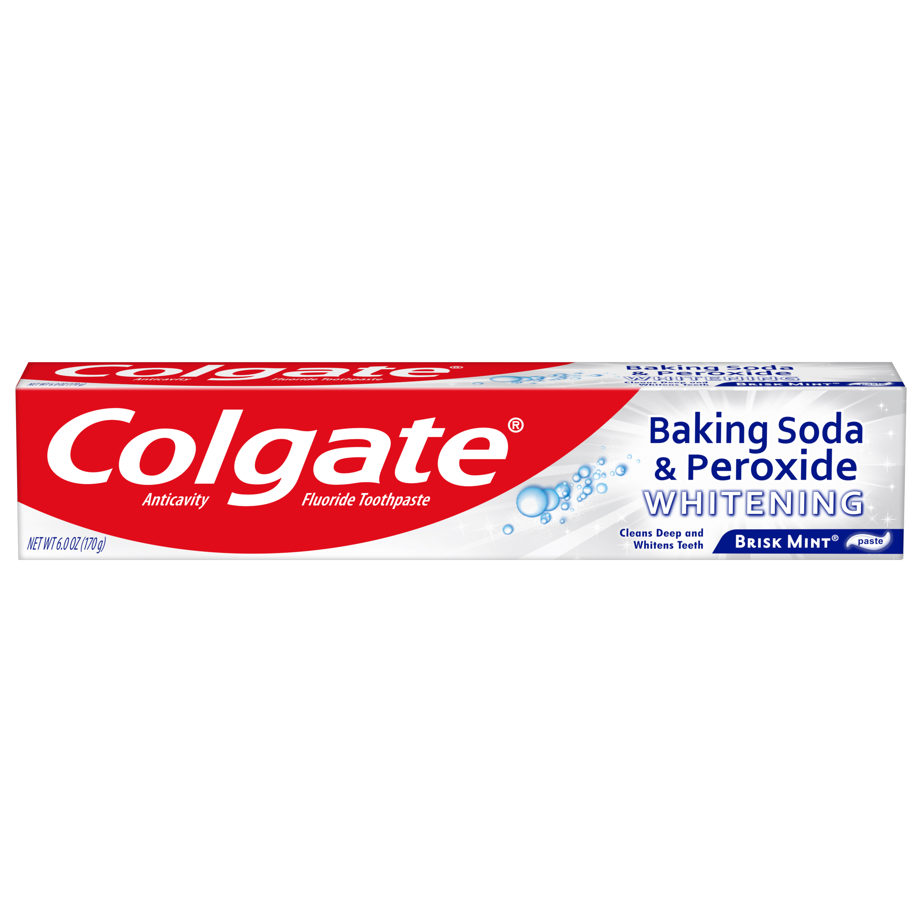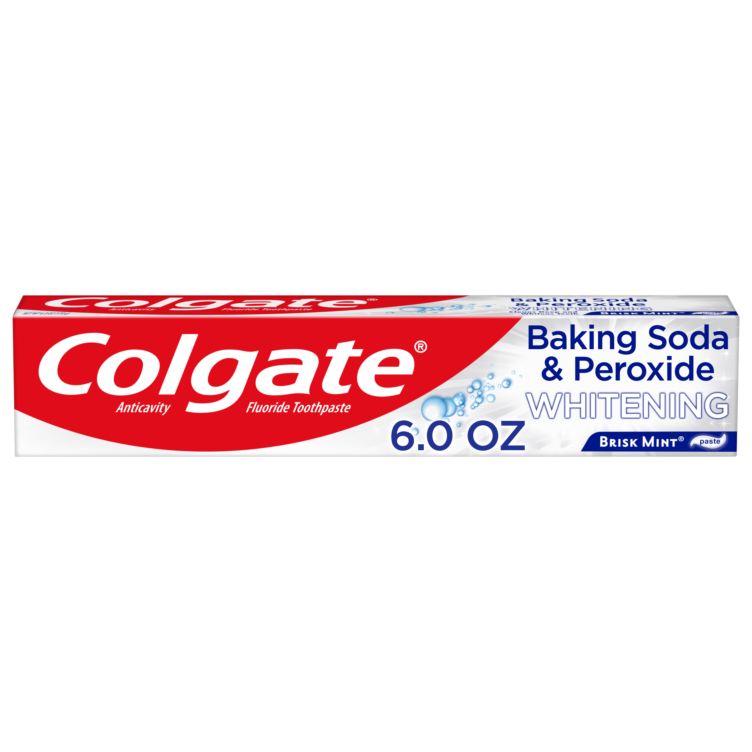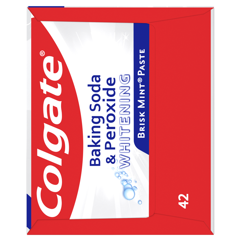 SKU 151087 Consumer Unit - GTIN 00035000510877 Case - GTIN 10035000510874 Product Category Oral Care Product Sub Category Toothpaste Product Equity (Brand) Colgate Product Sub Brand Colgate Baking Soda TP Product Title Colgate Baking Soda and Peroxide Whitening Toothpaste, Brisk Mint - 6 Ounce Product Description Colgate Baking Soda and Peroxide Whitening Toothpaste, Brisk Mint - 6 Ounce Colgate Baking Soda and Peroxide Whitening Toothpaste, Brisk Mint is a baking soda and peroxide toothpaste that refreshes and cleans teeth to give a bright, white and healthy smile. Formulated to prevent cavities and the build-up of tartar, this teeth whitening toothpaste also helps remove stains from teeth along with plaque and impurities with regular brushing. The unique baking soda and peroxide formula releases pure oxygen bubbles that deliver a deep clean as the mint flavor freshens breath. Healthy Smiles With Colgate At Colgate, we make toothpaste that promotes healthy smiles. Not only because having a healthy smile is important to your overall health, but because when you have a healthy smile, you actually smile more – and that’s a powerful thing. Smiles are the simplest form of optimism, something we need now more than ever. That’s why we’re committed to raising oral healthcare standards everywhere. eCommerce Copy- Long Description Colgate Baking Soda and Peroxide Whitening Toothpaste, Brisk Mint is a baking soda and peroxide toothpaste that refreshes and cleans teeth to give a bright, white and healthy smile. Formulated to prevent cavities and the build-up of tartar, this teeth whitening toothpaste also helps remove stains from teeth along with plaque and impurities with regular brushing. The unique baking soda and peroxide formula releases pure oxygen bubbles that deliver a deep clean as the mint flavor freshens breath. Bullet 1 Whitening toothpaste releases pure oxygen bubbles for a clean fresh sensation Bullet 2 Helps remove teeth stains Bullet 3 Cleans deep and whitens teeth Bullet 4 Fights cavities Bullet 5 Removes plaque and impurities with regular brushing Bullet 6 Freshens breath Bullet 7 Helps protect against cavities Bullet 8 Safely and effectively helps whiten teeth Active Ingredients Sodium Monofluorophosphate 0.76% (0.14% w/v fluoride ion) Walmart RPC 128228395 Walmart URL (Computed) https://www.walmart.com/ip/a/128228395 Albertsons RPC 960157164 Albertsons URL https://www.albertsons.com/shop/product-details.960157164.html CVS RPC 230888 Family Dollar RPC 907121