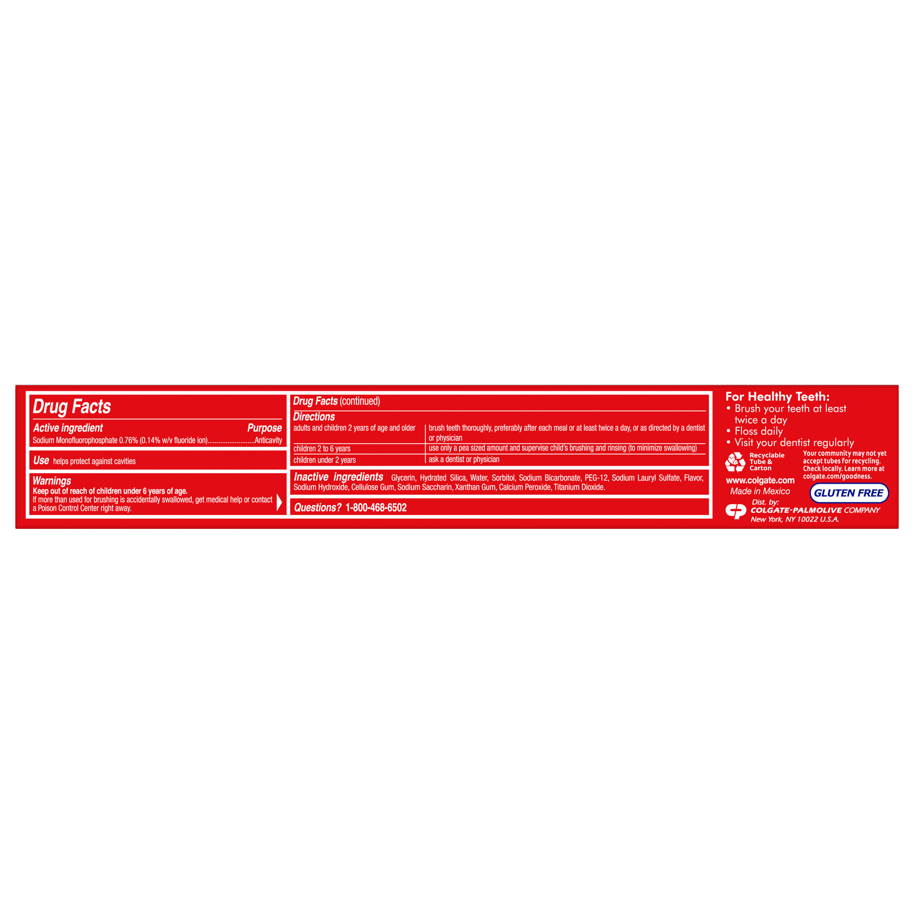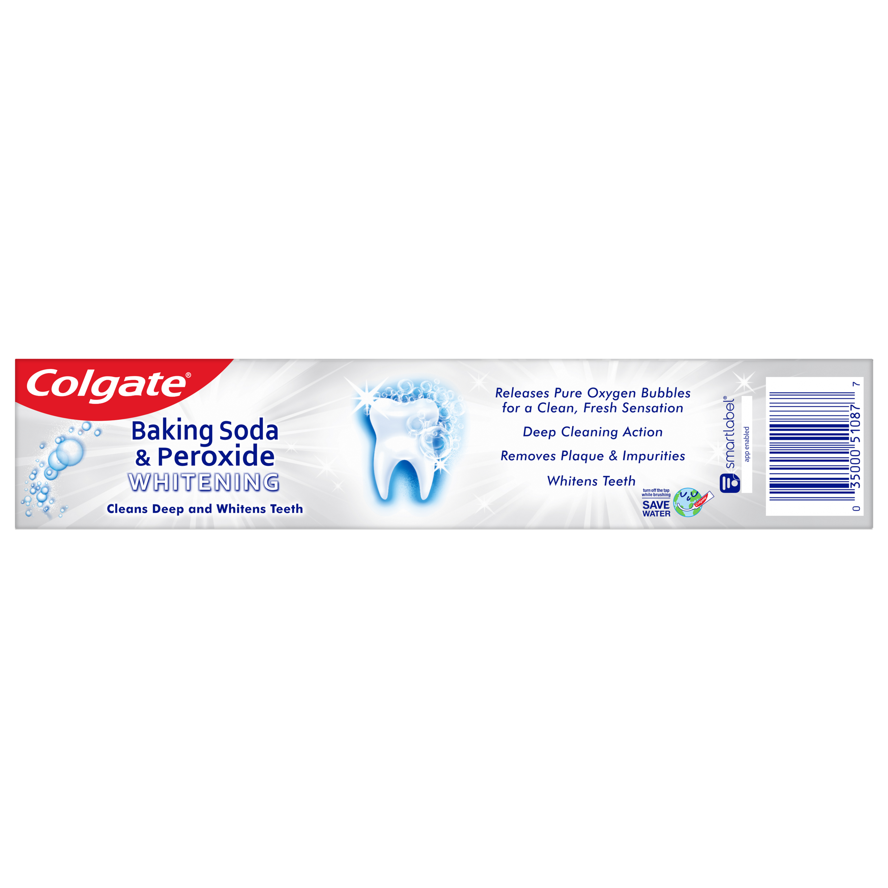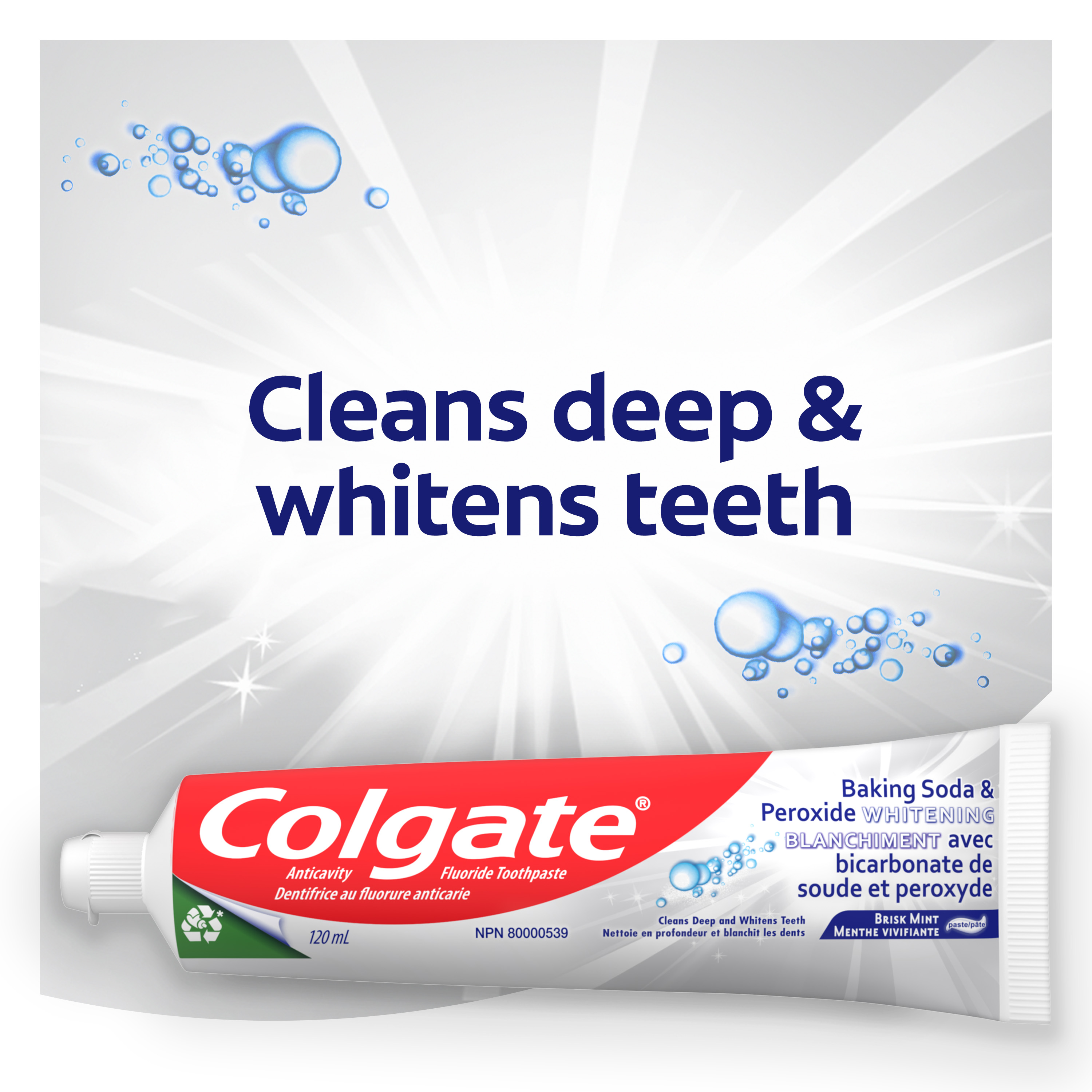 SKU 151087 Consumer Unit - GTIN 00035000510877 Case - GTIN 10035000510874 Product Category Oral Care Product Sub Category Toothpaste Product Equity (Brand) Colgate Product Sub Brand Colgate Baking Soda TP Product Title Colgate Baking Soda and Peroxide Whitening Toothpaste, Brisk Mint - 6 Ounce Product Description Colgate Baking Soda and Peroxide Whitening Toothpaste, Brisk Mint - 6 Ounce Colgate Baking Soda and Peroxide Whitening Toothpaste, Brisk Mint is a baking soda and peroxide toothpaste that refreshes and cleans teeth to give a bright, white and healthy smile. Formulated to prevent cavities and the build-up of tartar, this teeth whitening toothpaste also helps remove stains from teeth along with plaque and impurities with regular brushing. The unique baking soda and peroxide formula releases pure oxygen bubbles that deliver a deep clean as the mint flavor freshens breath. Healthy Smiles With Colgate At Colgate, we make toothpaste that promotes healthy smiles. Not only because having a healthy smile is important to your overall health, but because when you have a healthy smile, you actually smile more – and that’s a powerful thing. Smiles are the simplest form of optimism, something we need now more than ever. That’s why we’re committed to raising oral healthcare standards everywhere. eCommerce Copy- Long Description Colgate Baking Soda and Peroxide Whitening Toothpaste, Brisk Mint is a baking soda and peroxide toothpaste that refreshes and cleans teeth to give a bright, white and healthy smile. Formulated to prevent cavities and the build-up of tartar, this teeth whitening toothpaste also helps remove stains from teeth along with plaque and impurities with regular brushing. The unique baking soda and peroxide formula releases pure oxygen bubbles that deliver a deep clean as the mint flavor freshens breath. Bullet 1 Whitening toothpaste releases pure oxygen bubbles for a clean fresh sensation Bullet 2 Helps remove teeth stains Bullet 3 Cleans deep and whitens teeth Bullet 4 Fights cavities Bullet 5 Removes plaque and impurities with regular brushing Bullet 6 Freshens breath Bullet 7 Helps protect against cavities Bullet 8 Safely and effectively helps whiten teeth Active Ingredients Sodium Monofluorophosphate 0.76% (0.14% w/v fluoride ion) Walmart RPC 128228395 Walmart URL (Computed) https://www.walmart.com/ip/a/128228395 Albertsons RPC 960157164 Albertsons URL https://www.albertsons.com/shop/product-details.960157164.html CVS RPC 230888 Family Dollar RPC 907121