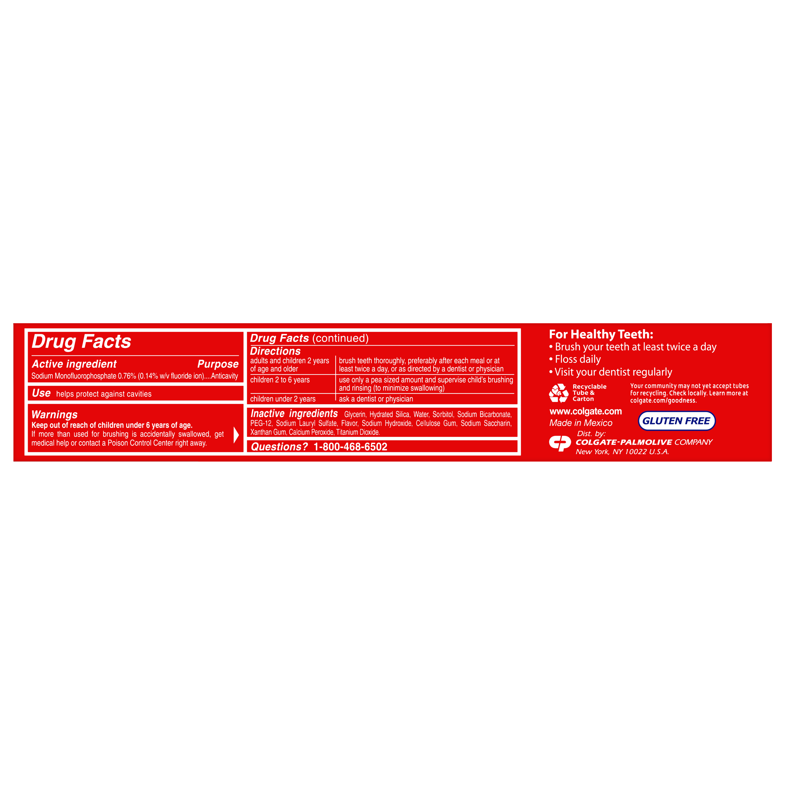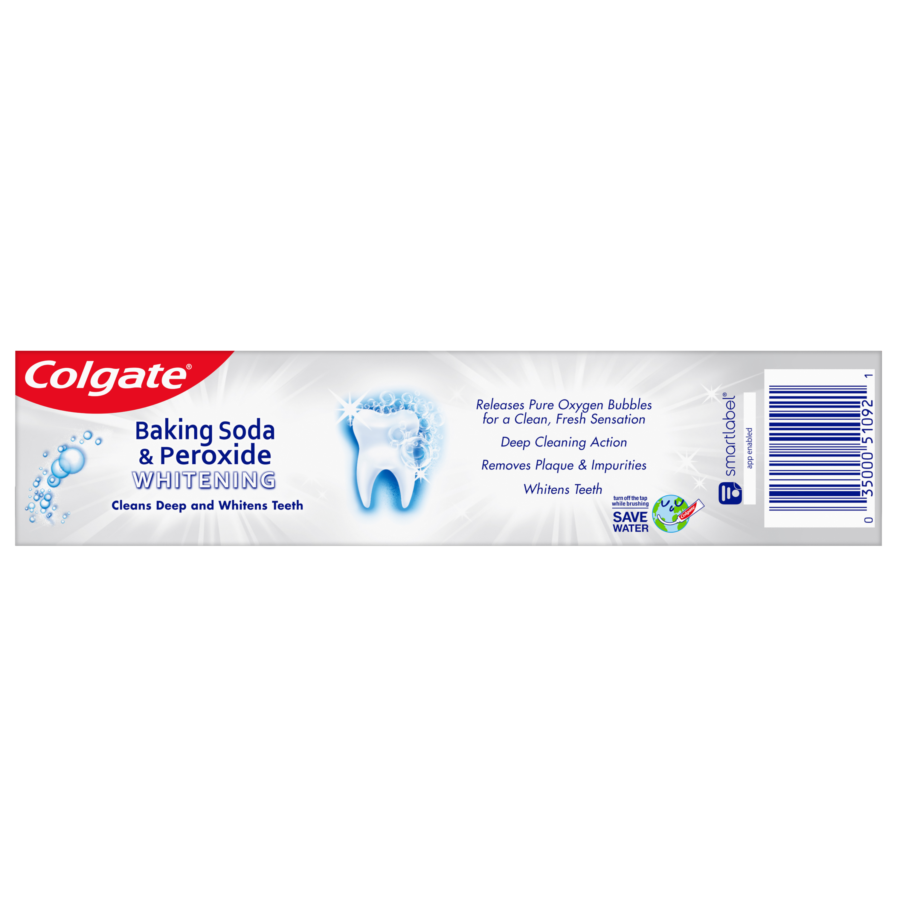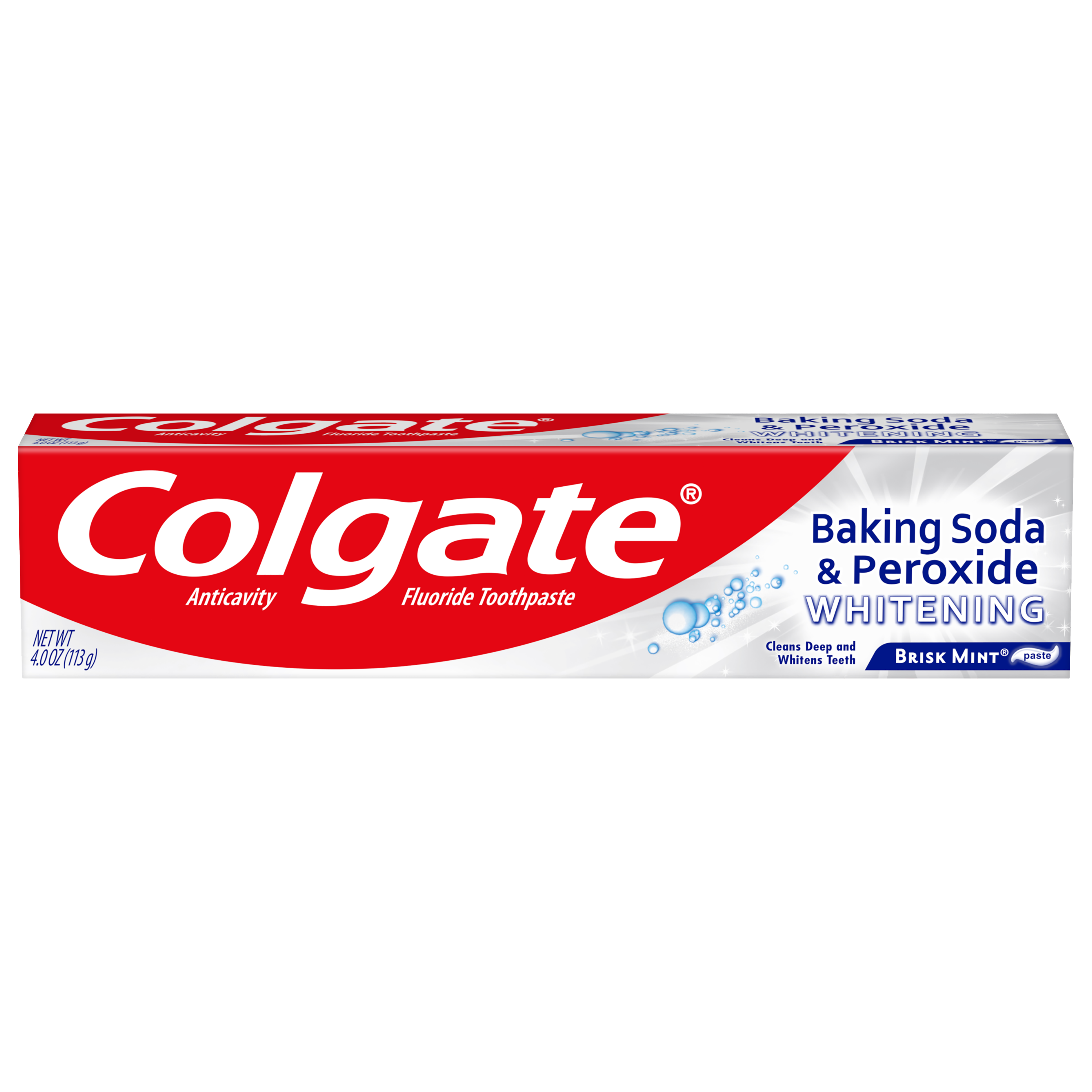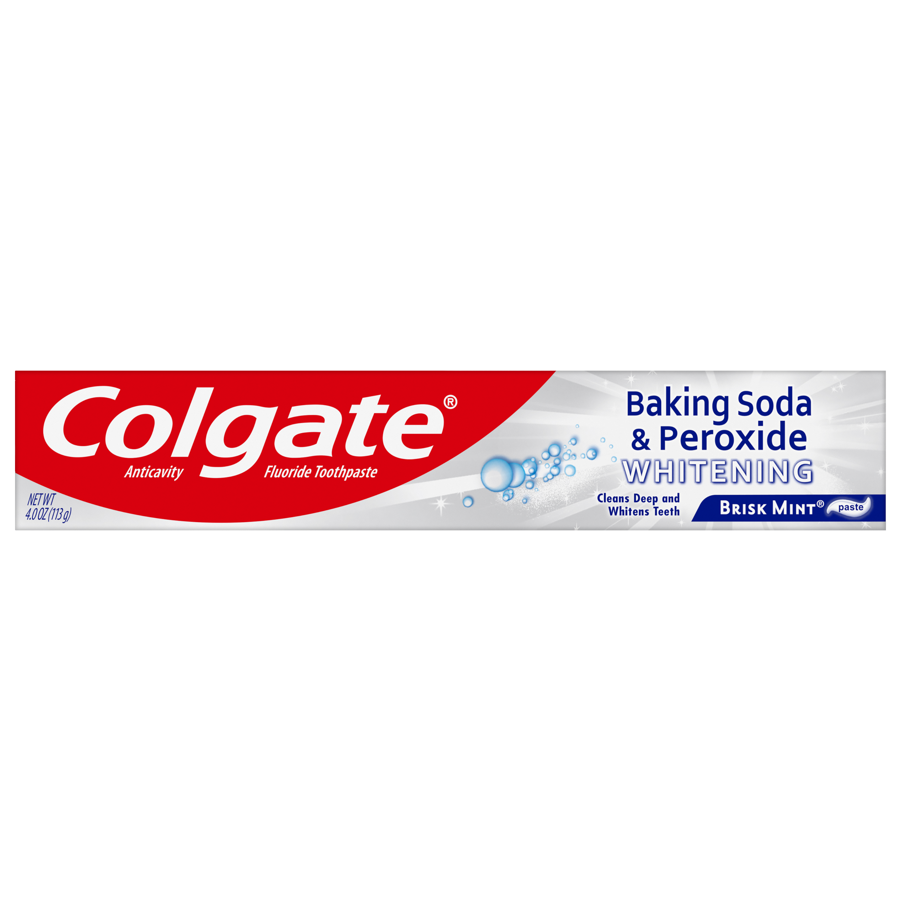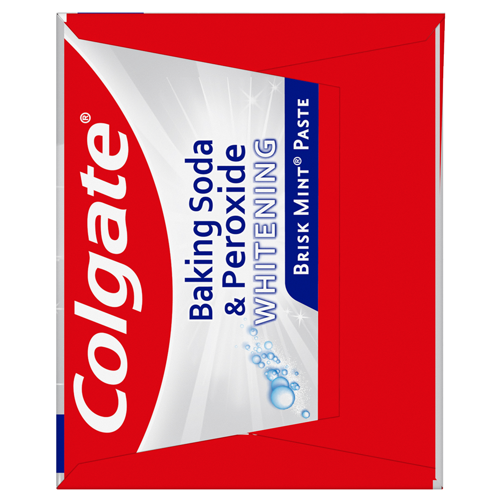SKU 151092 Consumer Unit - GTIN 00035000510921 Case - GTIN 10035000510928 Product Category Oral Care Product Sub Category Toothpaste Product Equity (Brand) Colgate Product Sub Brand Colgate Baking Soda TP Product Title Colgate Baking Soda and Peroxide Whitening Toothpaste, Brisk Mint - 4.0 Ounce Product Description Colgate Baking Soda and Peroxide Whitening Toothpaste, with a great Brisk Mint flavor, refreshes & cleans for whiter teeth. This whitening toothpaste cleans deep, preventing cavities and the build-up of tartar. Our unique formula releases pure oxygen bubbles every time you brush your teeth for a clean, fresh sensation. This baking soda and peroxide whitening toothpaste has a Brisk Mint flavor that freshens breath. eCommerce Copy- Long Description Colgate Baking Soda and Peroxide Whitening Toothpaste, with a great Brisk Mint flavor, refreshes & cleans for whiter teeth. This whitening toothpaste cleans deep, preventing cavities and the build-up of tartar. Our unique formula releases pure oxygen bubbles every time you brush your teeth for a clean, fresh sensation. This baking soda and peroxide whitening toothpaste has a Brisk Mint flavor that freshens breath. Bullet 1 Whitening toothpaste releases pure oxygen bubbles for a clean fresh sensation Bullet 2 Helps remove teeth stains Bullet 3 Cleans deep and whitens teeth Bullet 4 Fights cavities Bullet 5 Removes plaque and impurities Bullet 6 Long lasting cooling effect Active Ingredients Sodium Monofluorophosphate 0.76% (0.14% w/v fluoride ion) Albertsons RPC 960157166 Albertsons URL https://www.albertsons.com/shop/product-details.960157166.html CVS RPC 727563